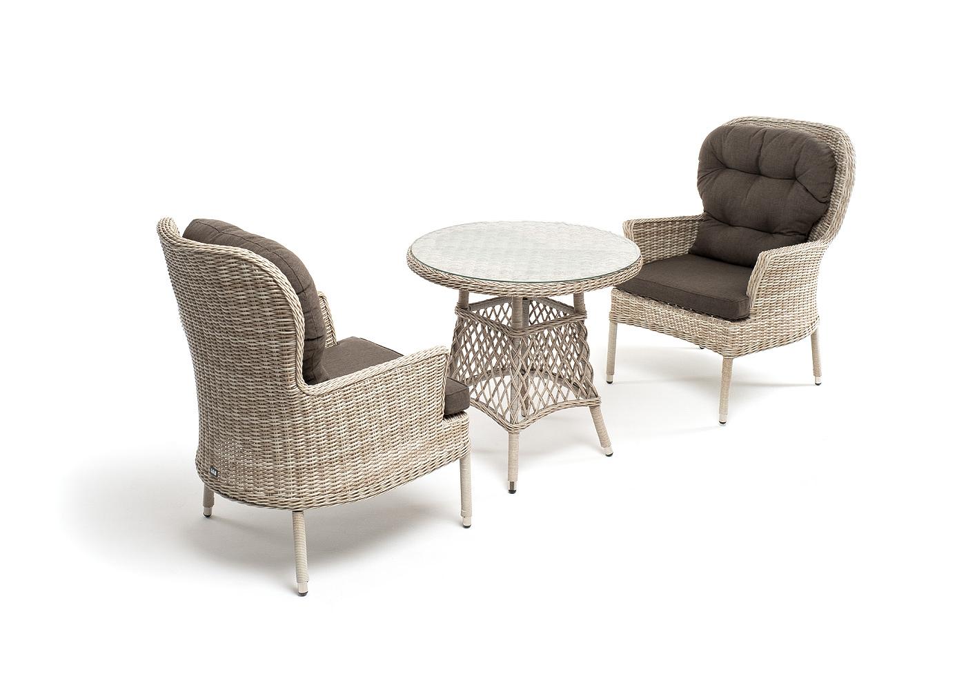 Плетение выполнено вручную круглым искусственным ротангом бежевого цвета, кресло укомплектовано подушками из 100% полиэстера, которые пропитаны специальным составом, обладающим влаго "Эспрессо" плетеный круглый стол, диаметр 80 см, цвет бежевый 1шт. 800Х800Х750, "Алиса" кресло плетеное, цвет бежевый с подушками 2шт. 710Х820Х1 105,