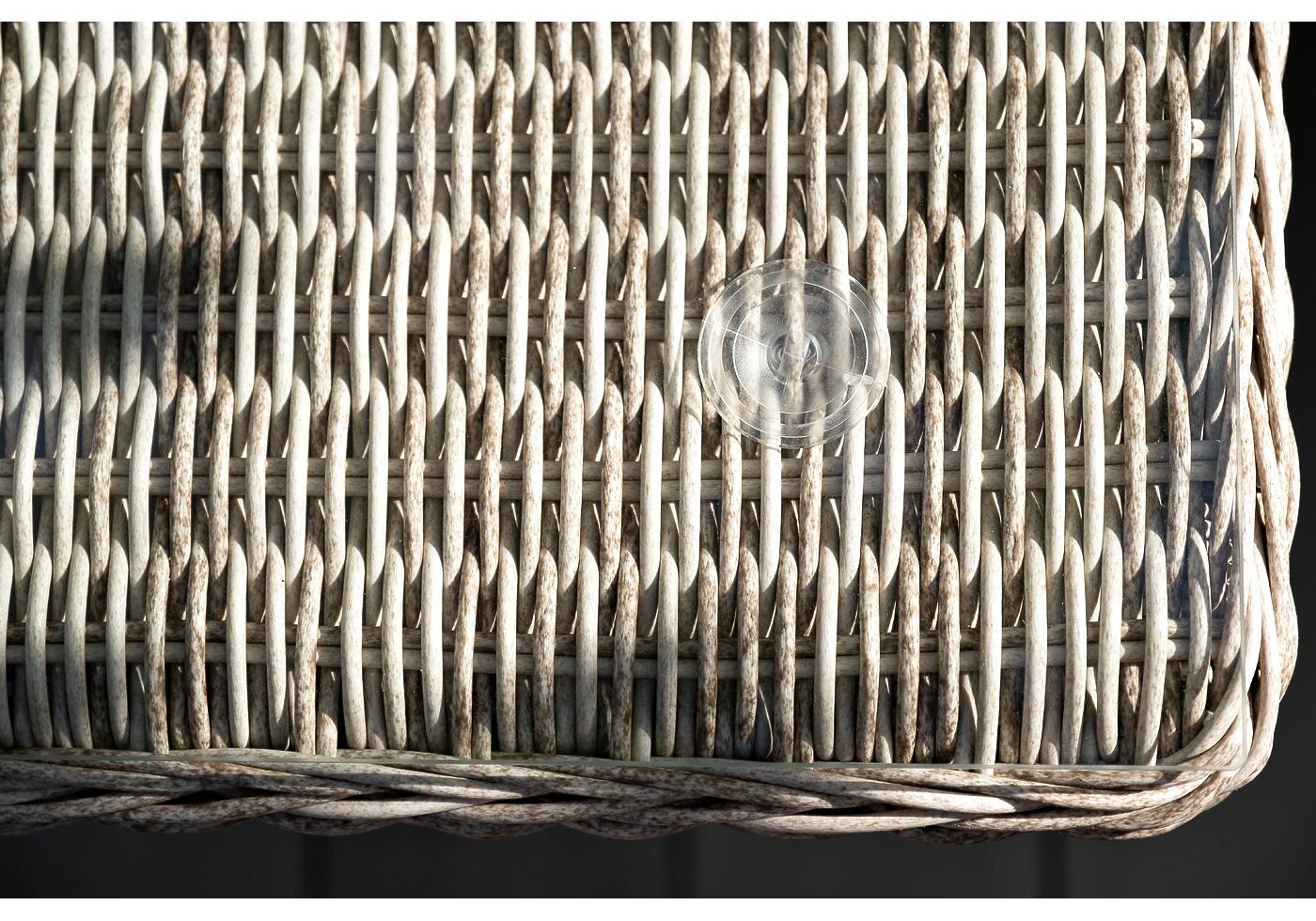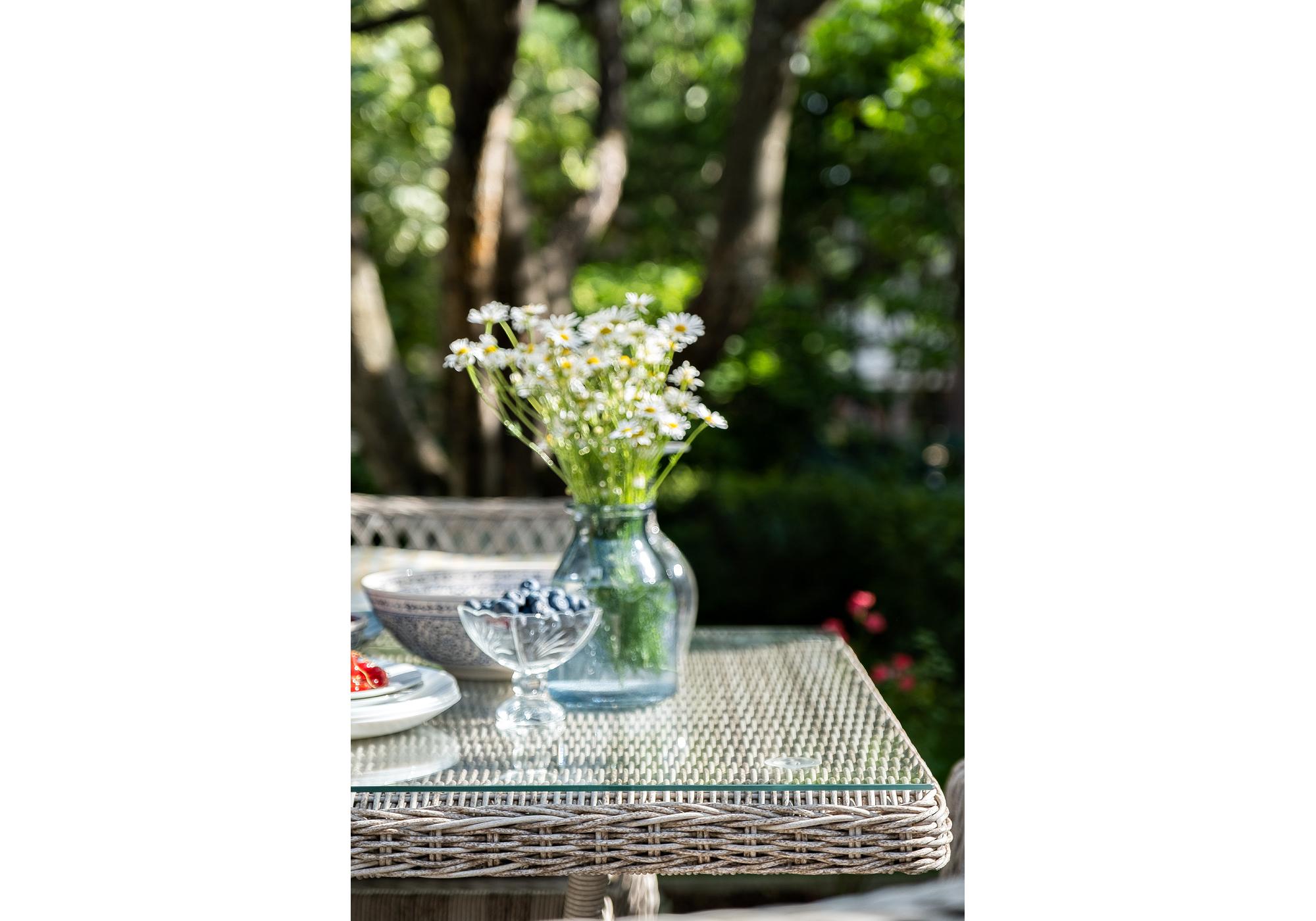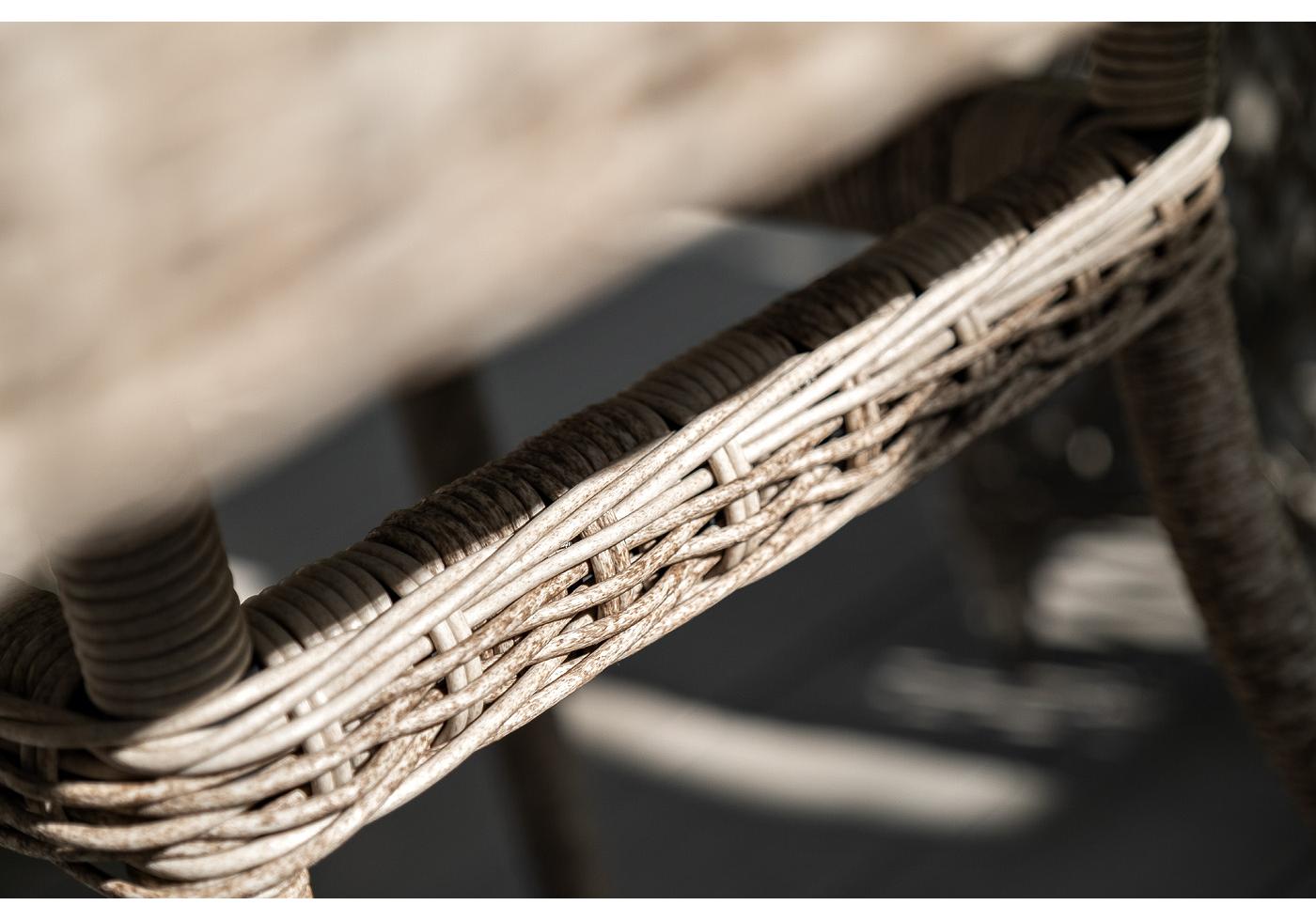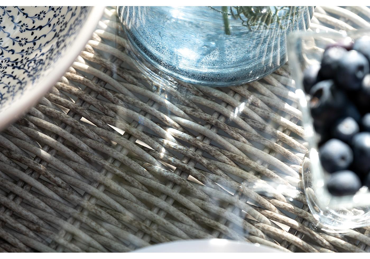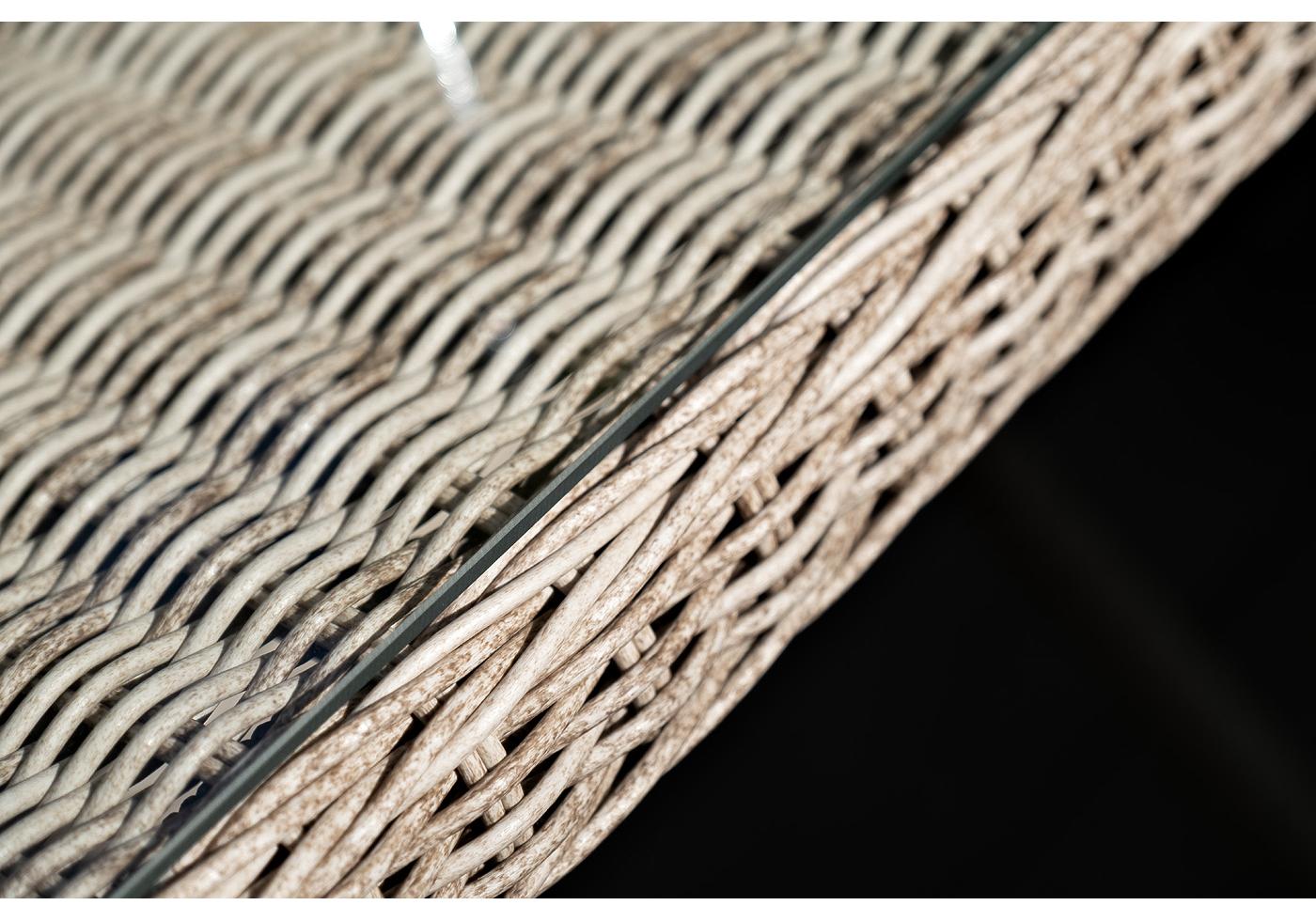 Каркас мебели выполнен из прочного и легкого алюминия, оплетенного вручную искусственным ротангом бежевого цвета, столешница – закаленное стекло.