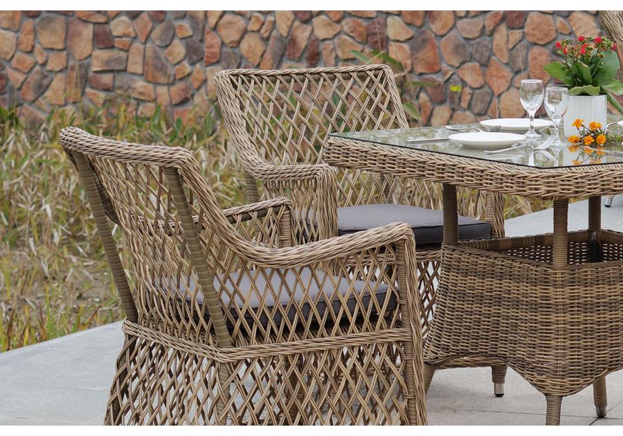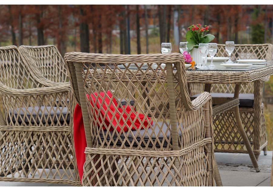 Каркас мебели выполнен из прочного и легкого алюминия, оплетенного вручную долговечным искусственным ротангом натурального соломенного цвета, столешница – прочное стекло.
