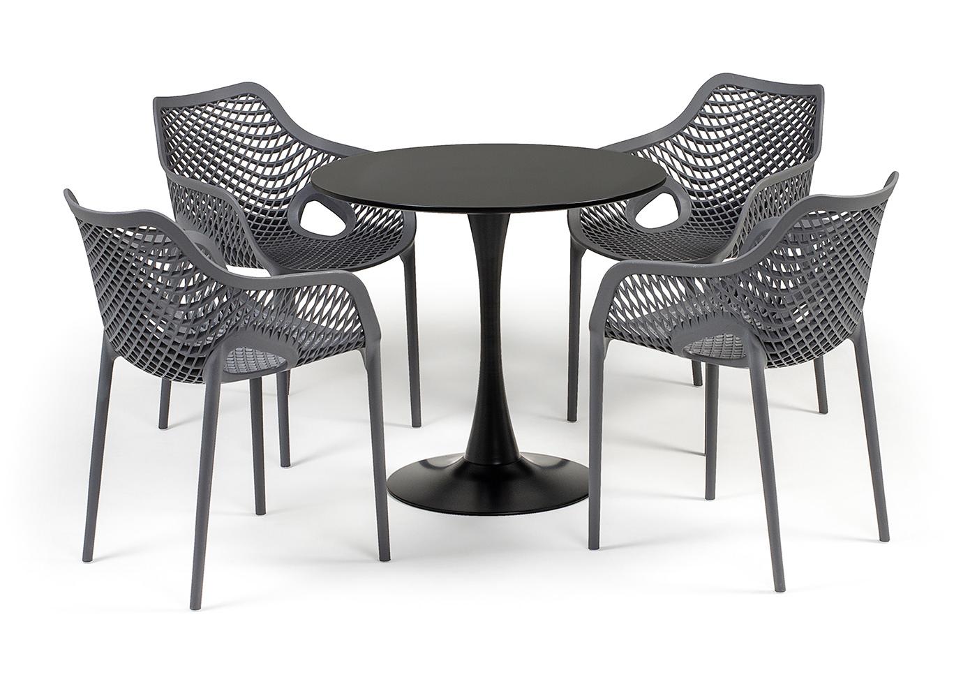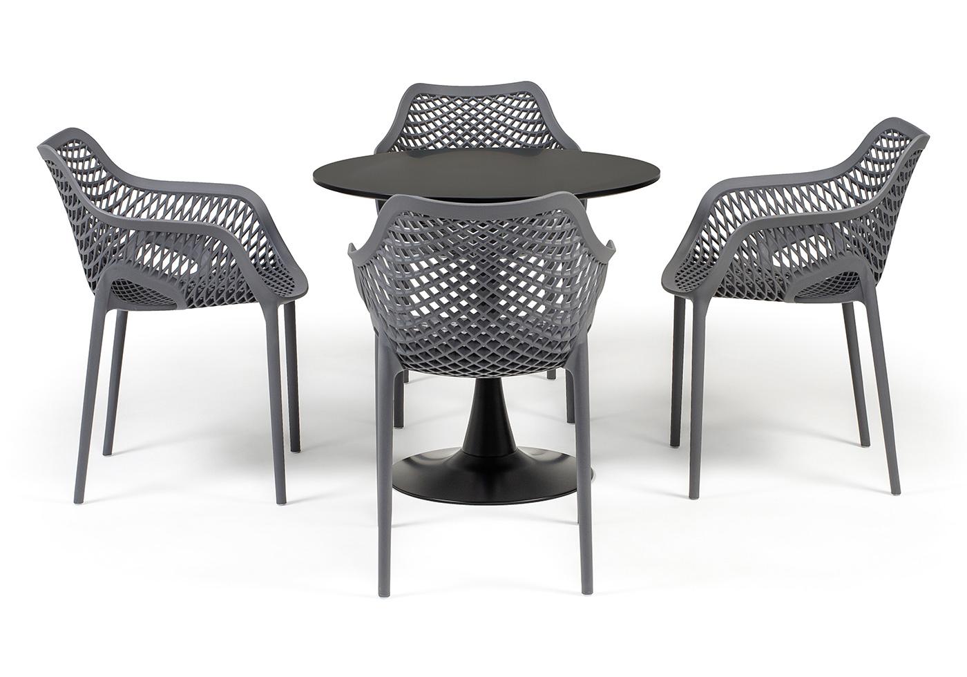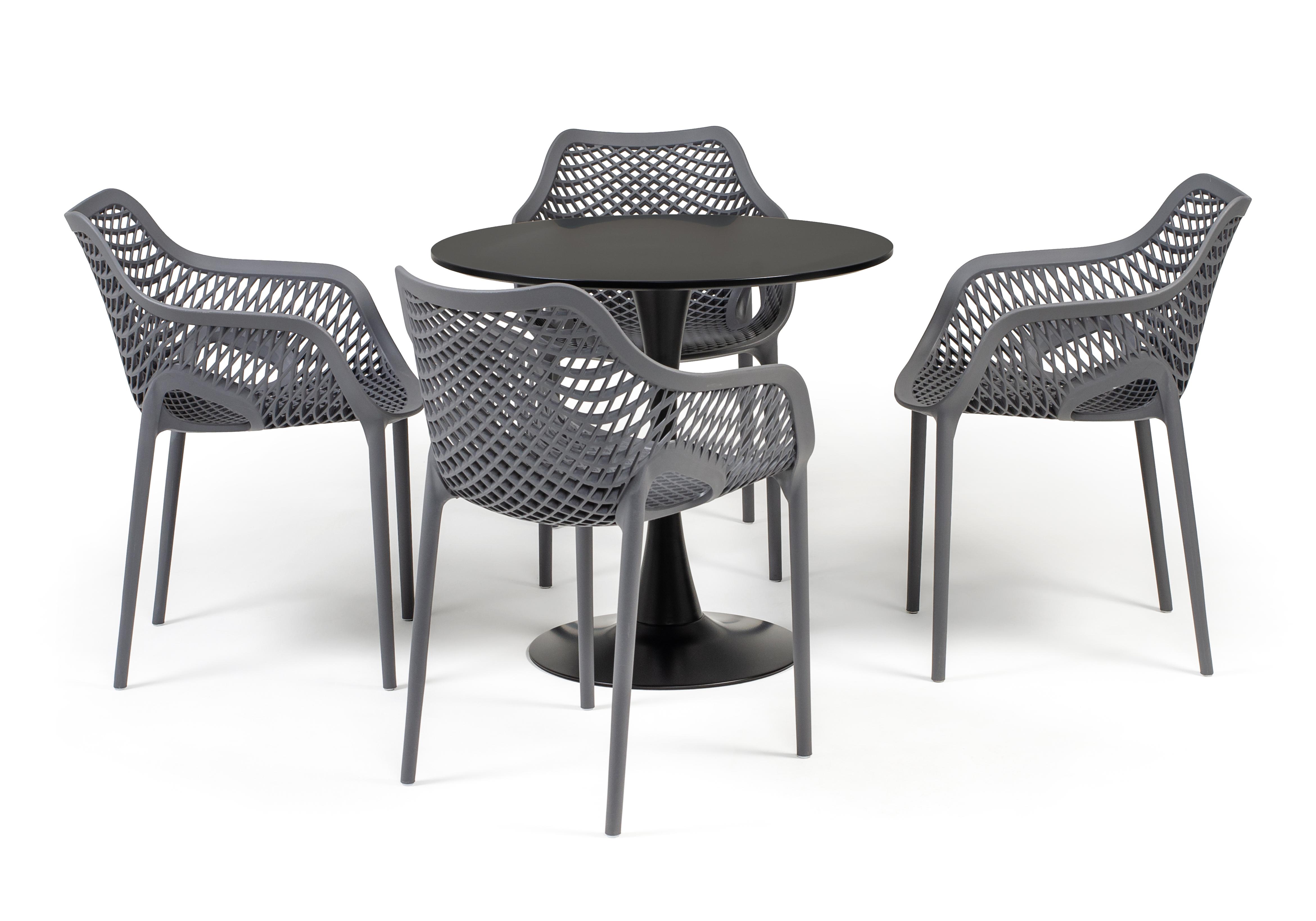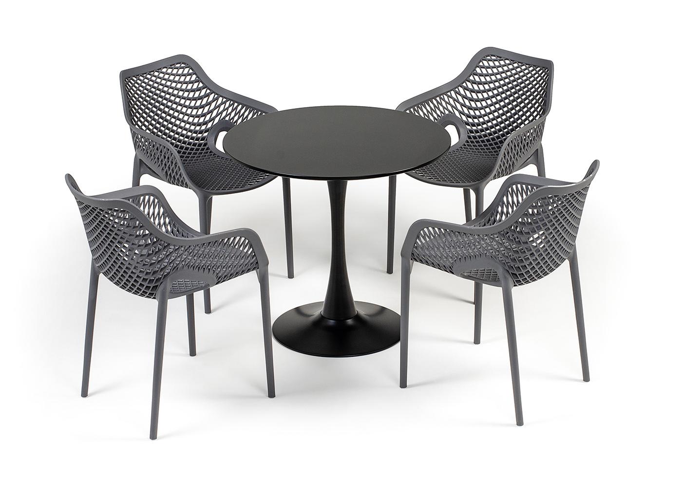 Стулья изготовлены из полипропилена, прочного и стойкого пластика, устойчивого к УФ-излучению, благодаря этому стул сохраняет свой первоначальный вид и не выцветает на солнце даже несмотря на активную эксплуат "Беллини" пластиковый круглый стол Ø80см, цвет темно-серый 1шт. 800Х800Х750, "Беллини" стул пластиковый, цвет темно-серый 4шт. 540Х610Х810,