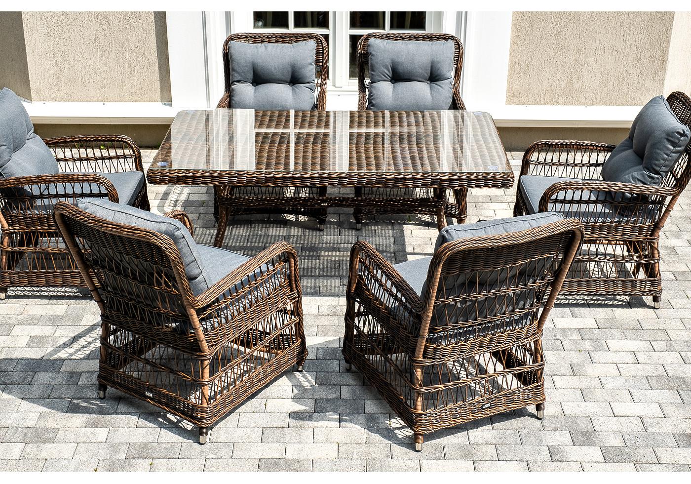 Садовая обеденная группа на 6 персон «Цесена» из ротанга. В комплекте: большой прямоугольный обеденный стол (1600×900×750 мм) и 6 кресел (600×800×910 мм).