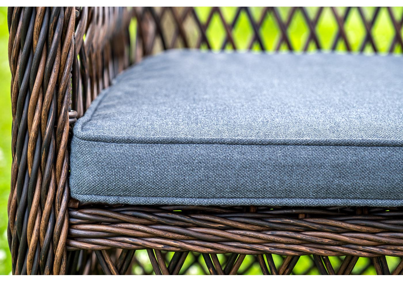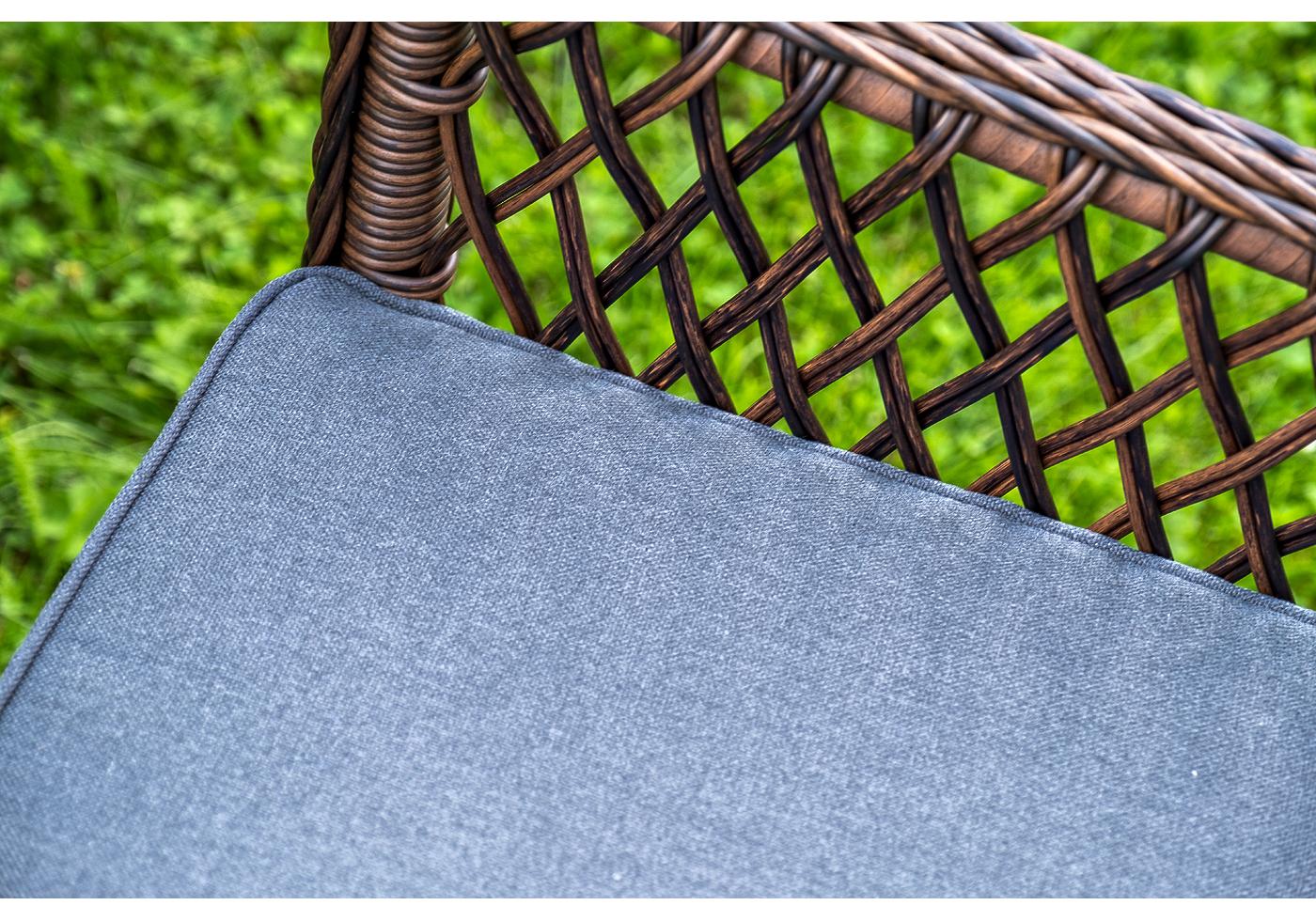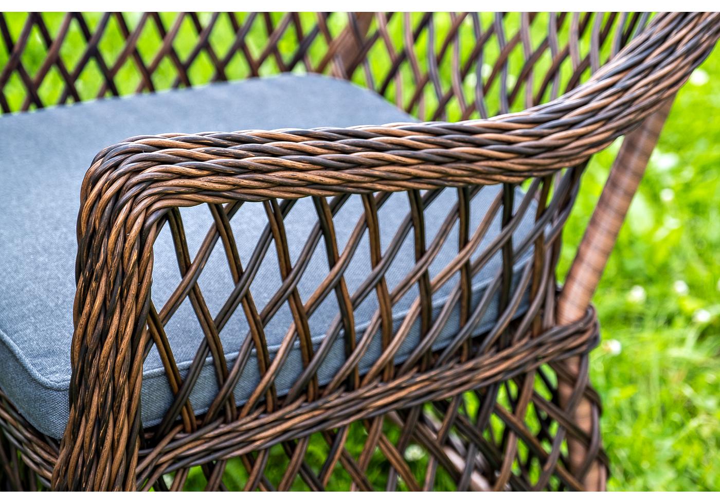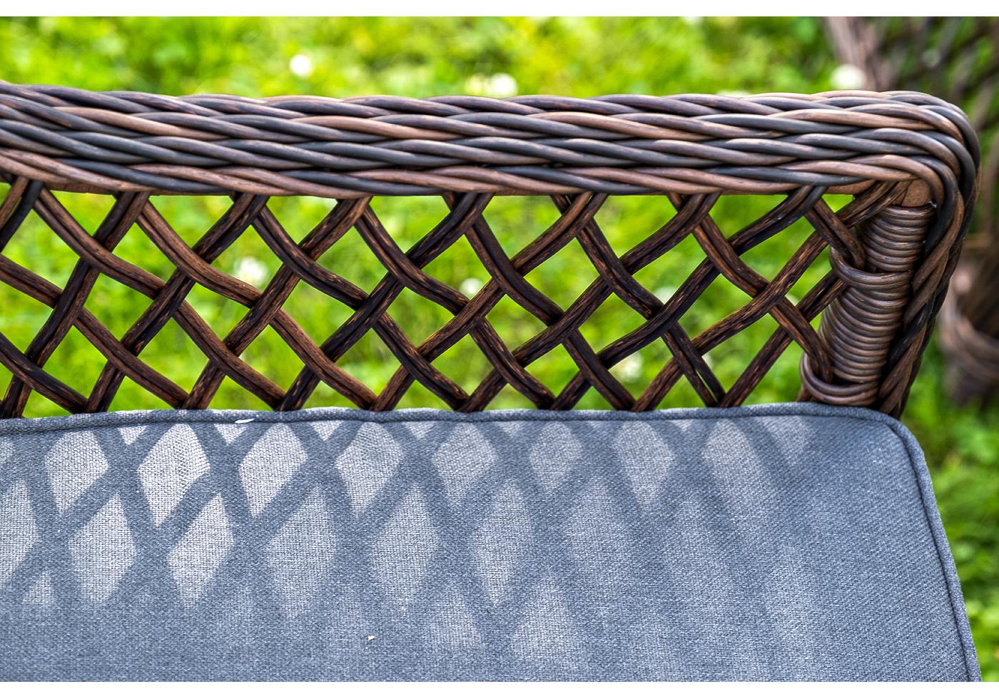 Каркас мебели выполнен из прочного и легкого алюминия, вручную оплетенного круглым синтетическим ротангом натурального коричневого оттенка. На креслах предусмотрены мягкие подушки со съёмными чехлами серого цвета.