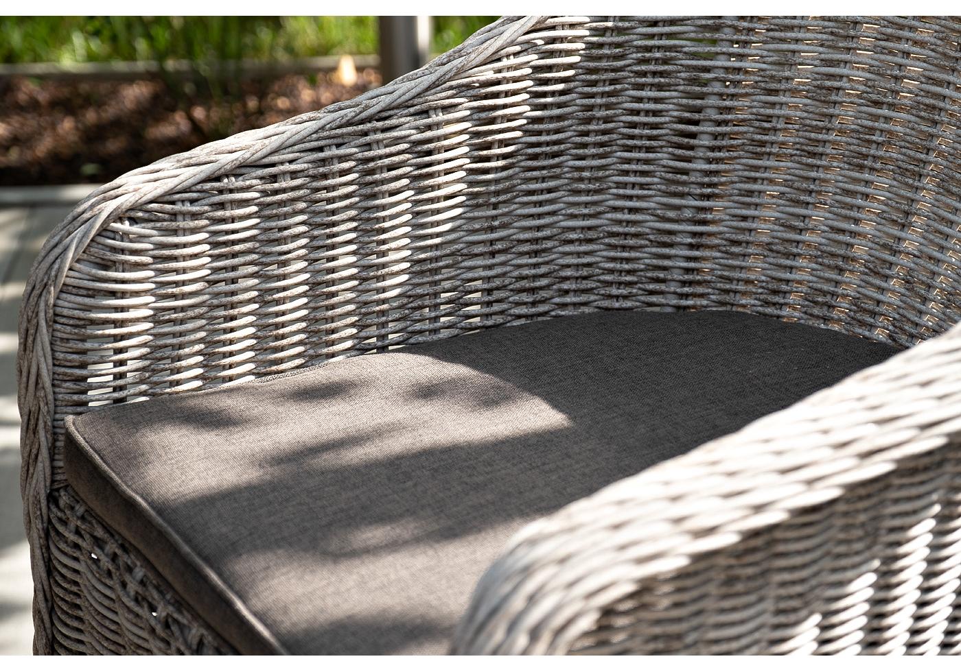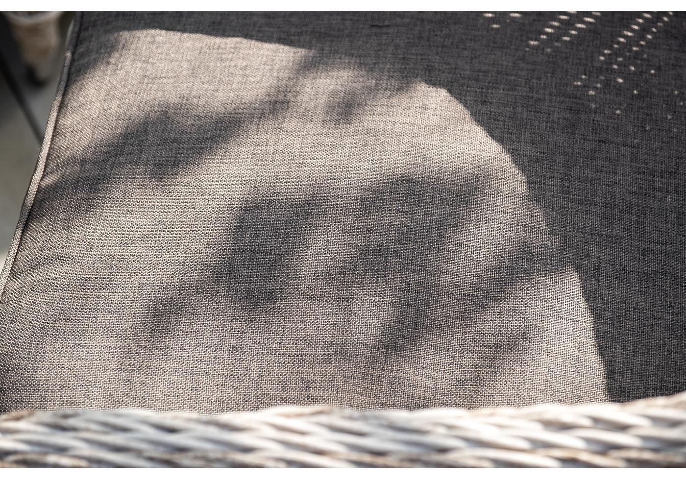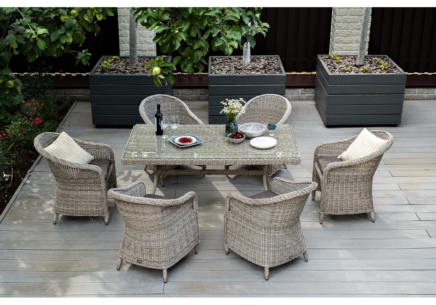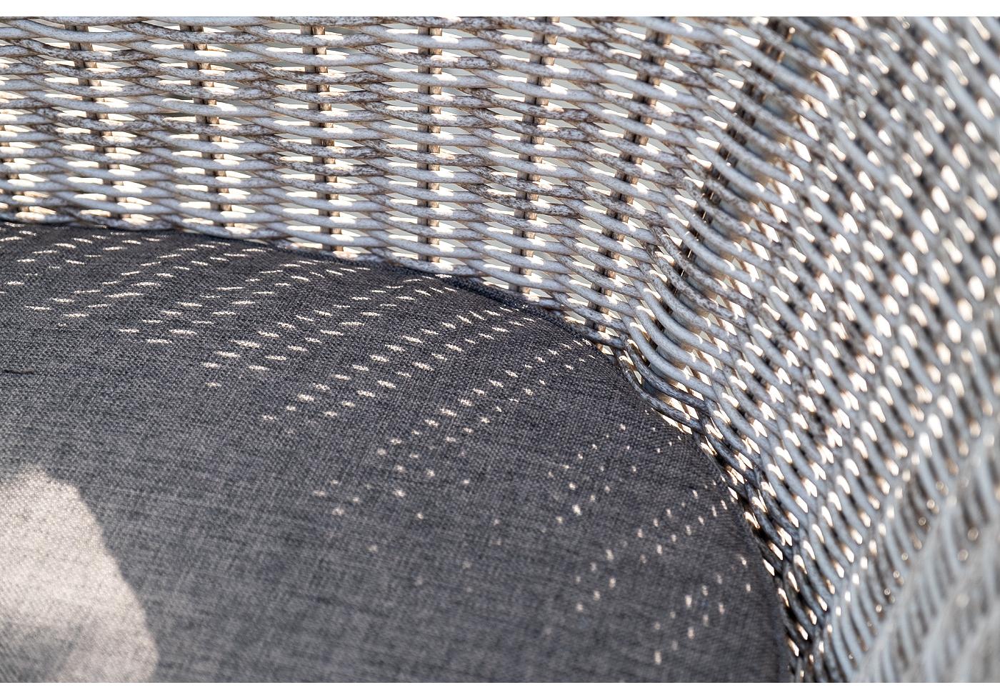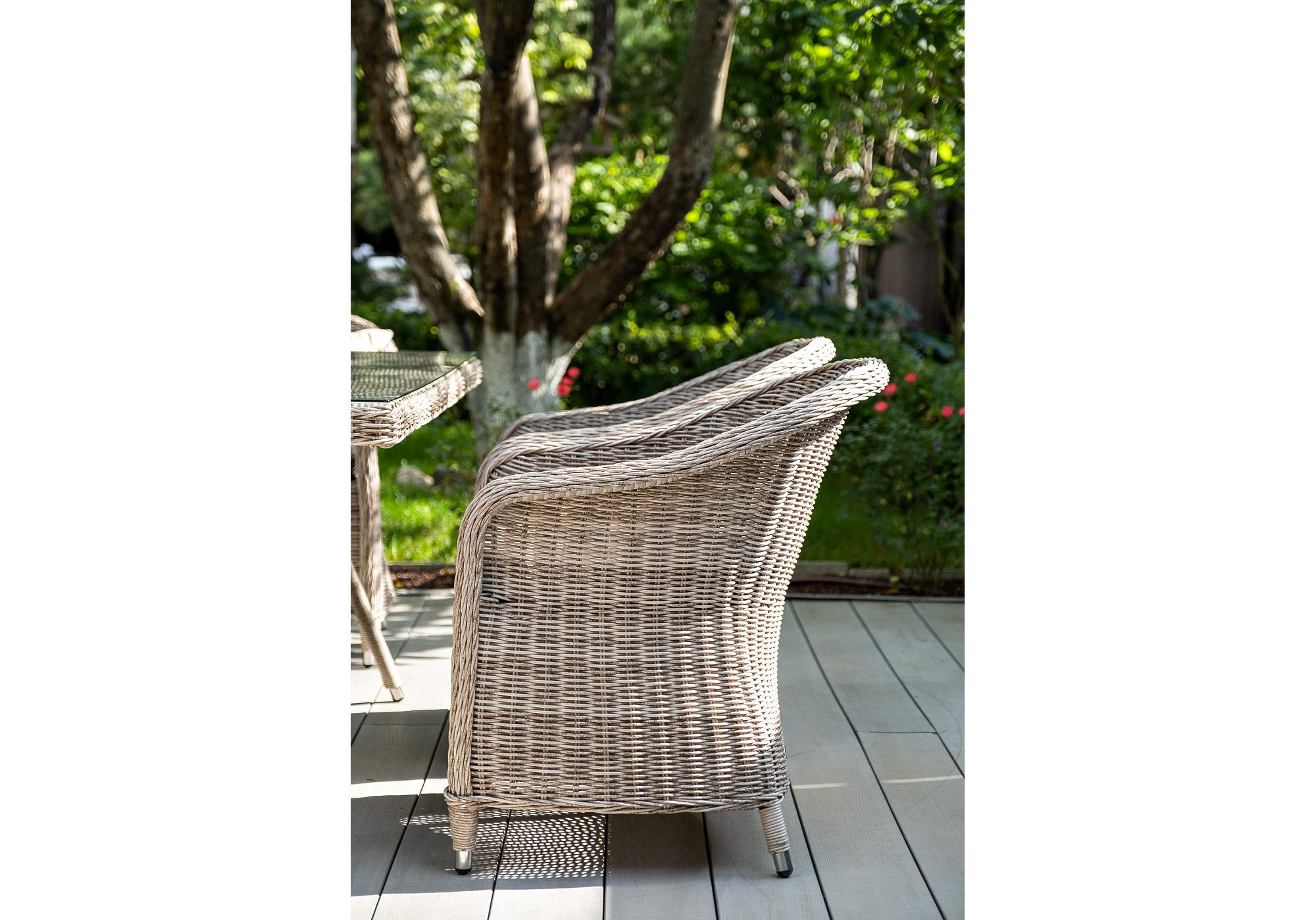 Каркас всех предметов мебели изготовлен из легкого и прочного алюминия, оплетенного вручную искусственным ротангом. Стол для удобства использования накрыт прочным стеклом, кресла укомплектованы подушками со съёмными чехлами серого цвета.