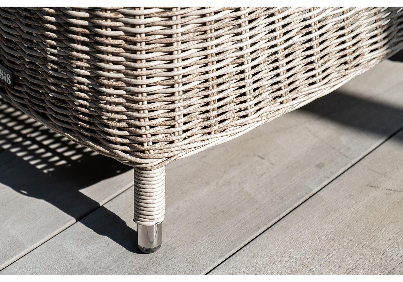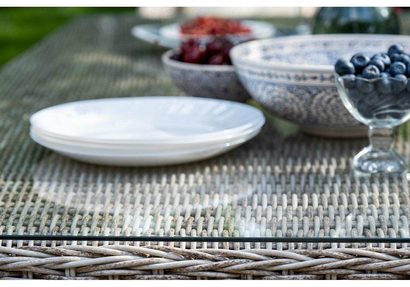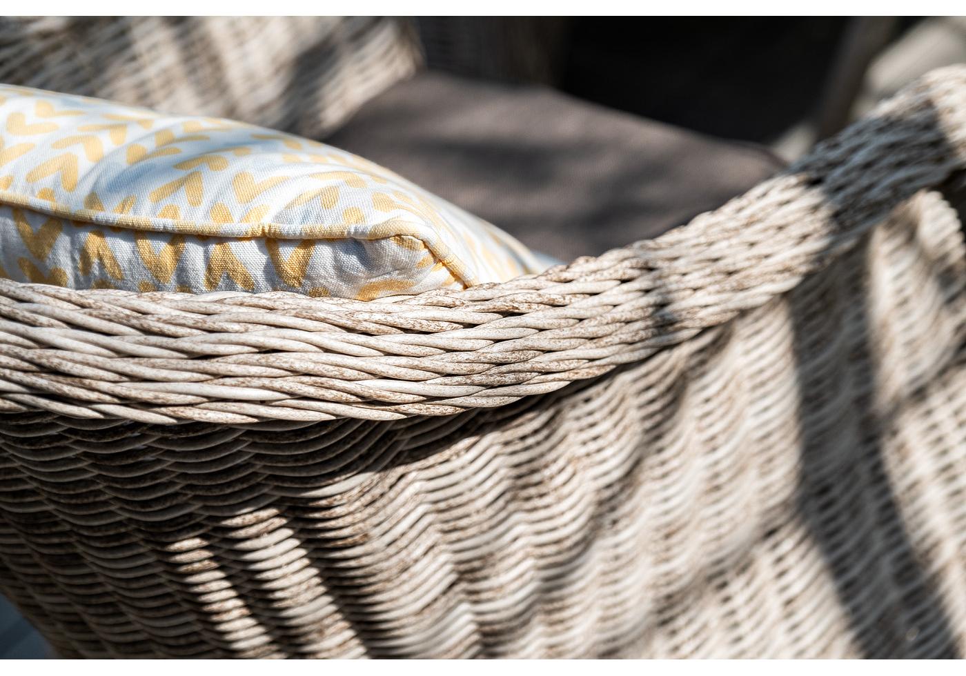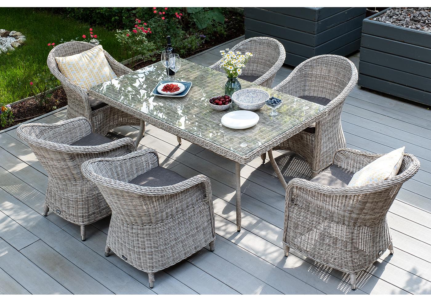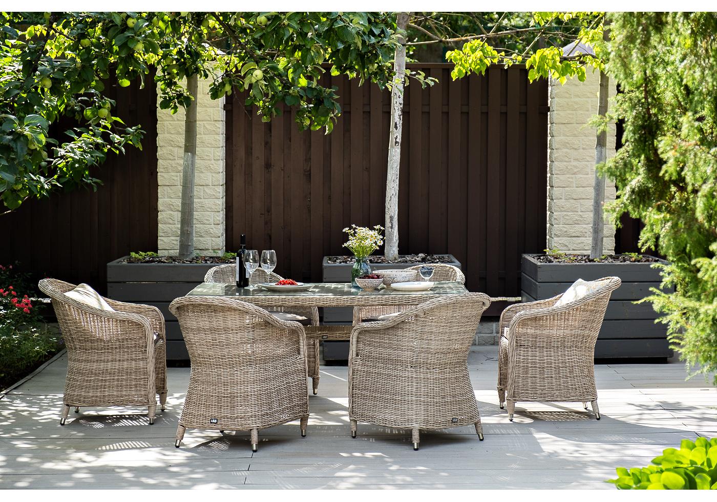 Каркас всех предметов мебели изготовлен из легкого и прочного алюминия, оплетенного вручную искусственным ротангом. Стол для удобства использования накрыт прочным стеклом, кресла укомплектованы подушками со съёмными чехлами серого цвета.