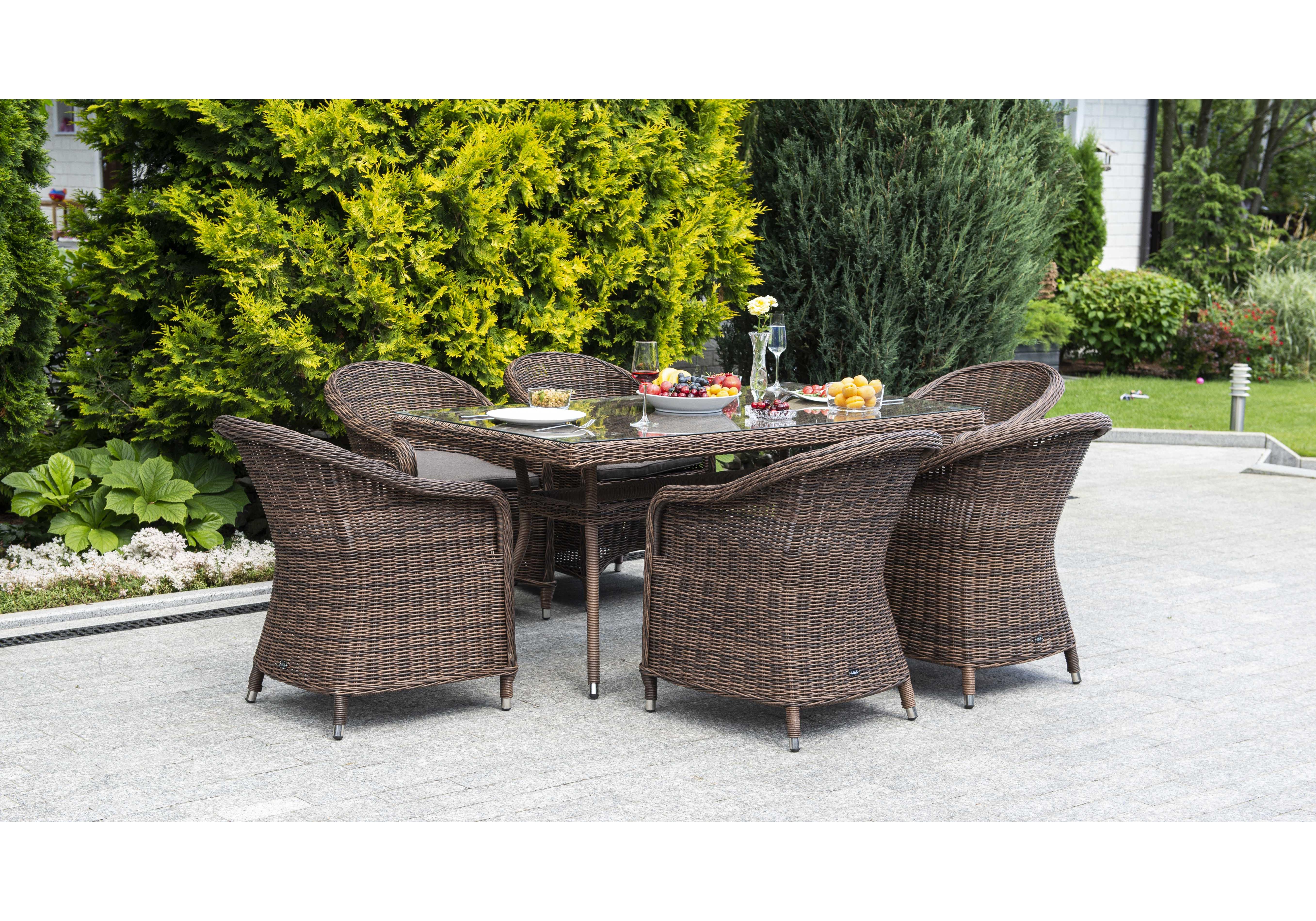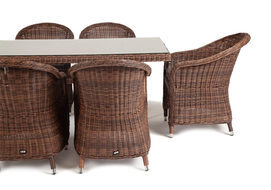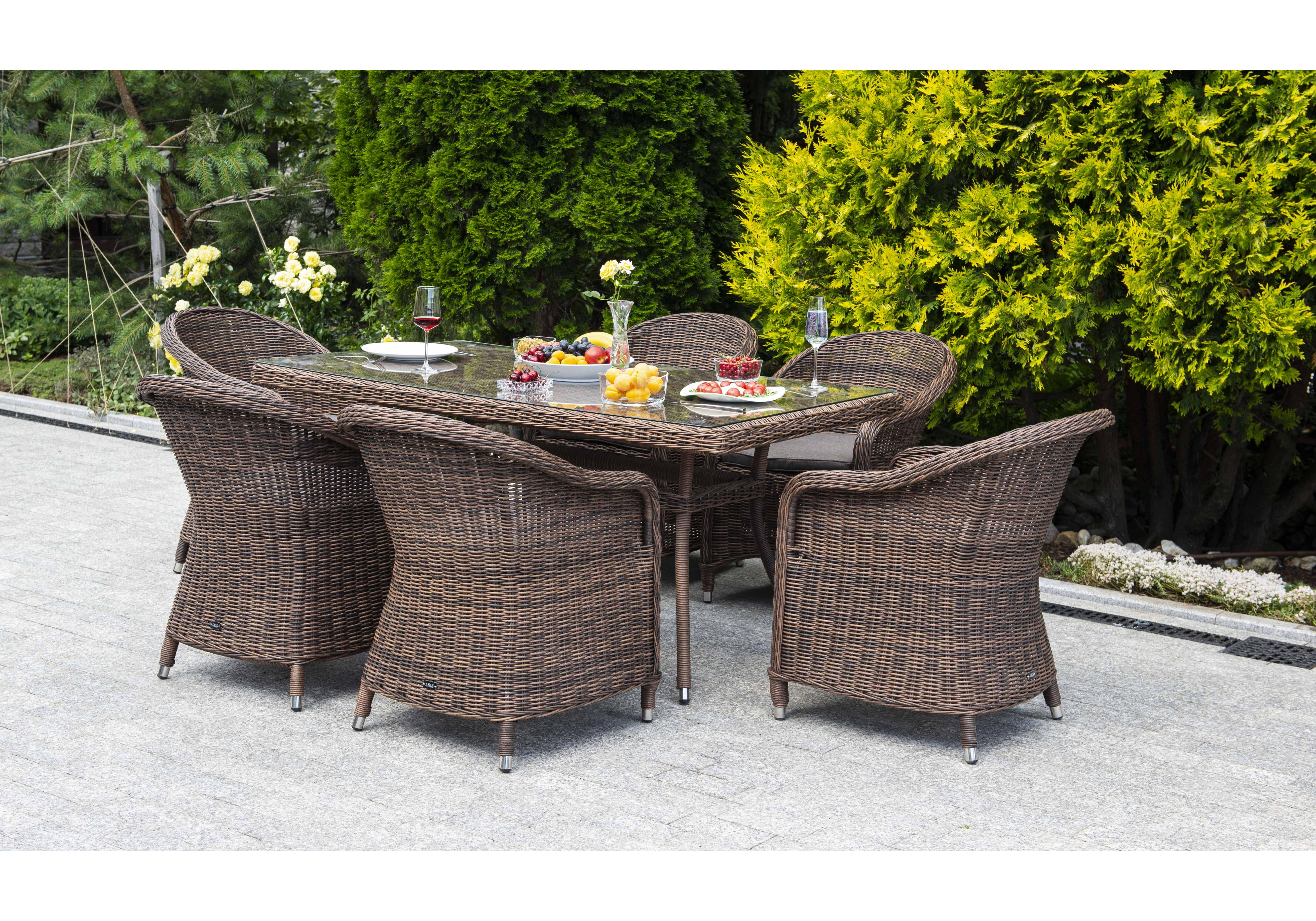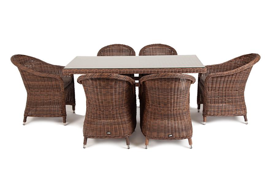 Каркас всех предметов мебели изготовлен из легкого и прочного алюминия, оплетенного вручную долговечным искусственным ротангом. Стол для удобства использования накрыт прочным стеклом, кресла укомплектованы подушками со съёмными чехлами серого цвета "Латте" плетеный стол из искусственного ротанга 160х90см, цвет коричневый 1шт. 1 600Х900Х750, "Равенна" плетеное кресло из искусственного ротанга, цвет коричневый 6шт. 570Х680Х810,