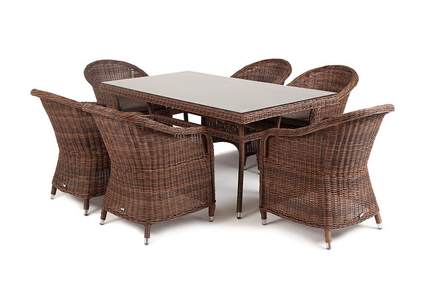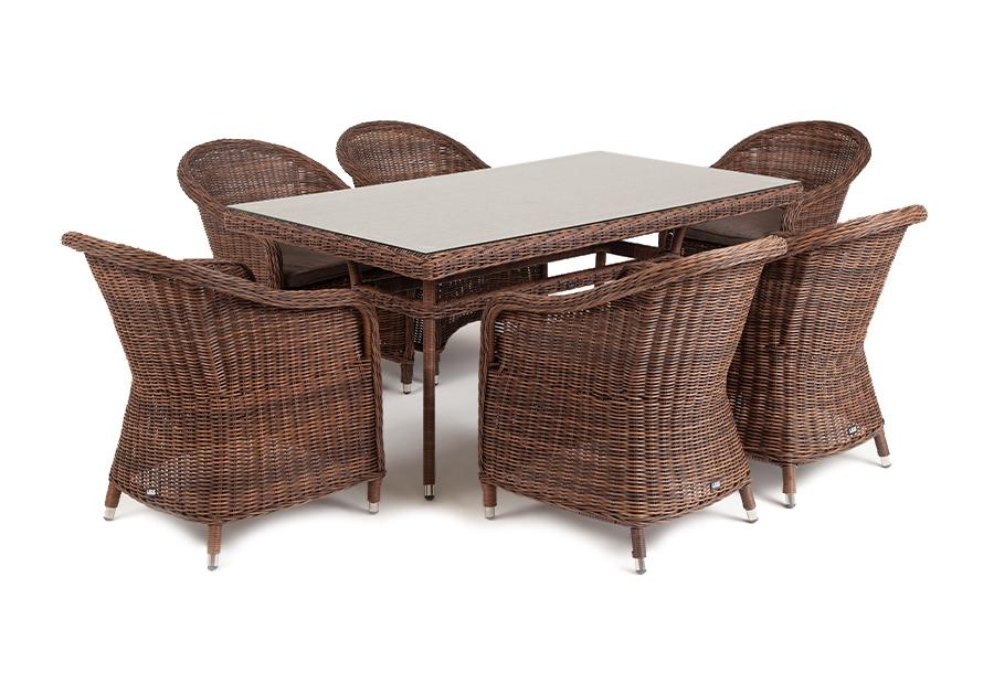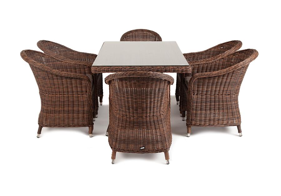 Премиальная обеденная группа для сада, веранды ресторана «Эспрессо» для большой компании. В набор входит большой прямоугольный стол «Латте», размером - 1600×900×750 мм и 6 кресел «Равенна», размер - 570×680×810 мм, в насыщенном коричневом оттенке.