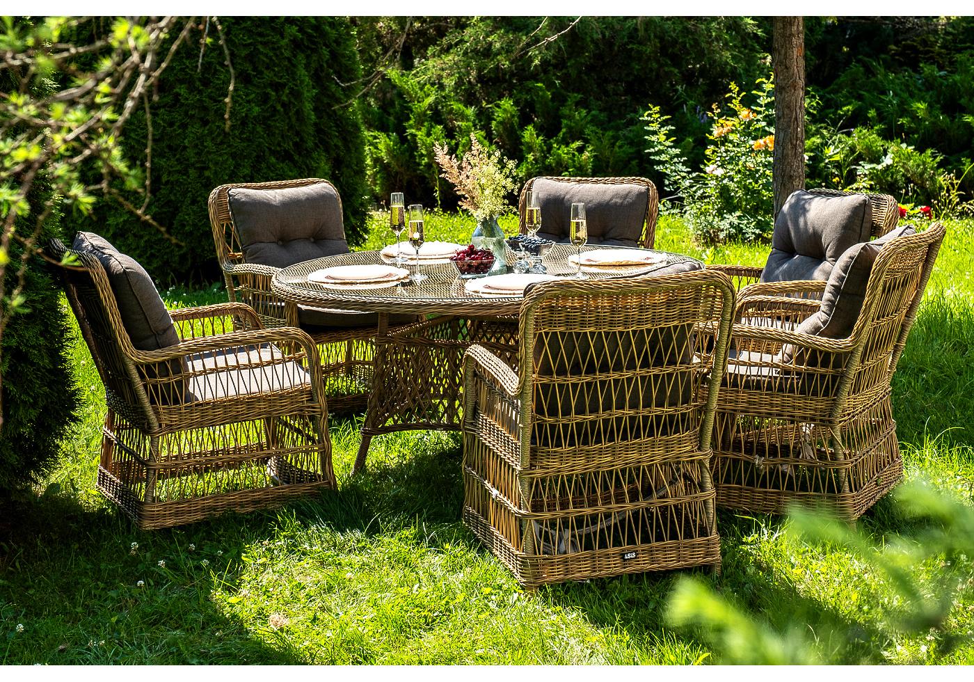 Обеденная группа на 6 персон «Эспрессо» из ротанга. В комплекте: большой круглый обеденный стол (1500×1500×750 мм.) и 6 кресел «Цесена» (600×800×910 мм).