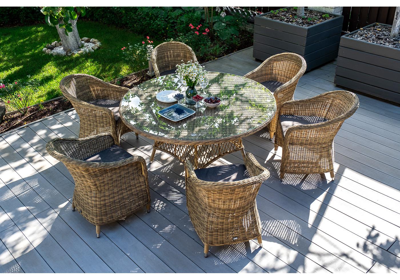 Высота спинки – 400 "Эспрессо" плетеный круглый стол, диаметр 150 см, цвет соломенный 1шт. 1 500Х1 500Х750, "Равенна" плетеное кресло из искусственного ротанга, цвет соломенный 6шт. 570Х680Х810,