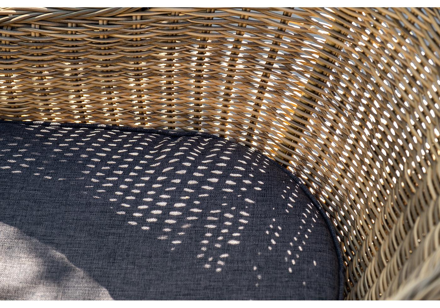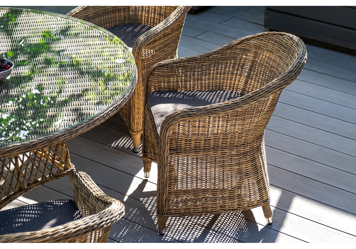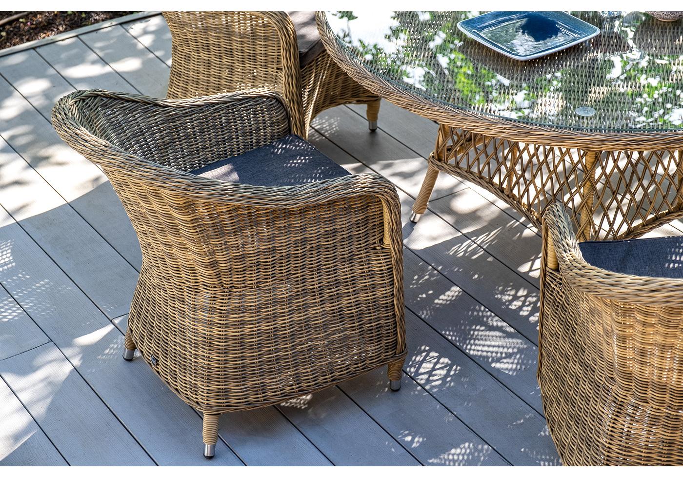Вся мебель изготовлена из долговечного и легкого алюминия, обтянутого синтетическим ротангом. На столе для удобства эксплуатации предусмотрена столешница из ударопрочного закаленного стекла 5 мм. Стулья укомплектованы подушками на сидениях.