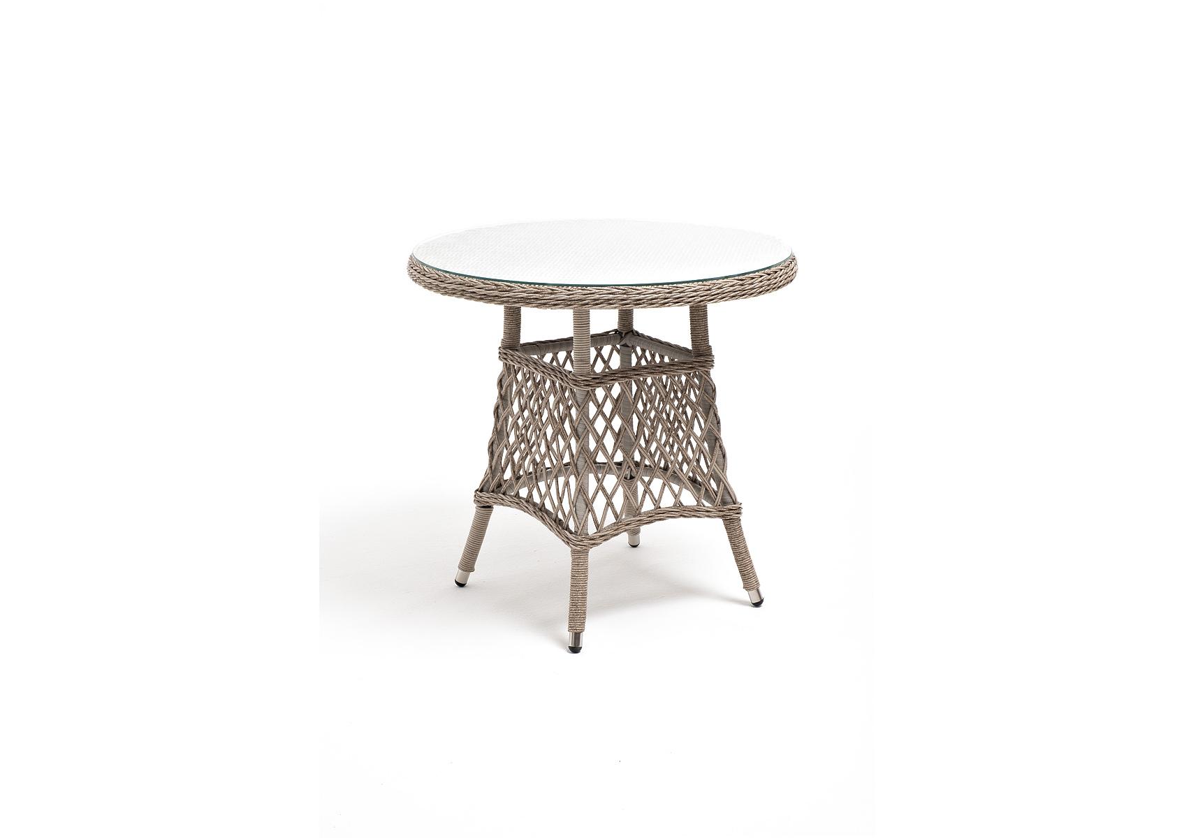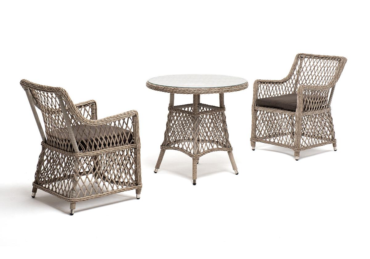 В плетеный комплект входит круглый стол «Эспрессо» диаметром 80 см с ударопрочной стеклянной столешницей и 2 кресла коллекции «Латте» 550×660×850 мм.
