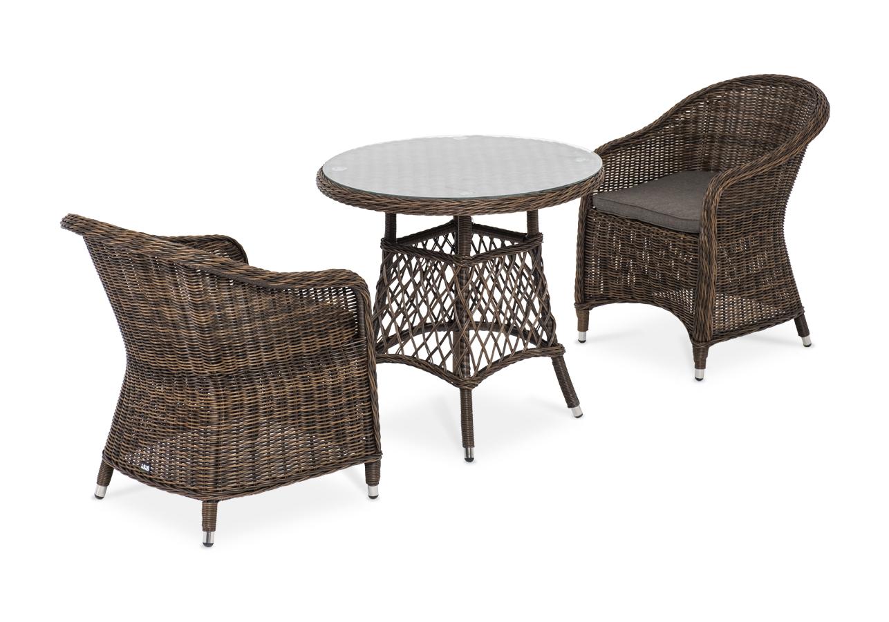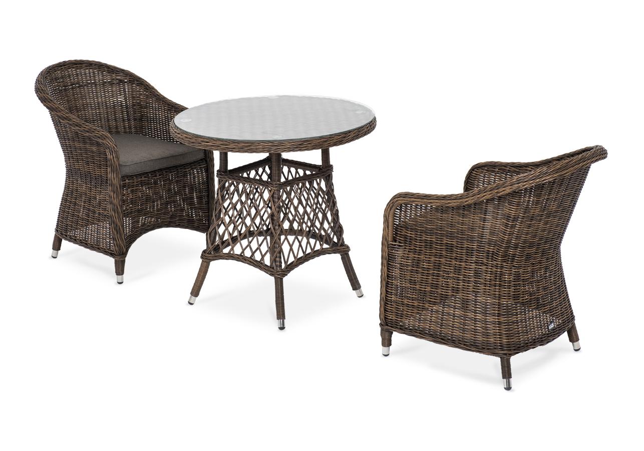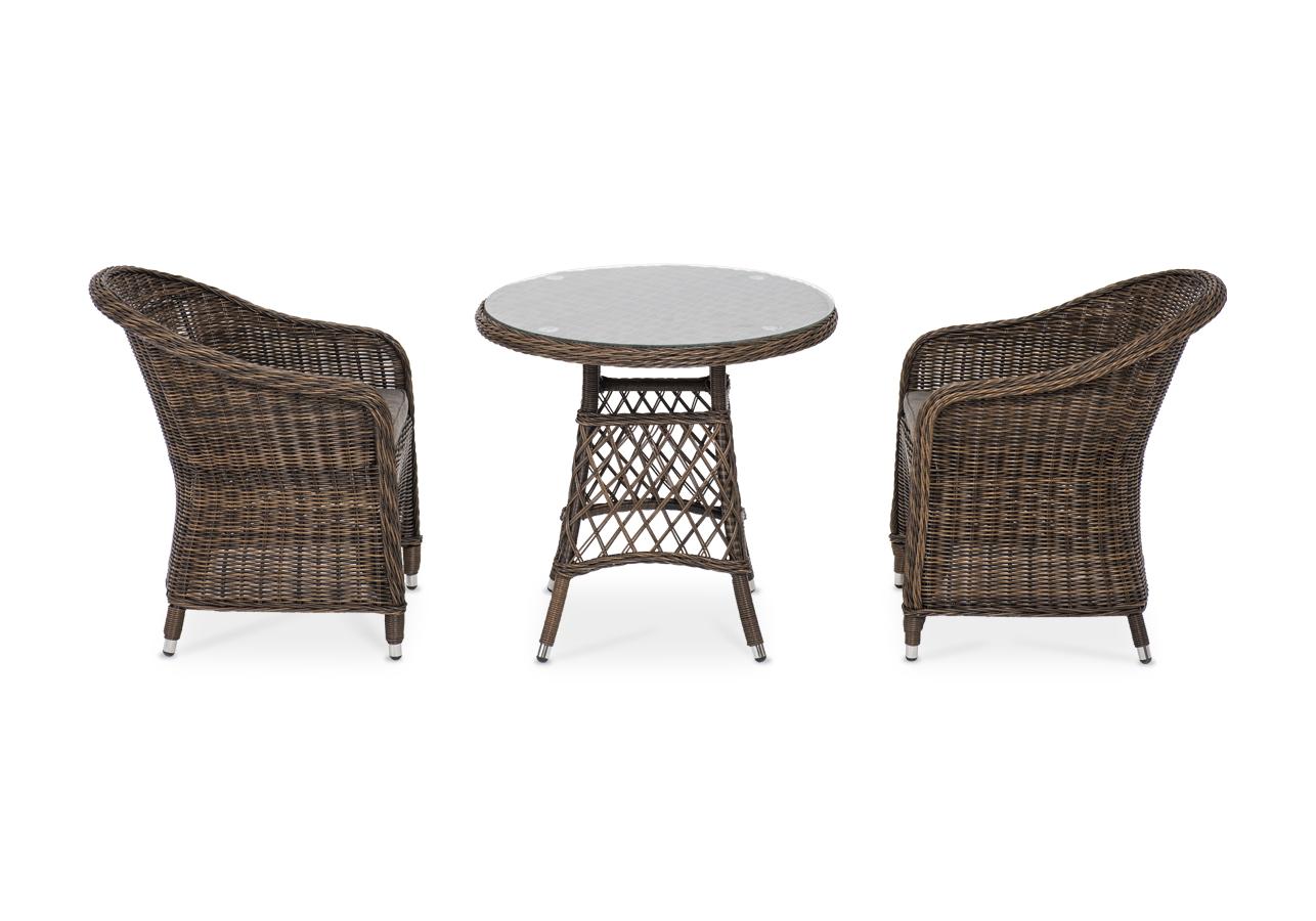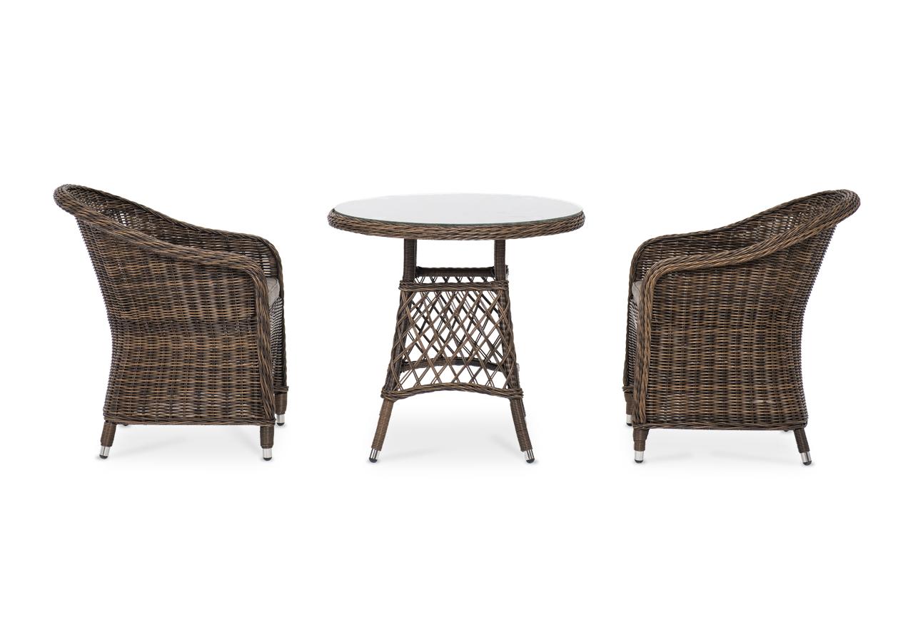 В плетеный комплект входит круглый стол «Эспрессо» диаметром 80 см с ударопрочной стеклянной столешницей и 2 кресла коллекции «Равенна» 570×680×810 мм.