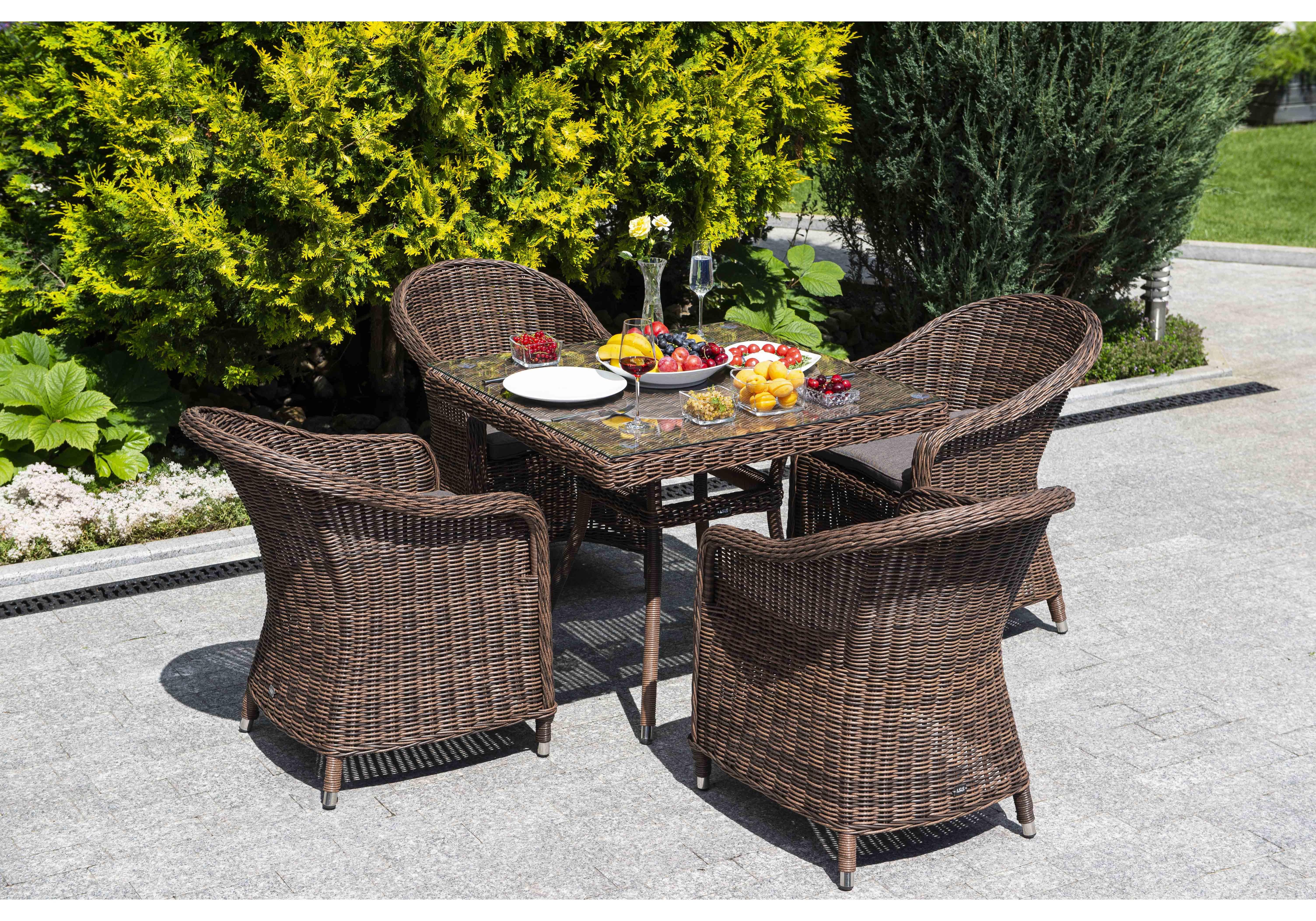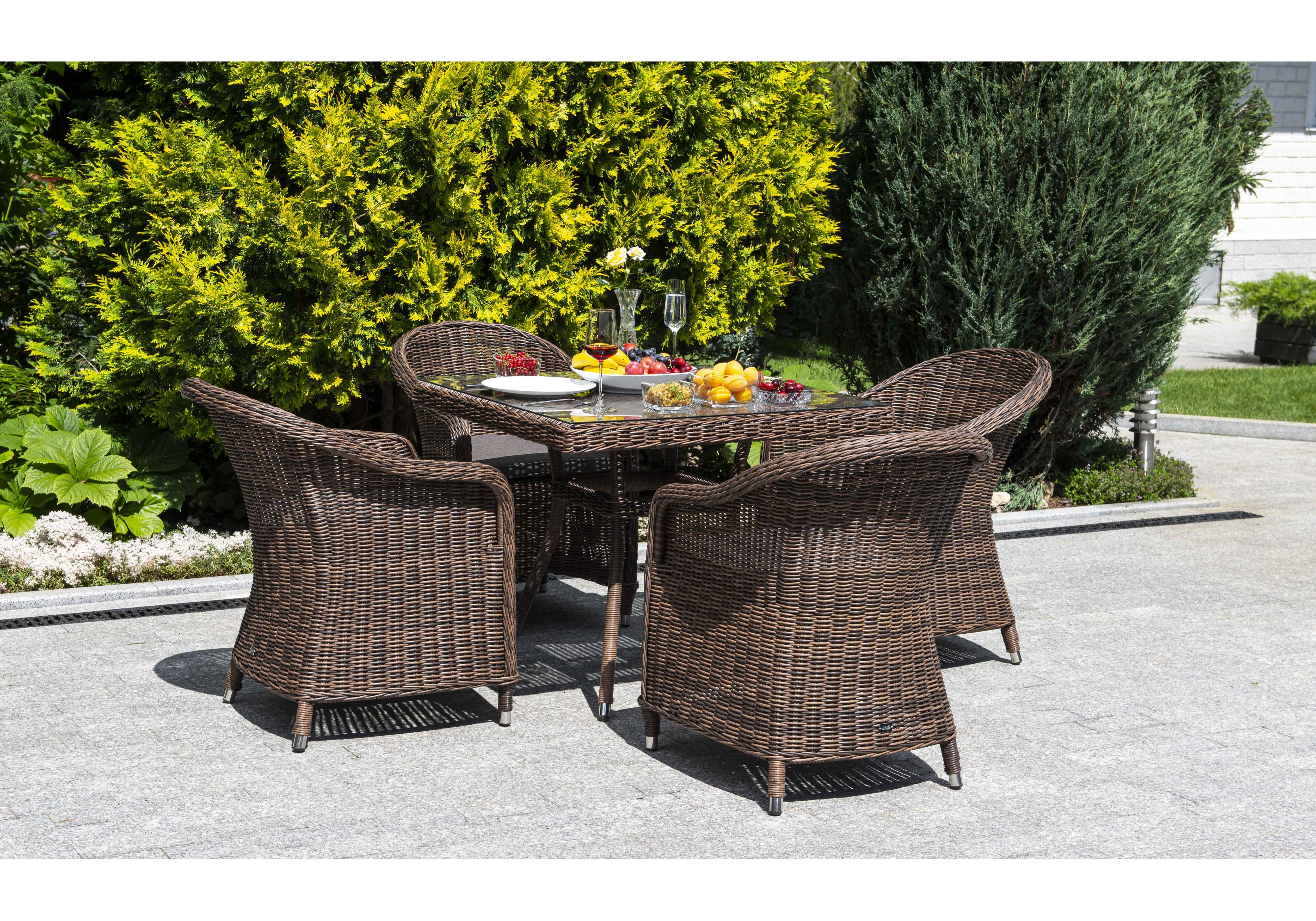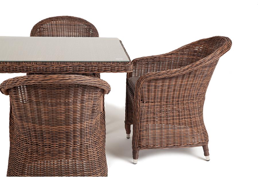 Обеденная группа идеальна для обустройства лаунж-зоны на открытом пространстве поскольку устойчива "Айриш" стол плетеный из искусственного ротанга, цвет коричневый 1шт. 900Х900Х750, "Равенна" плетеное кресло из искусственного ротанга, цвет коричневый 4шт. 570Х680Х810,
