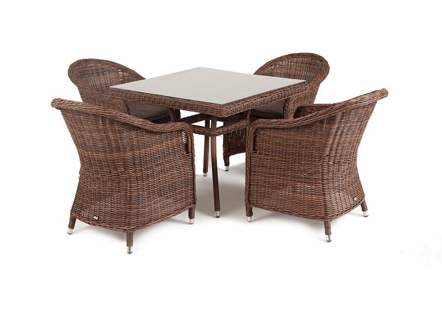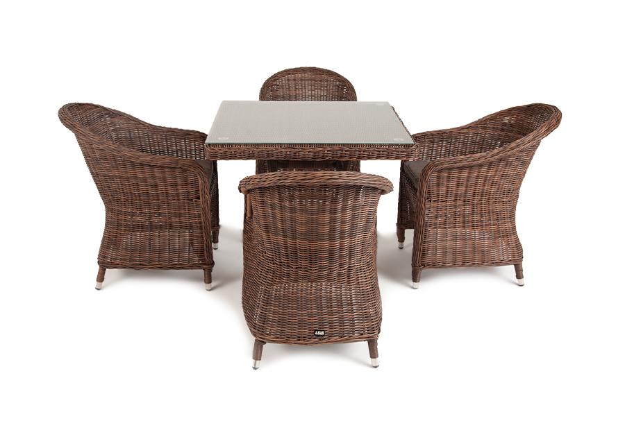 Обеденная группа «Фредо» для сада, веранды, летней площадки ресторана. В набор входит квадратный стол «Айриш» (900×900×750 мм) и 4 кресла «Равенна» (570×680×810 мм) в насыщенном коричневом оттенке.