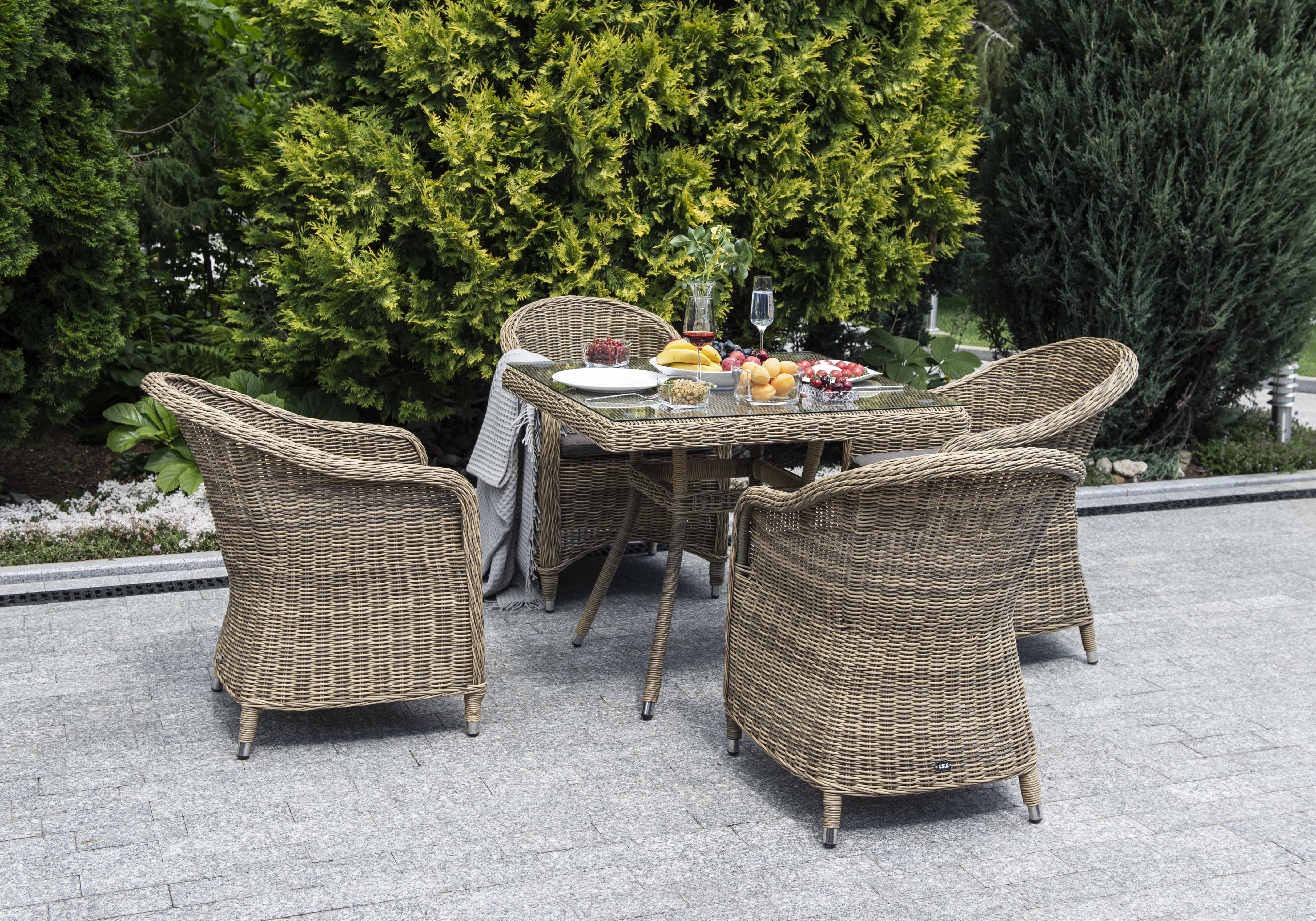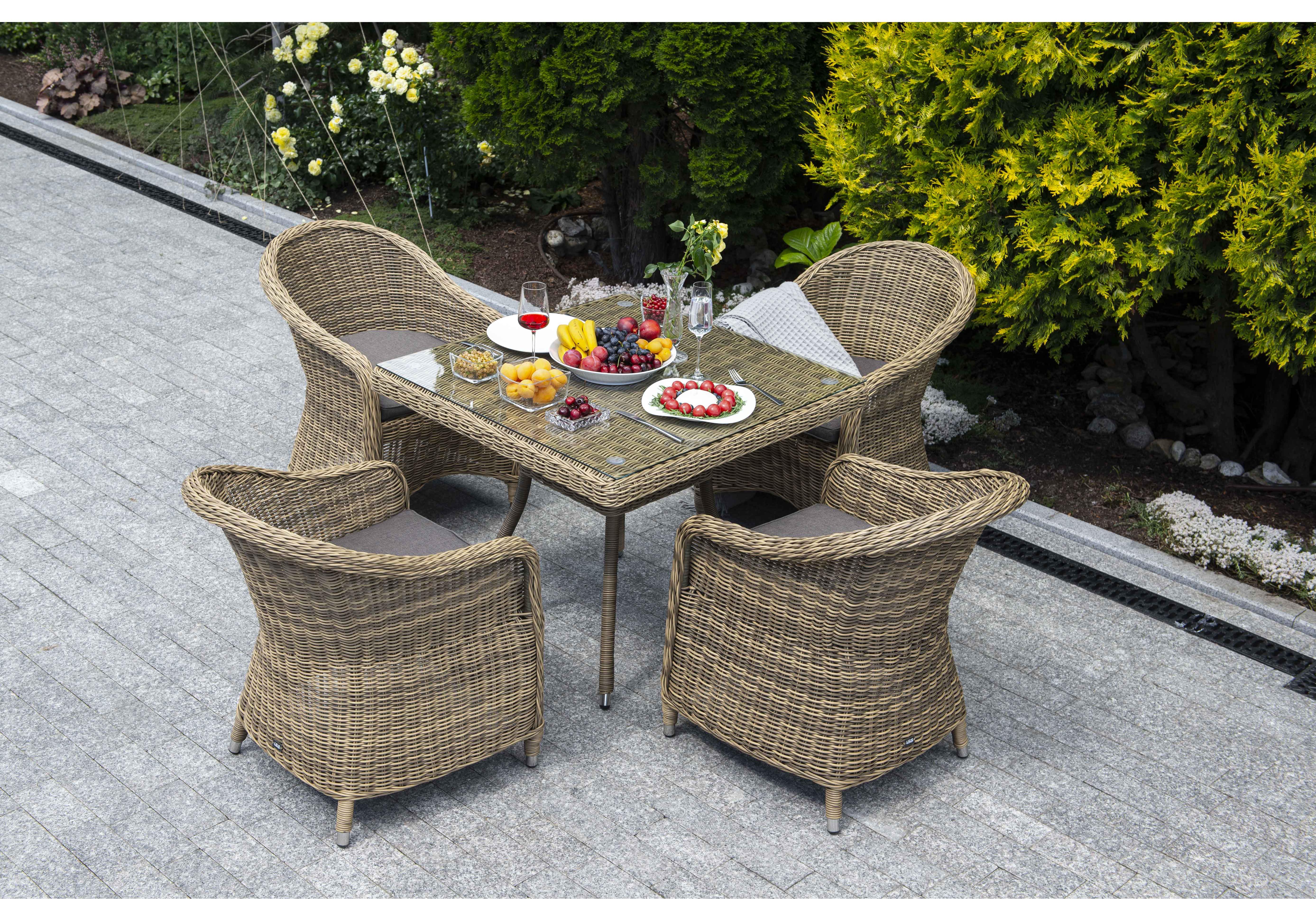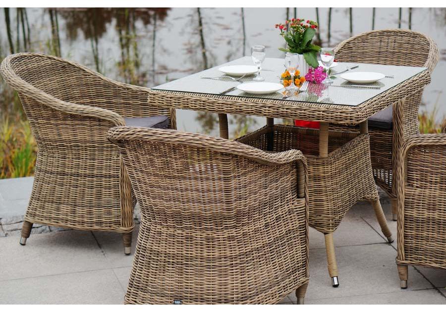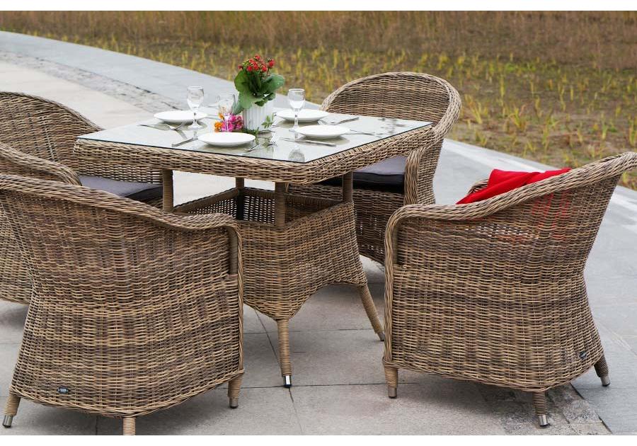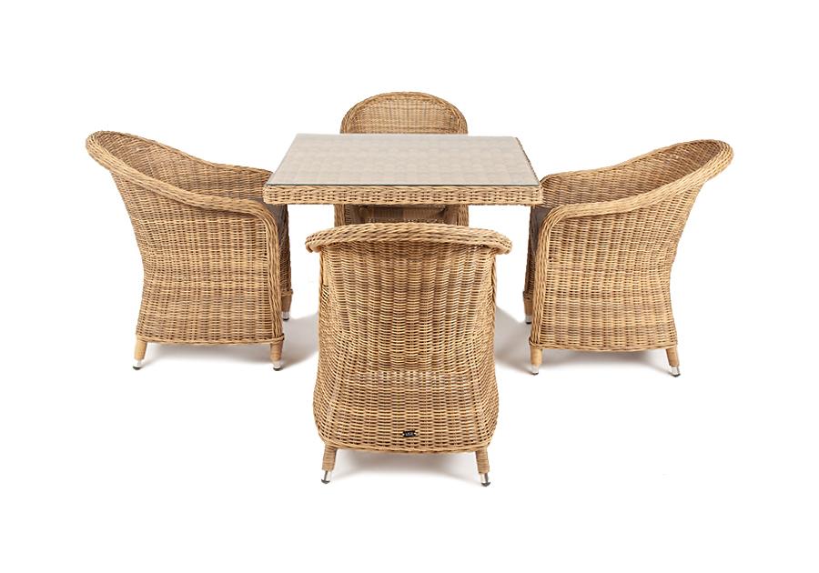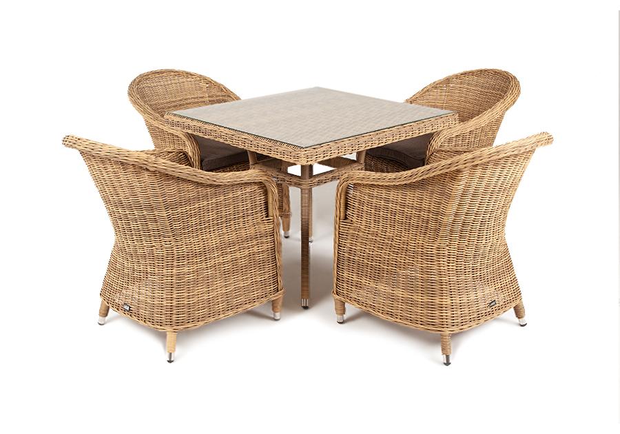 Уличная обеденная группа «Фредо» для обустройства зоны отдыха. Комплект состоит из: квадратного обеденного стола «Айриш» - 900×900×750 мм и 4 кресел «Равенна» - 570×680×810 мм в натуральном соломенном цвете.