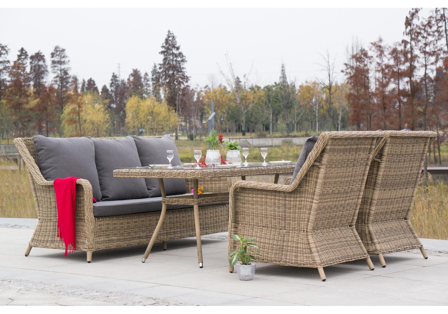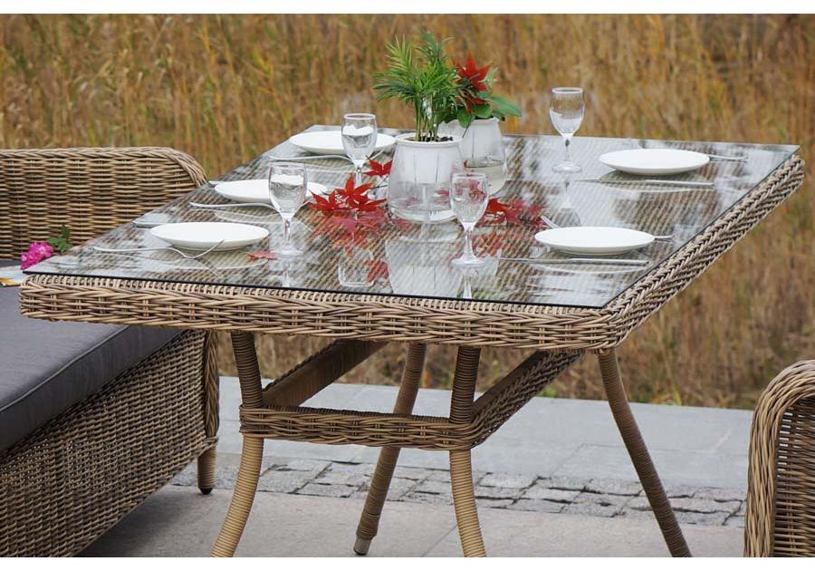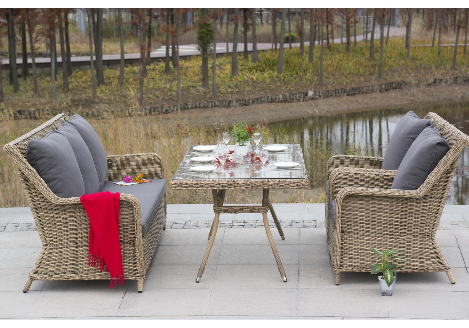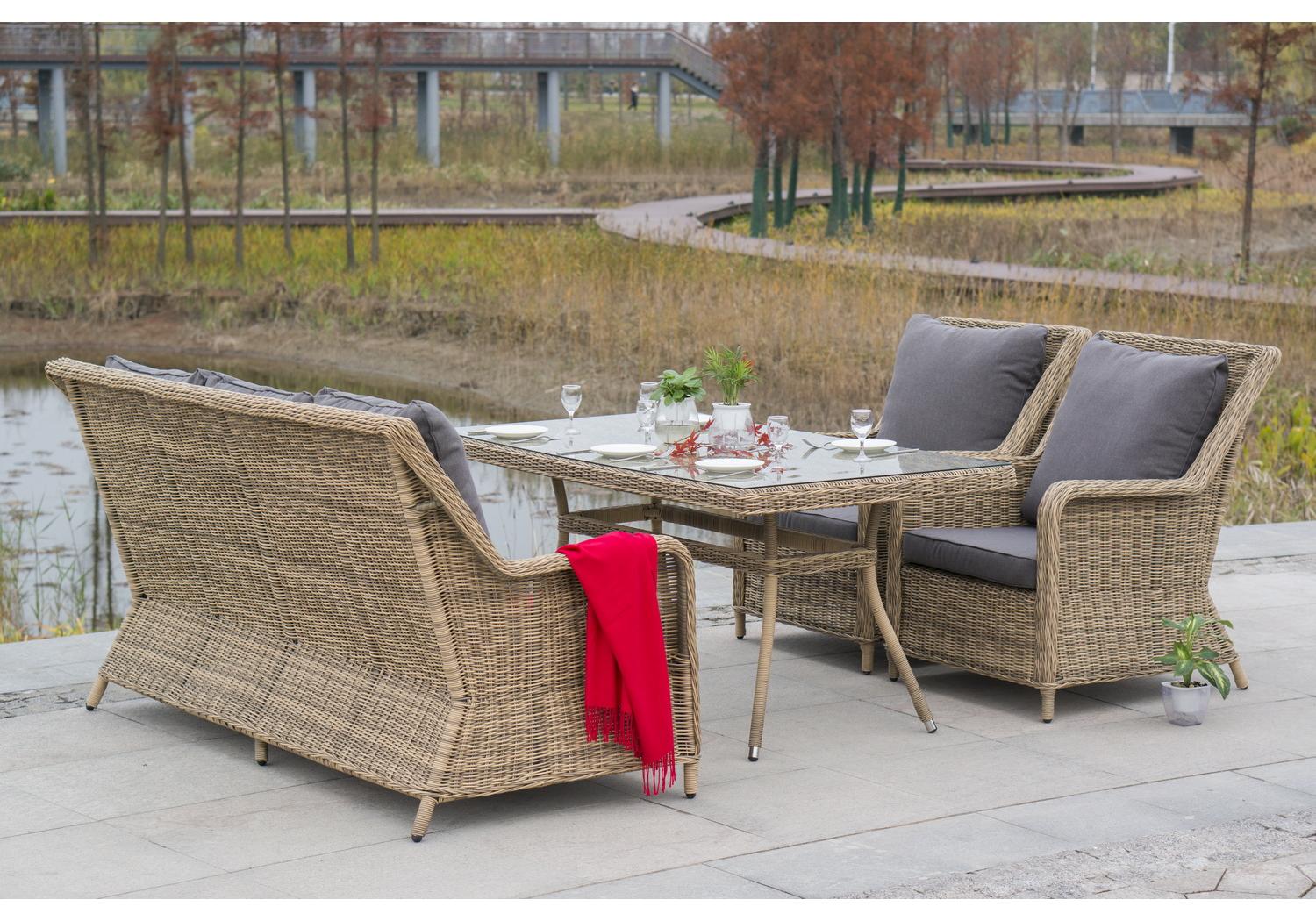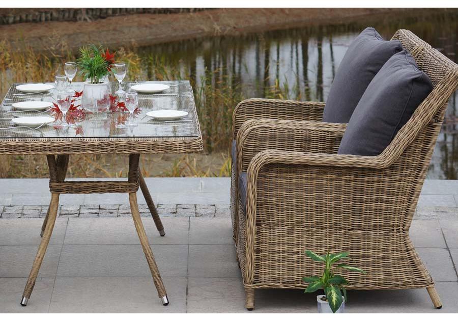 Столешница обеденного стола изготовлена из высокопрочного закаленного стекла, которое по стандартам используется в пищевой промышленности. "Гляссе" диван трехместный из искусственного ротанга, цвет соломенный 1шт. 1 900Х880Х990, "Гляссе" кресло плетеное из искусственного ротанга, цвет соломенный 2шт. 730Х880Х990, "Латте" плетеный стол из искусственного ротанга 160х90см, цвет соломенный 1шт. 1 600Х900Х750,