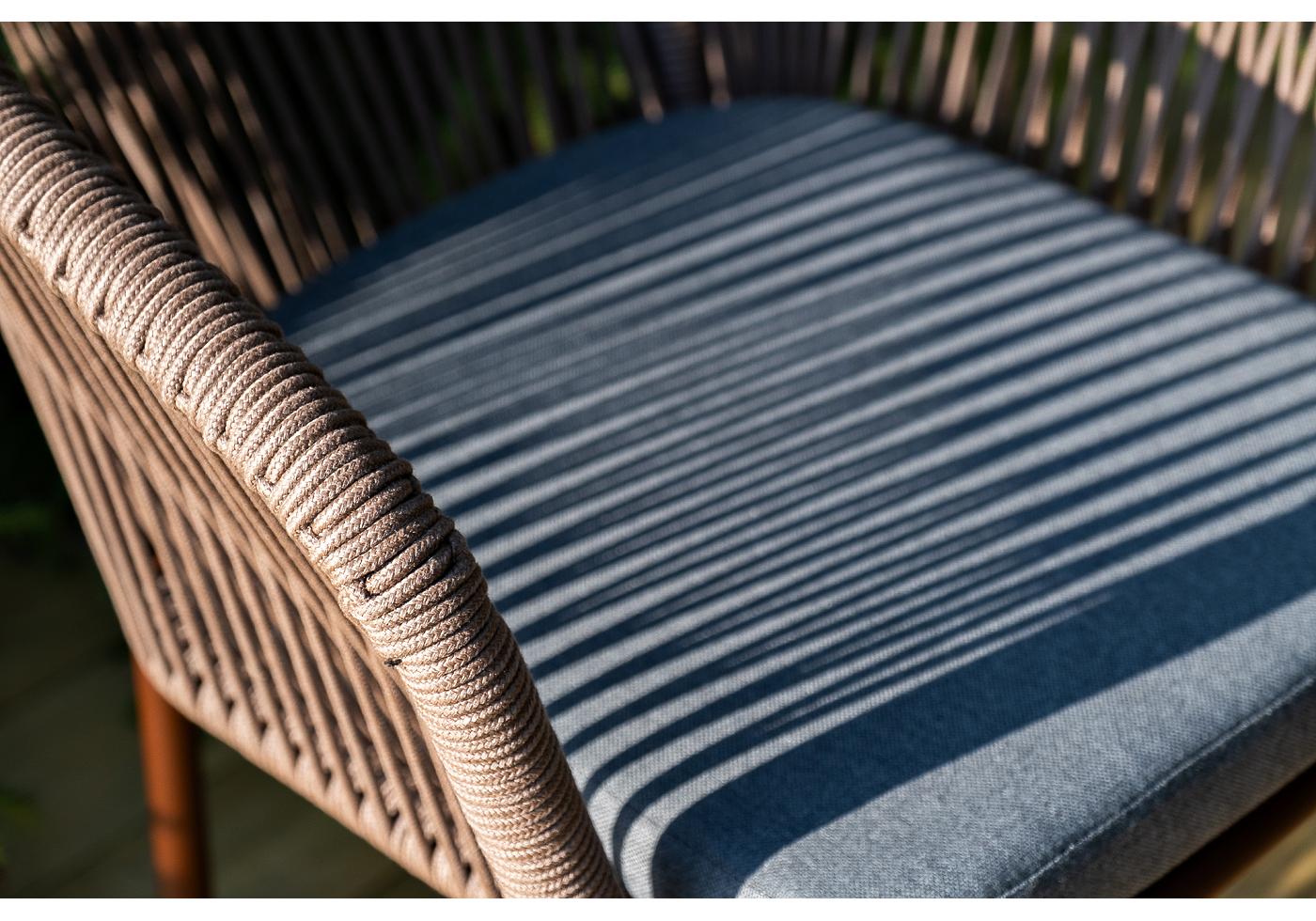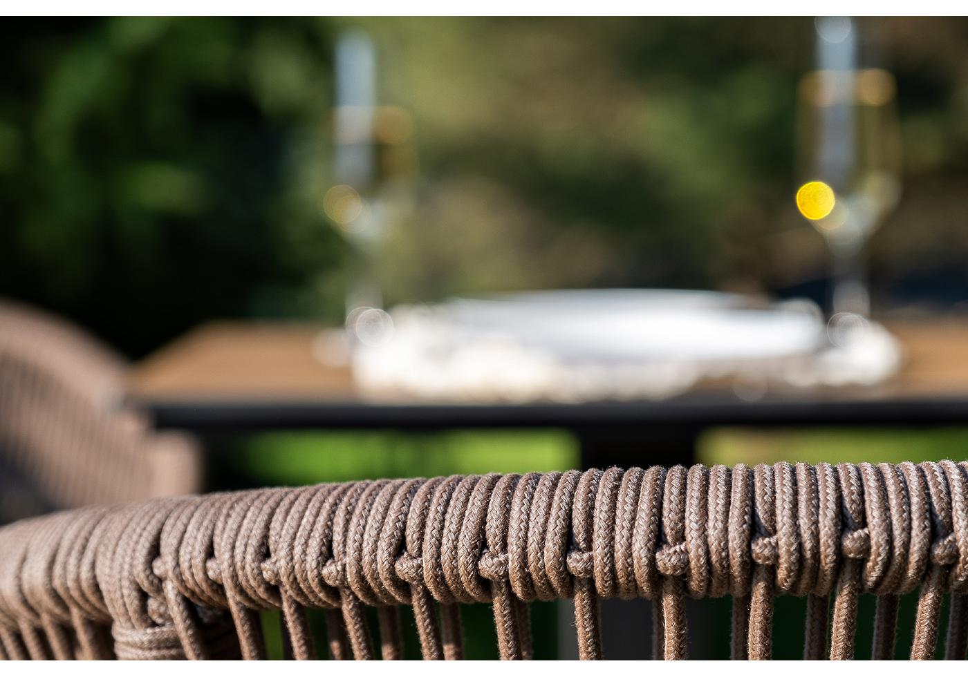 Стулья оснащены алюминиевым каркасом, которые вручную оплетены плоским роупом коричневого цвета.