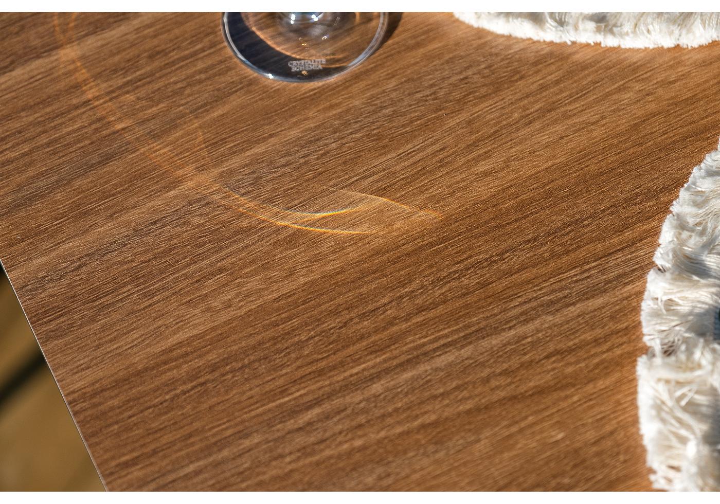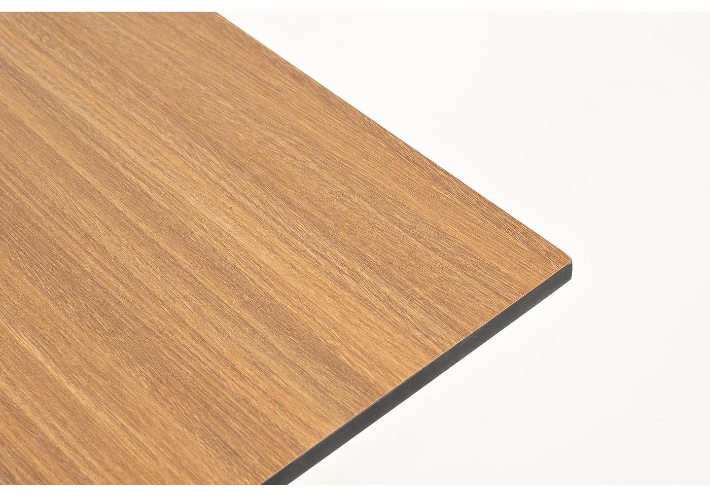 Интерьерный стол изготовлен из металлического подстолья, окрашенного в черный цвет, и столешницы из компактного пластика HPL в цвете «дуб». Благодаря массивному основанию столик устойчив на любых поверхностях.