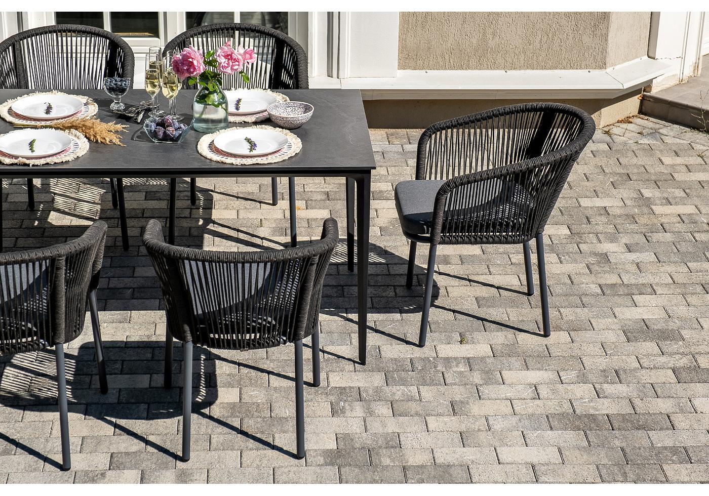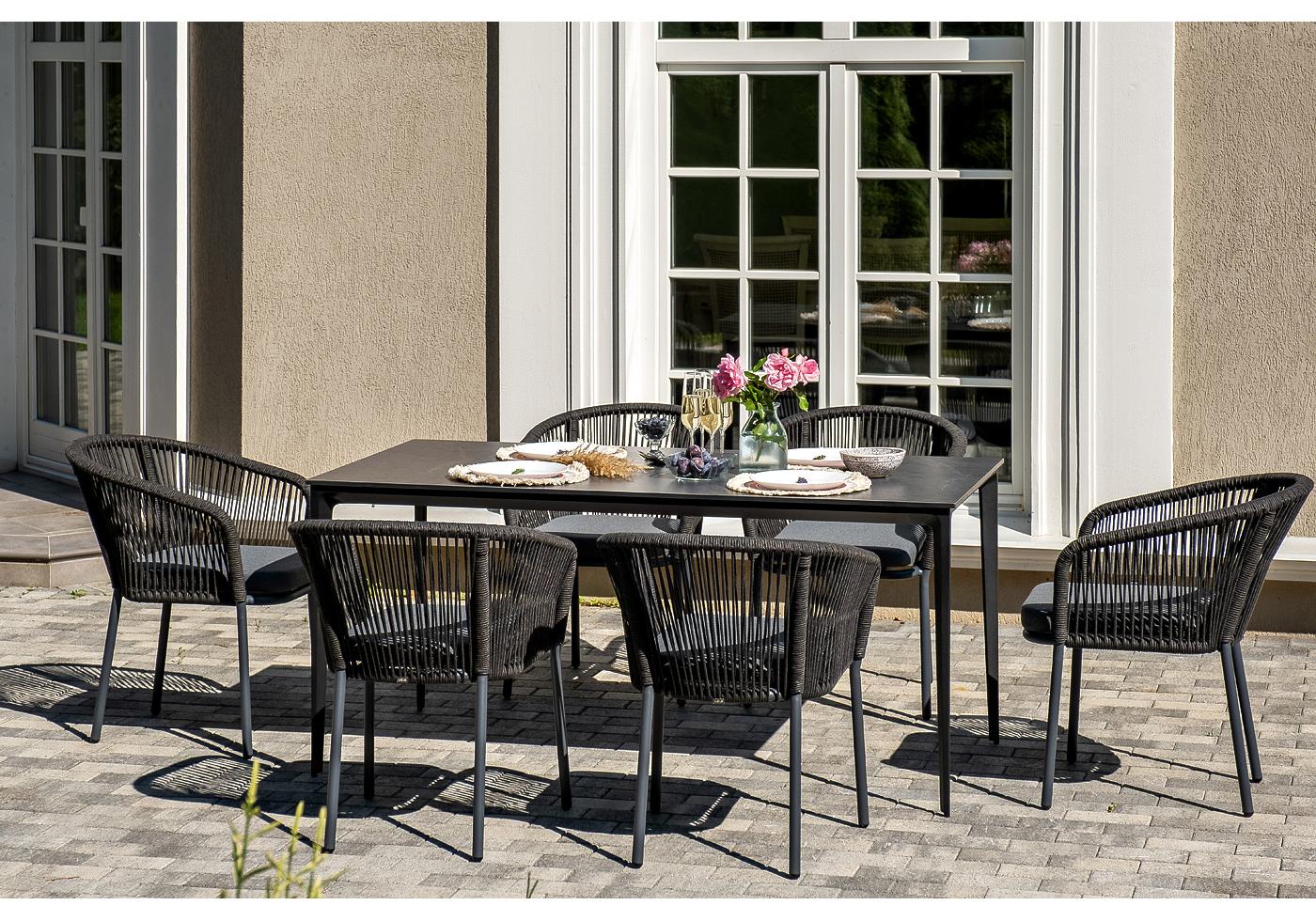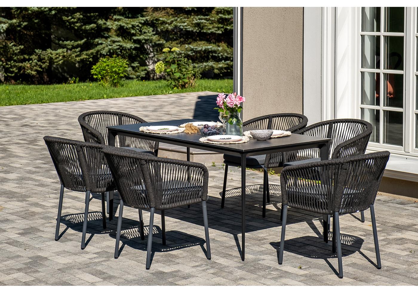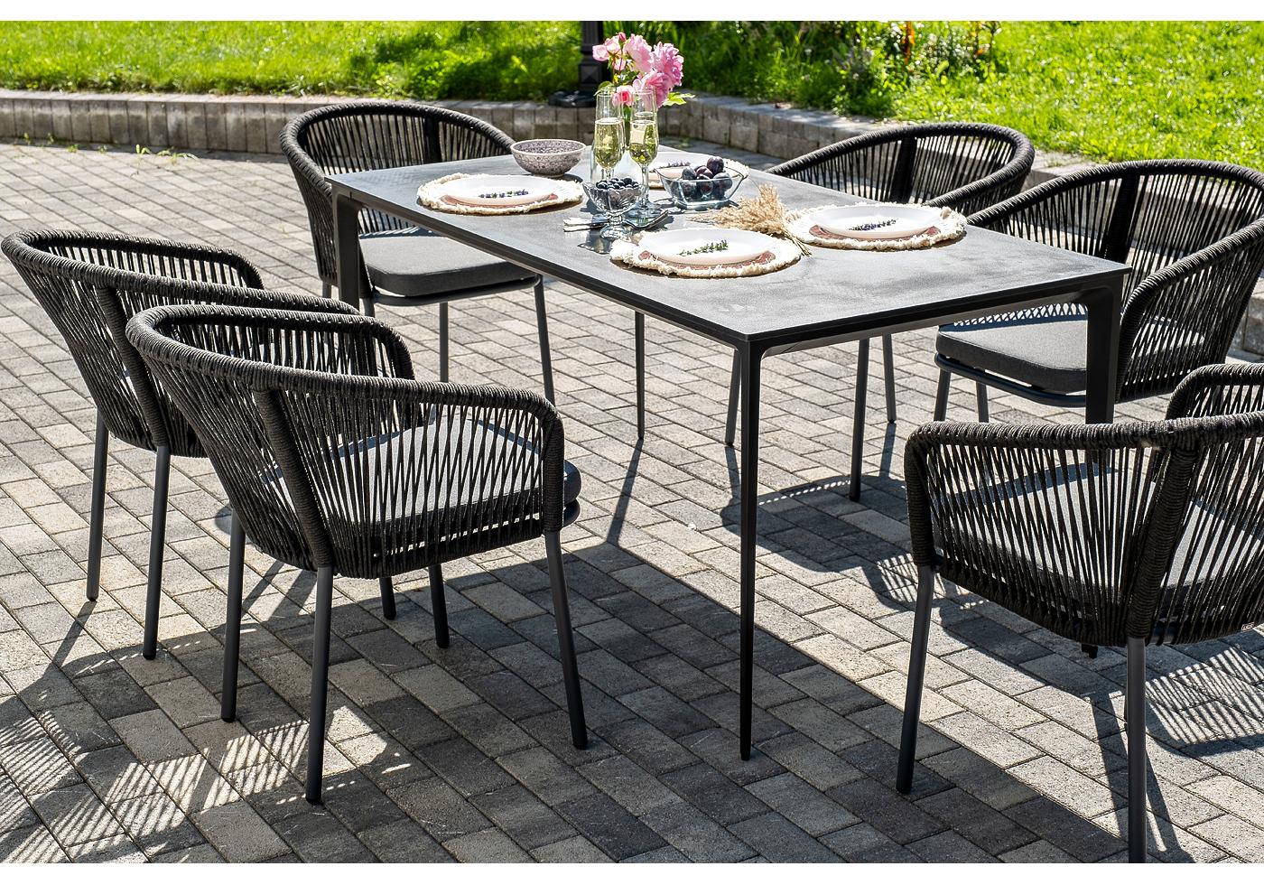 - 6 плетеных стульев «Марсель» из роупа, размером - 570×620×77,5 мм, цвет каркаса и роупа - темно-серый. "Малага" обеденный стол из HPL 160х80см, цвет "серый гранит", каркас черный 1шт. 1 600Х800Х750, "Марсель" стул плетеный из роупа, каркас алюминий темно-серый (RAL7024) муар, роуп темно-серый круглый, ткань темно-серая 027 6шт. 570Х620Х775,