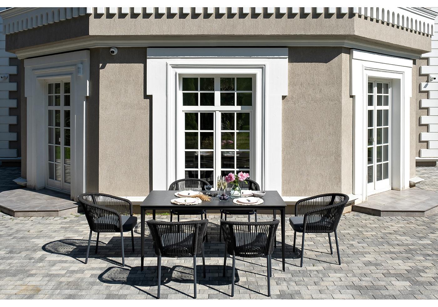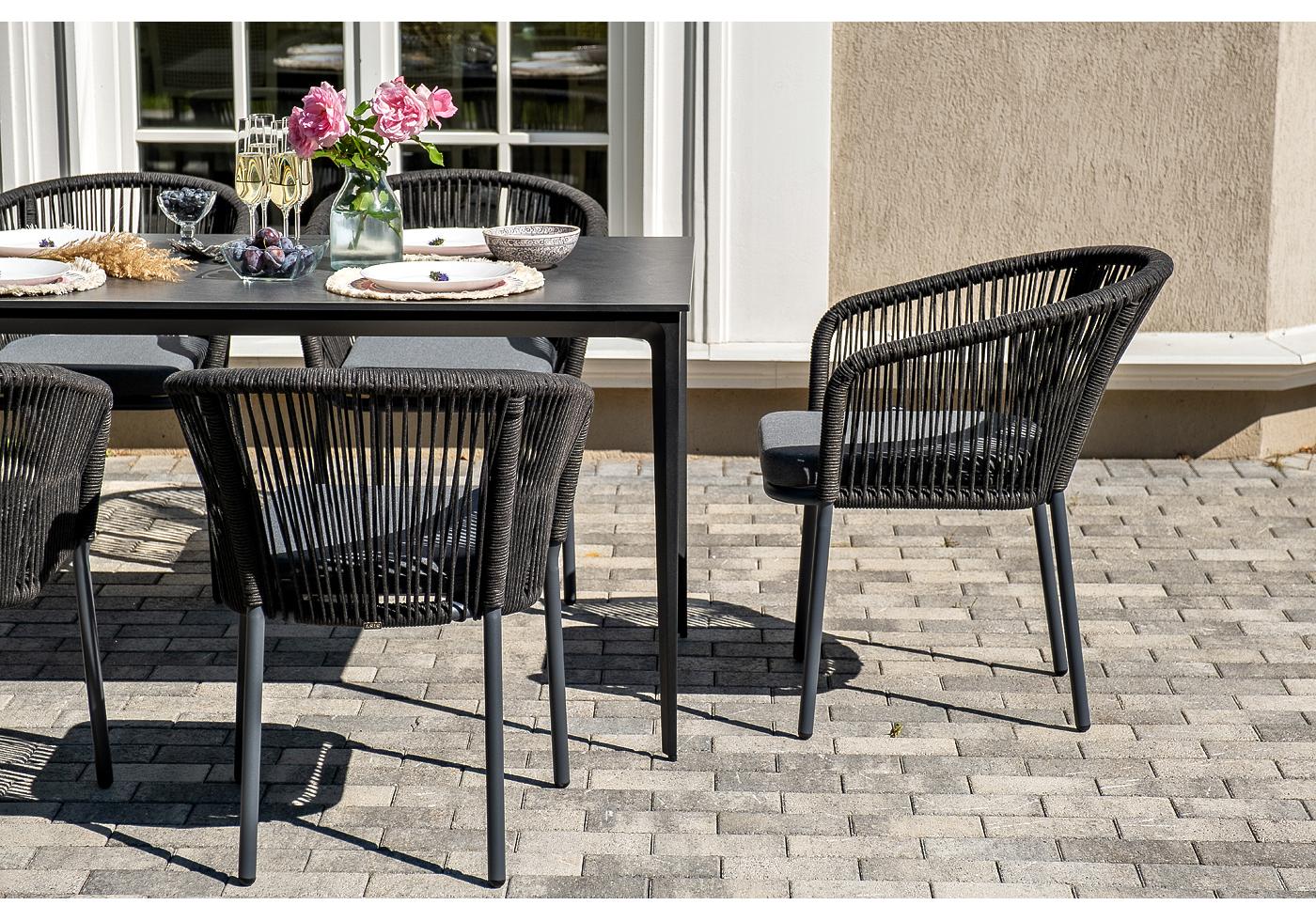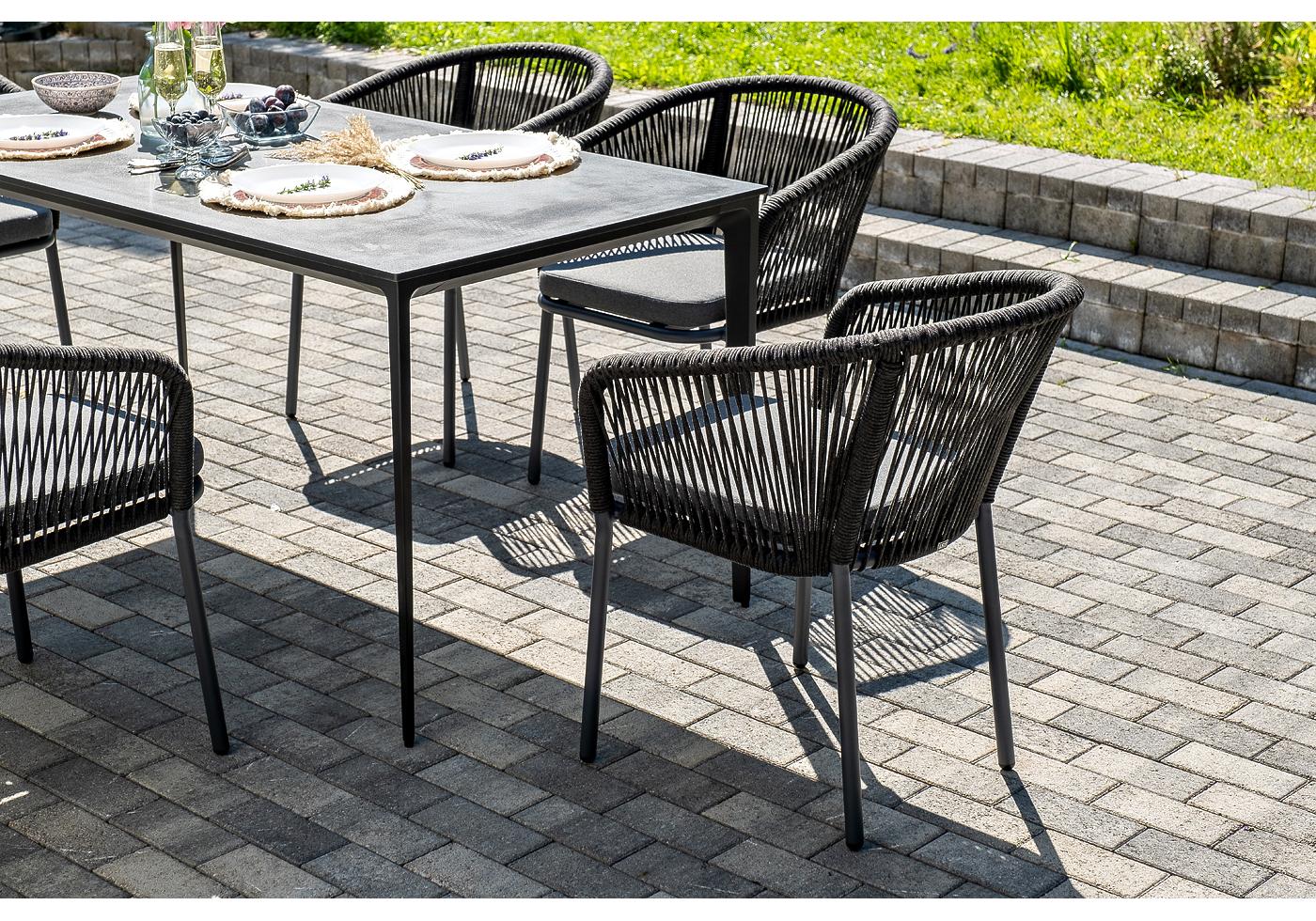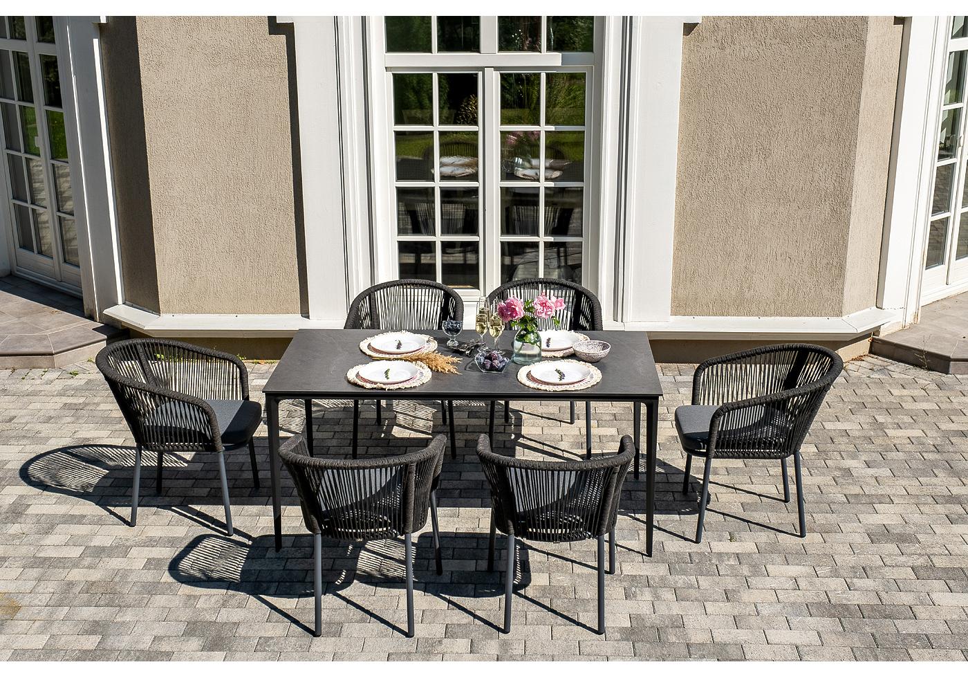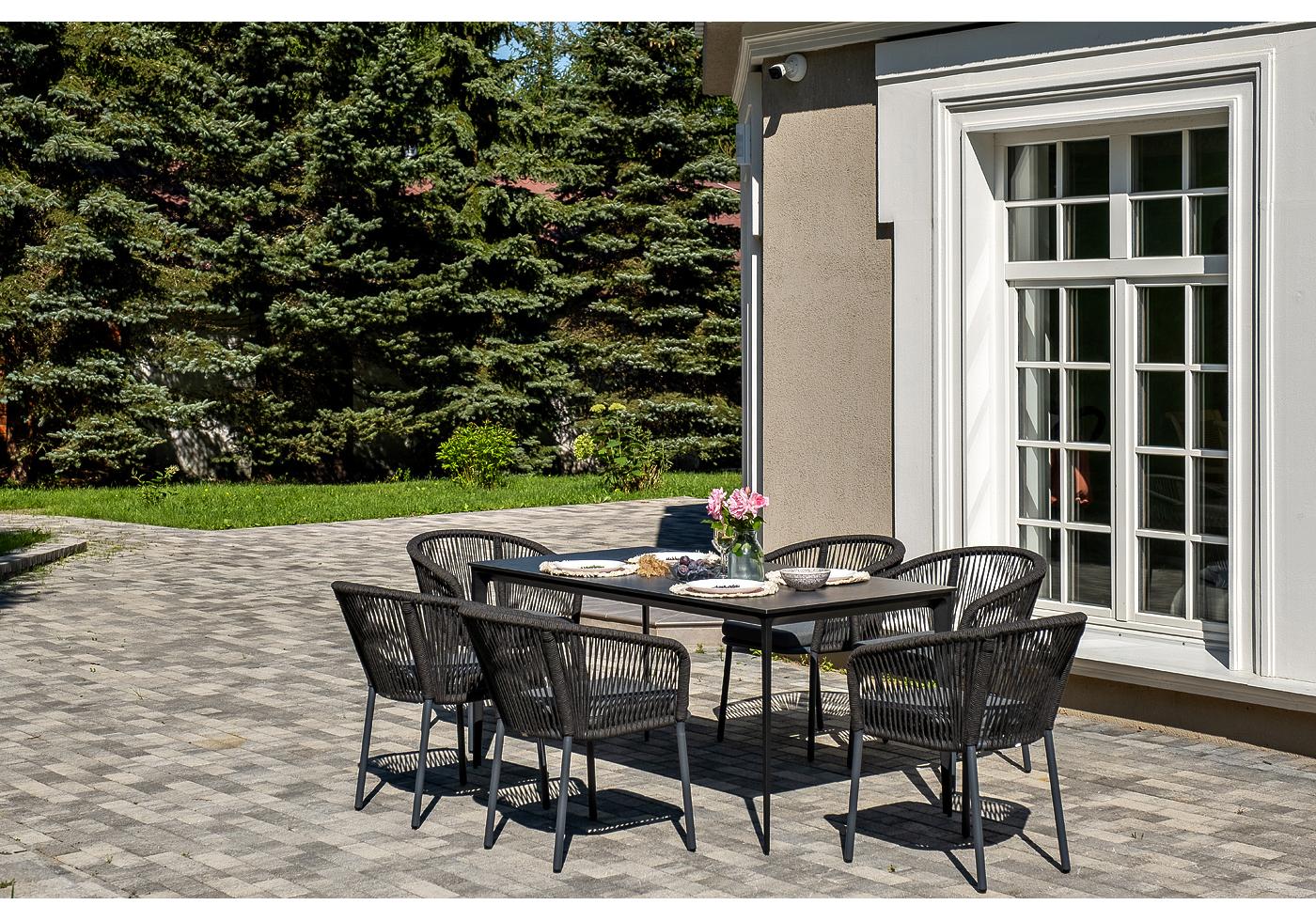 - 6 плетеных стульев «Марсель» из роупа, размером - 570×620×77,5 мм, цвет каркаса и роупа - темно-серый. "Малага" обеденный стол из HPL 160х80см, цвет "серый гранит", каркас черный 1шт. 1 600Х800Х750, "Марсель" стул плетеный из роупа, каркас алюминий темно-серый (RAL7024) муар, роуп темно-серый круглый, ткань темно-серая 027 6шт. 570Х620Х775,
