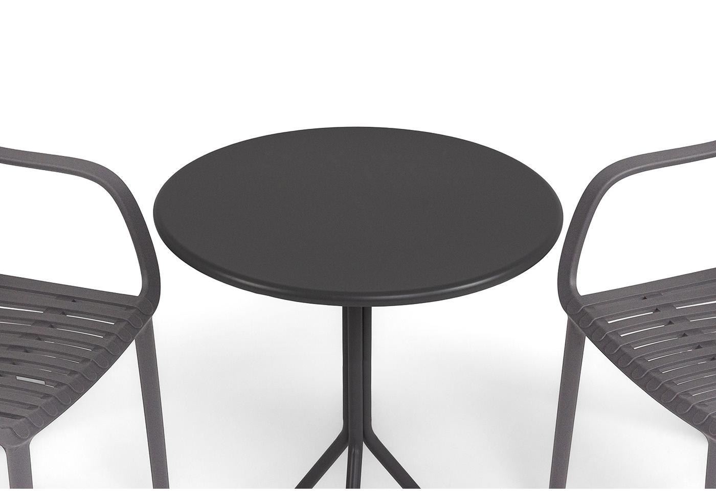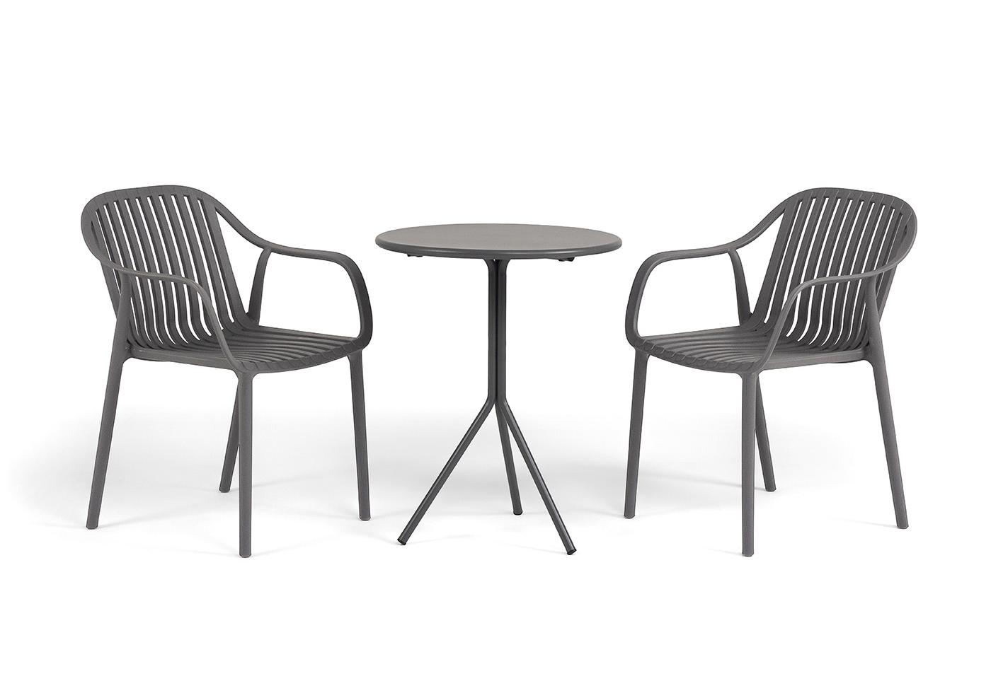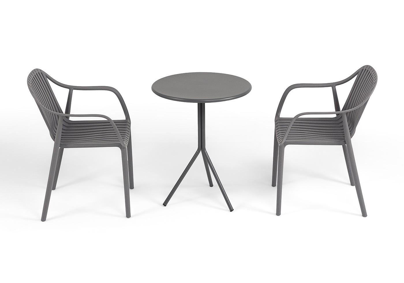 Стулья изготовлены из полипропилена, прочного и стойкого пластика, устойчивого к УФ-излучению, благодаря этому стул сохраняет свой первоначальный вид и не выцветает на солнце даже несмотря на активную эксплуатацию. Цвет - темно-серый. "Мохито" стальной круглый стол Ø60см, цвет темно-серый 1шт. 600Х600Х750, "Мохито" стул пластиковый, цвет темно-серый 2шт. 570Х580Х830,