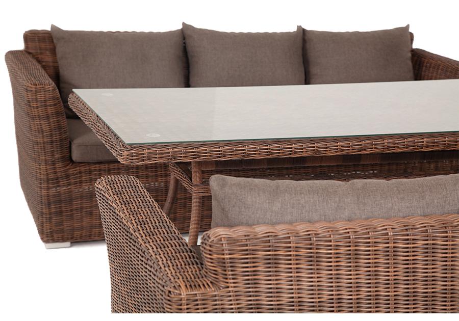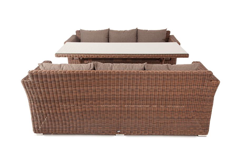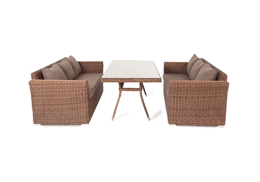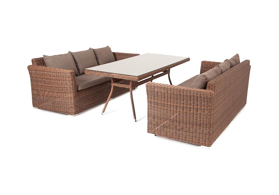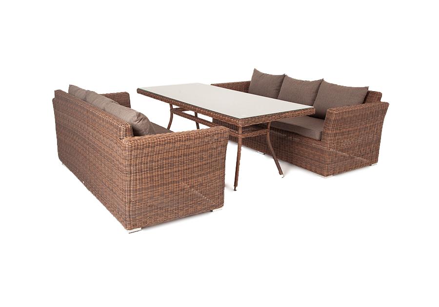 Каркас всех предметов изготовлен из алюминия, поэтому их легко перемещать. В качестве декора использован искусственный ротанг круглого ручного плетения, устойчивый к УФ лучам, сырости, перепадам температуры. На сидениях и спинках диванов предусмотрены мягкие под "Капучино" диван из искусственного ротанга трехместный, цвет коричневый 2шт. 2 220Х865Х815, "Латте" плетеный стол из искусственного ротанга 200х90см, цвет коричневый 1шт. 2 000Х900Х750,