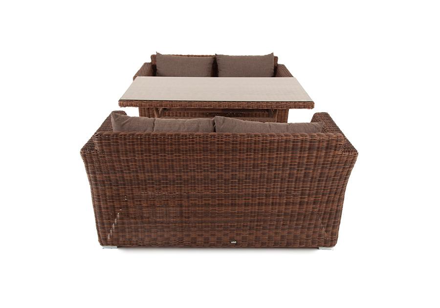 Мебель изготовлена из алюминия, устойчивого к атмосферным осадкам и ультрафиолету. Металлический каркас вручную оплетен долговечным искусственным ротангом. На диванах предусмотрены подушки со съёмными чехлами на сидениях и спинке. Набор мебели выполнен в насыщенном коричневом оттенке.