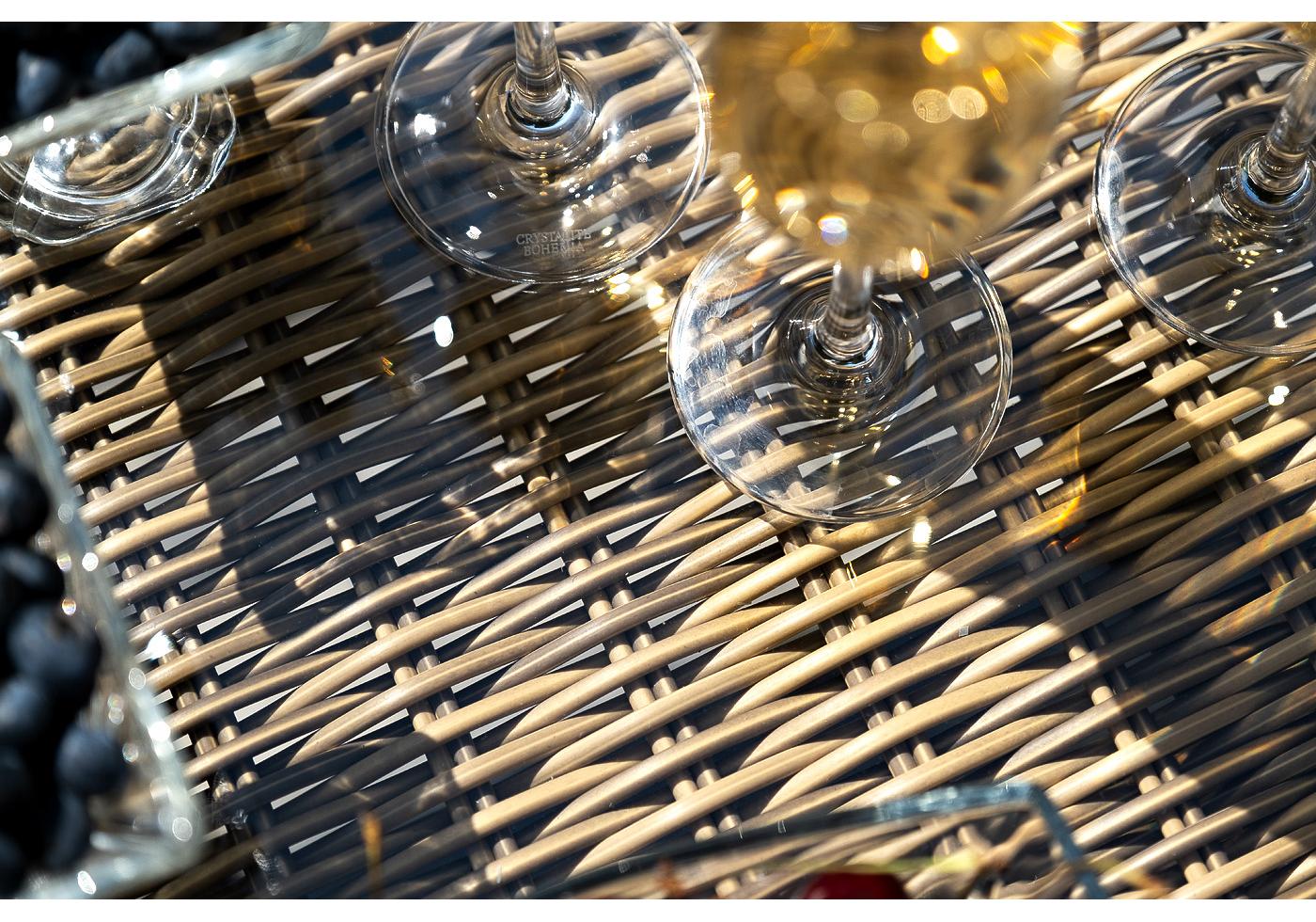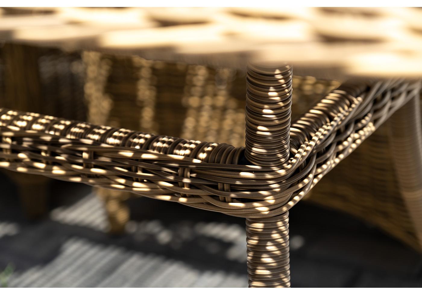 Каркас всех изделий выполнен из легкого и долговечного алюминия, оплетенного вручную круглым искусственным ротангом натурального соломенного цвета.