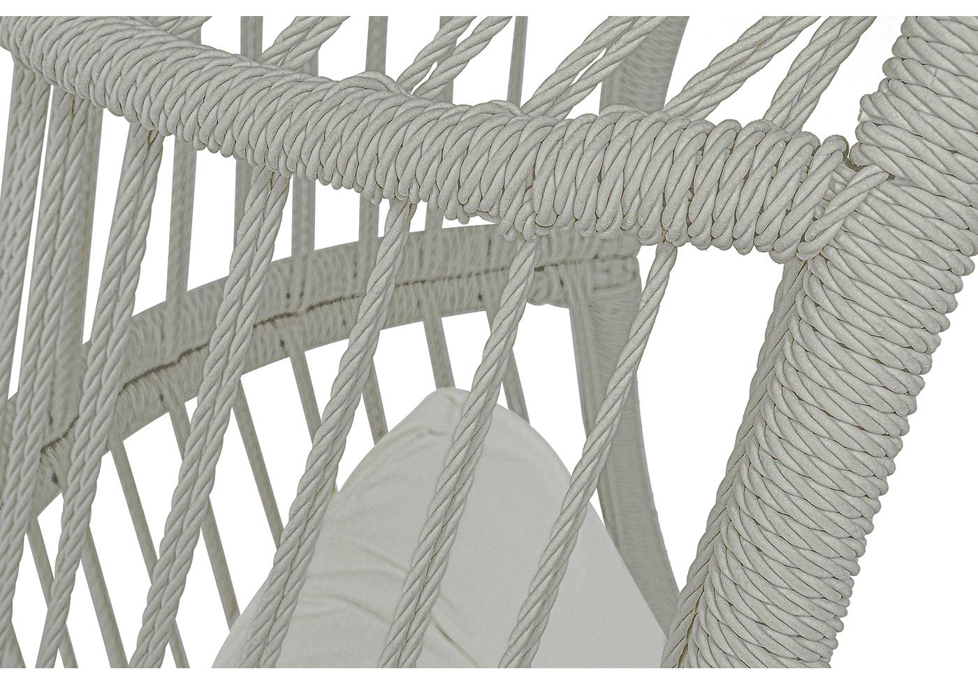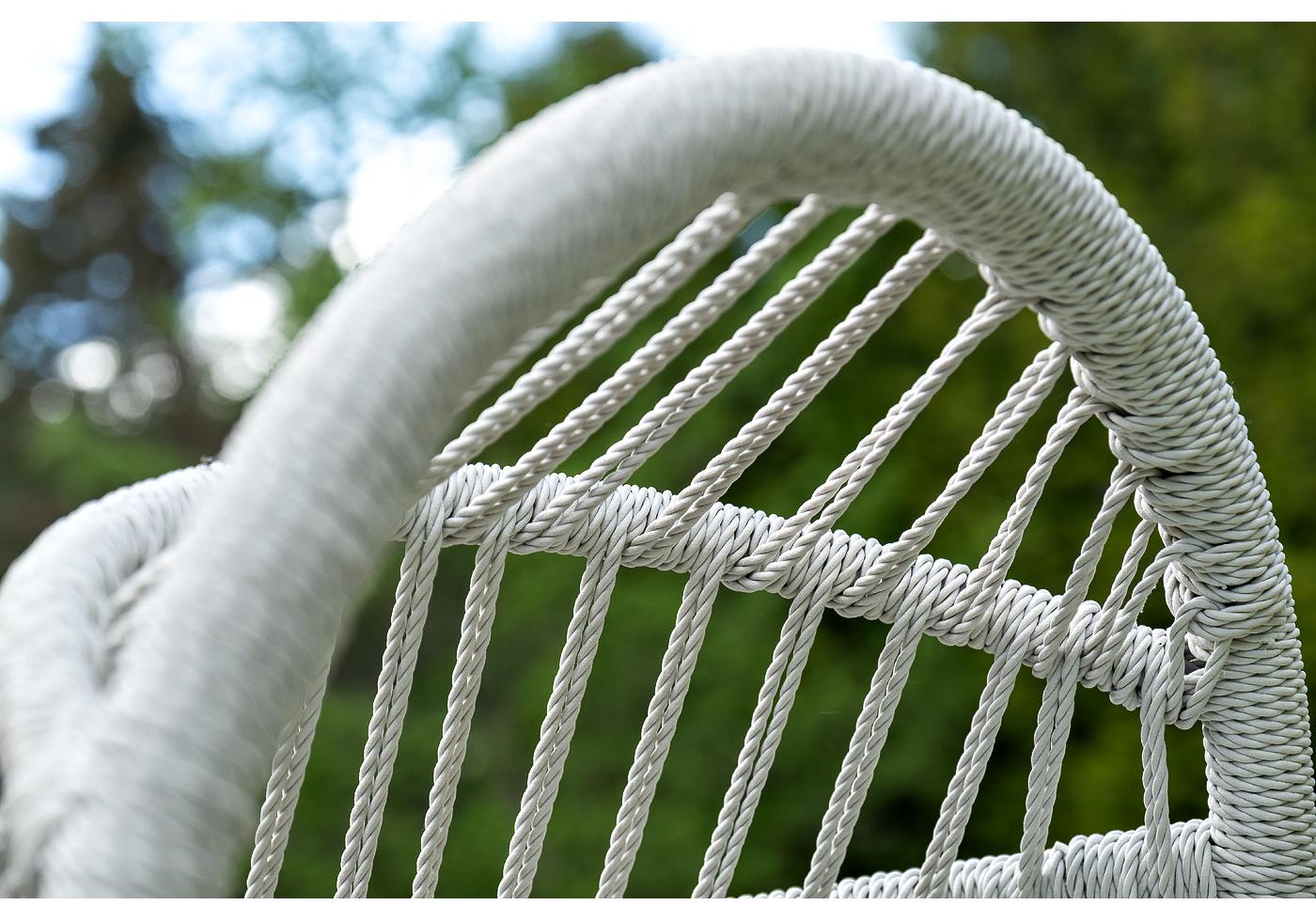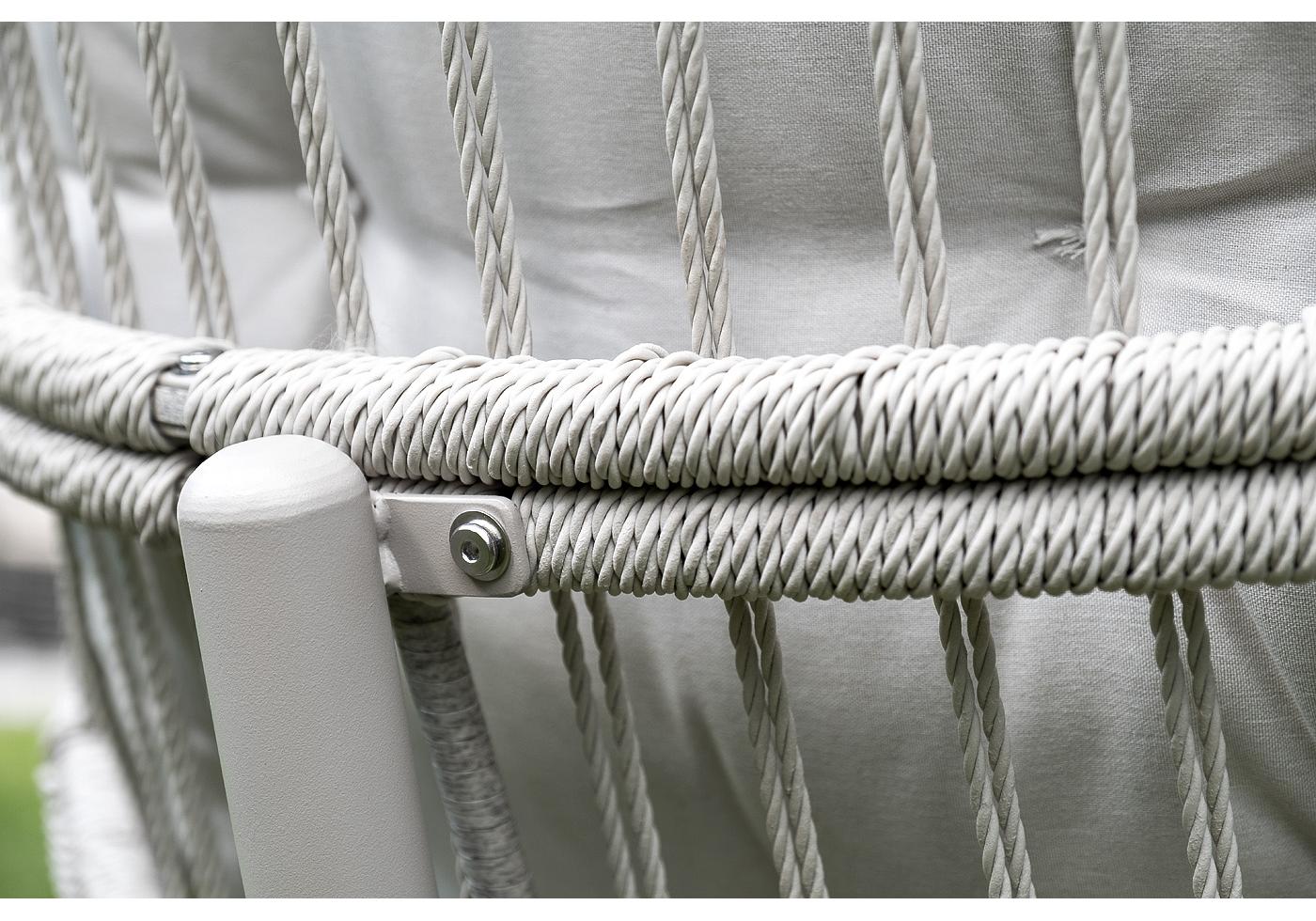 Каркас изготовлен из стали, окрашенного порошковой износостойкой краской белого цвета. Оплетка – плоский искусственный ротанг светло-серого оттенка. Материал устойчив к перепадам погоды и подходит для использования на открытых пространствах.