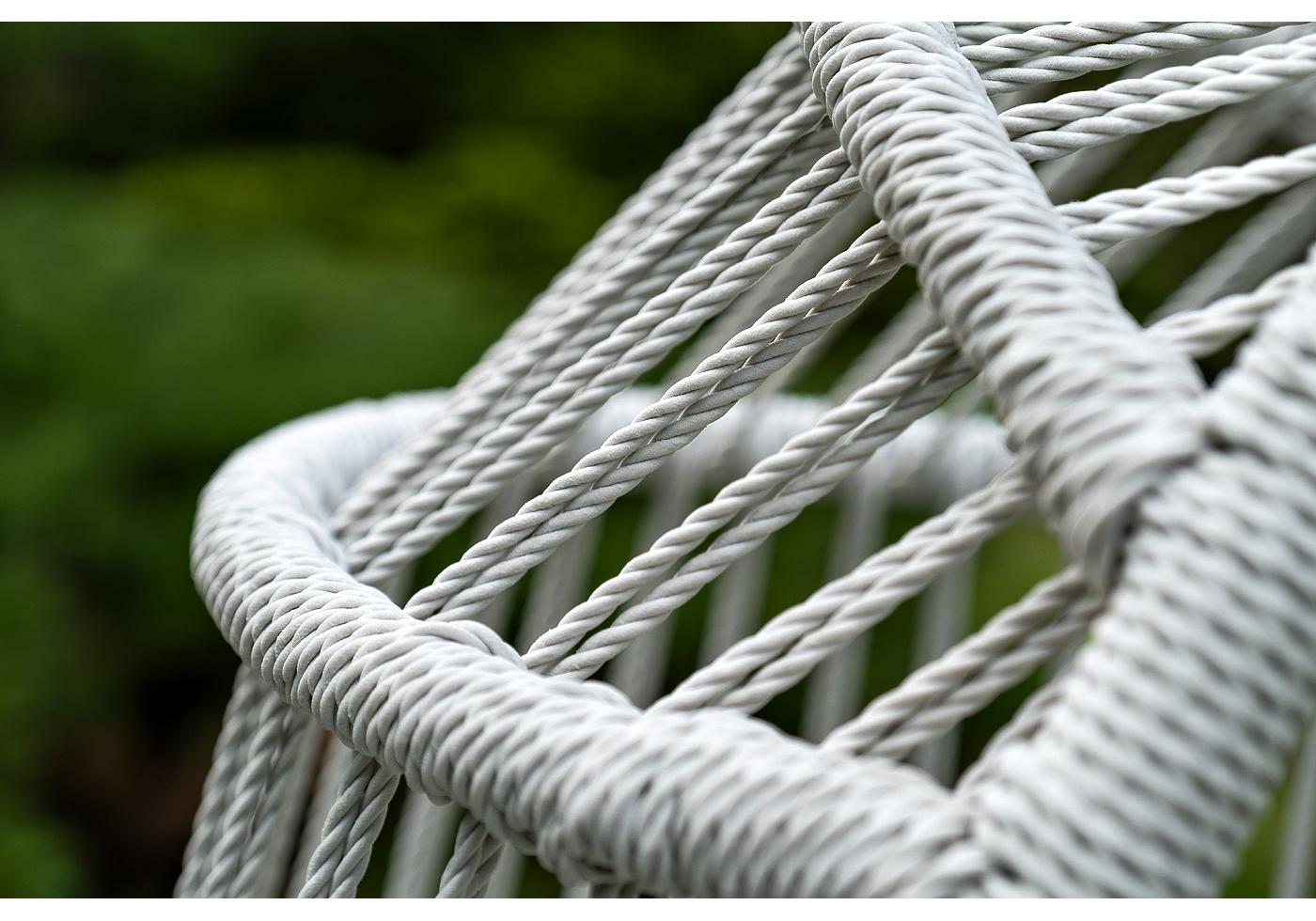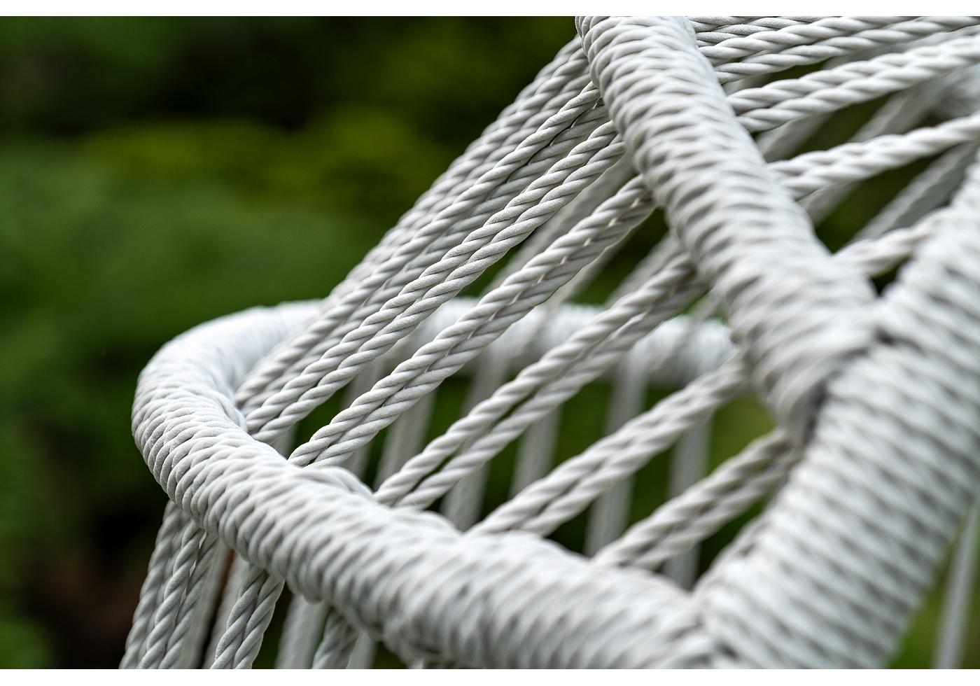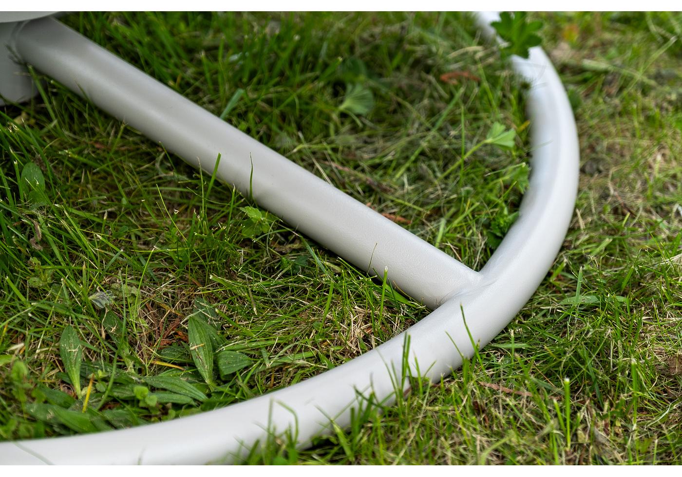 Каркас изготовлен из стали, окрашенного порошковой износостойкой краской белого цвета. Оплетка – плоский искусственный ротанг светло-серого оттенка. Материал устойчив к перепадам погоды и подходит для использования на открытых пространствах.