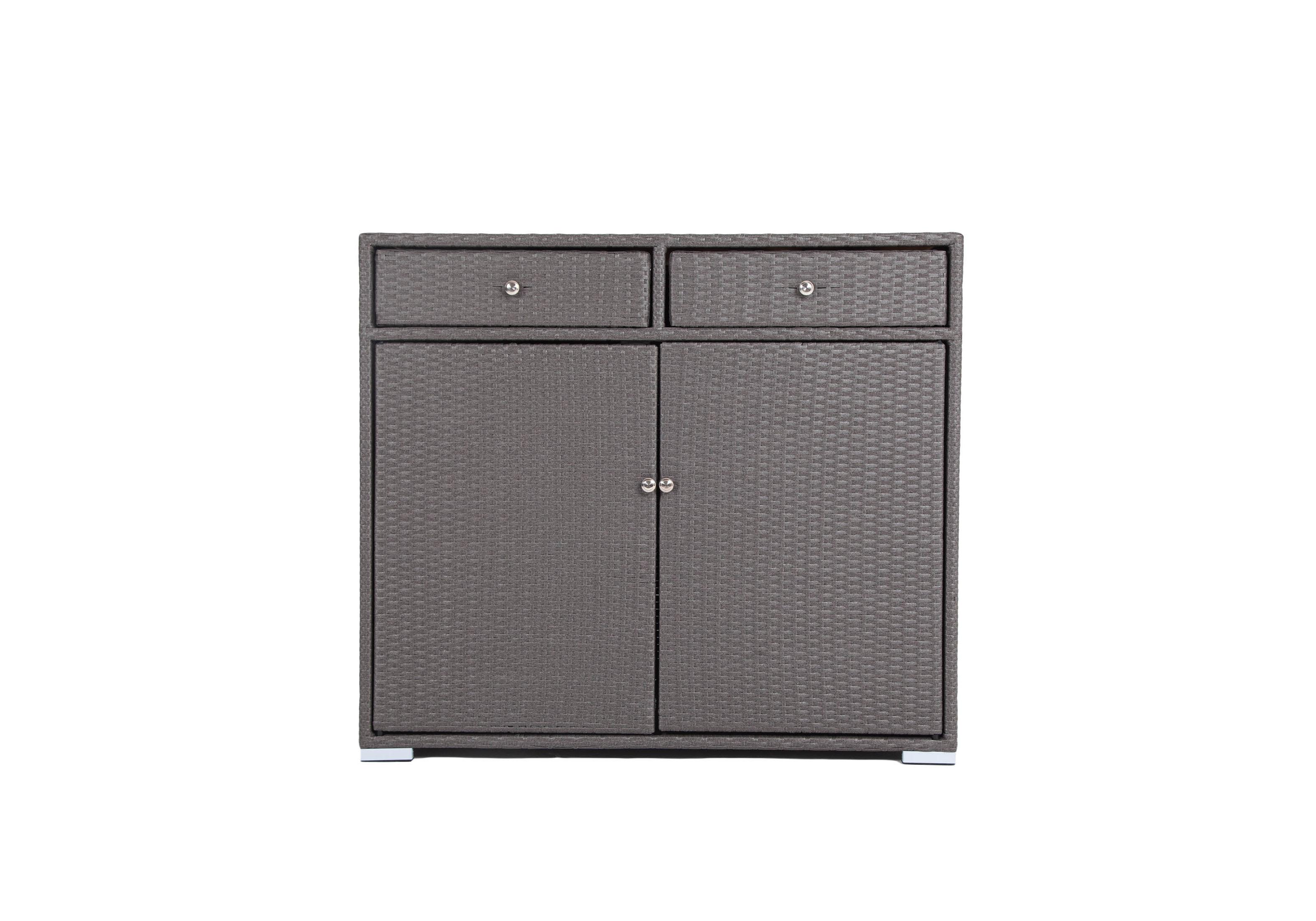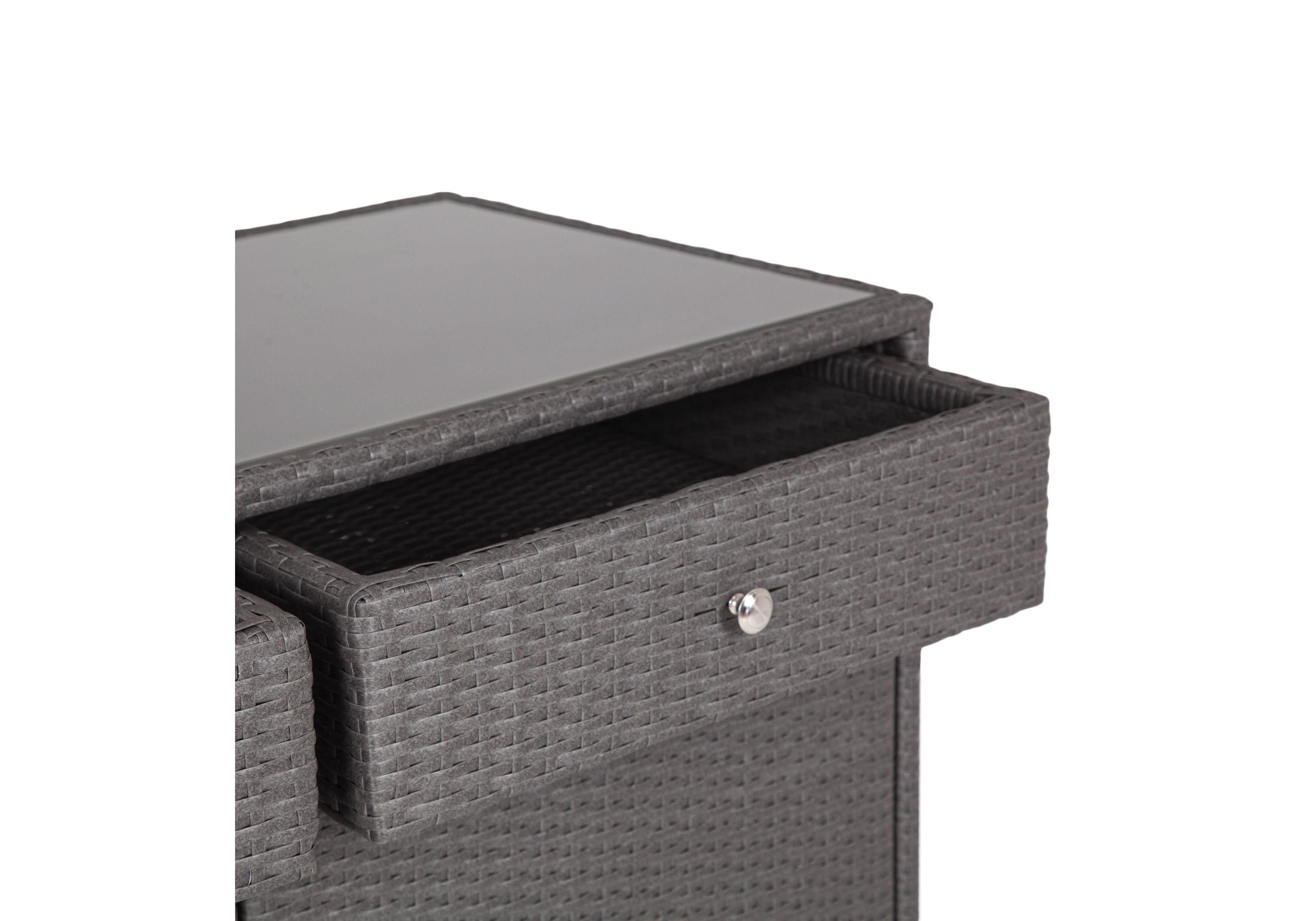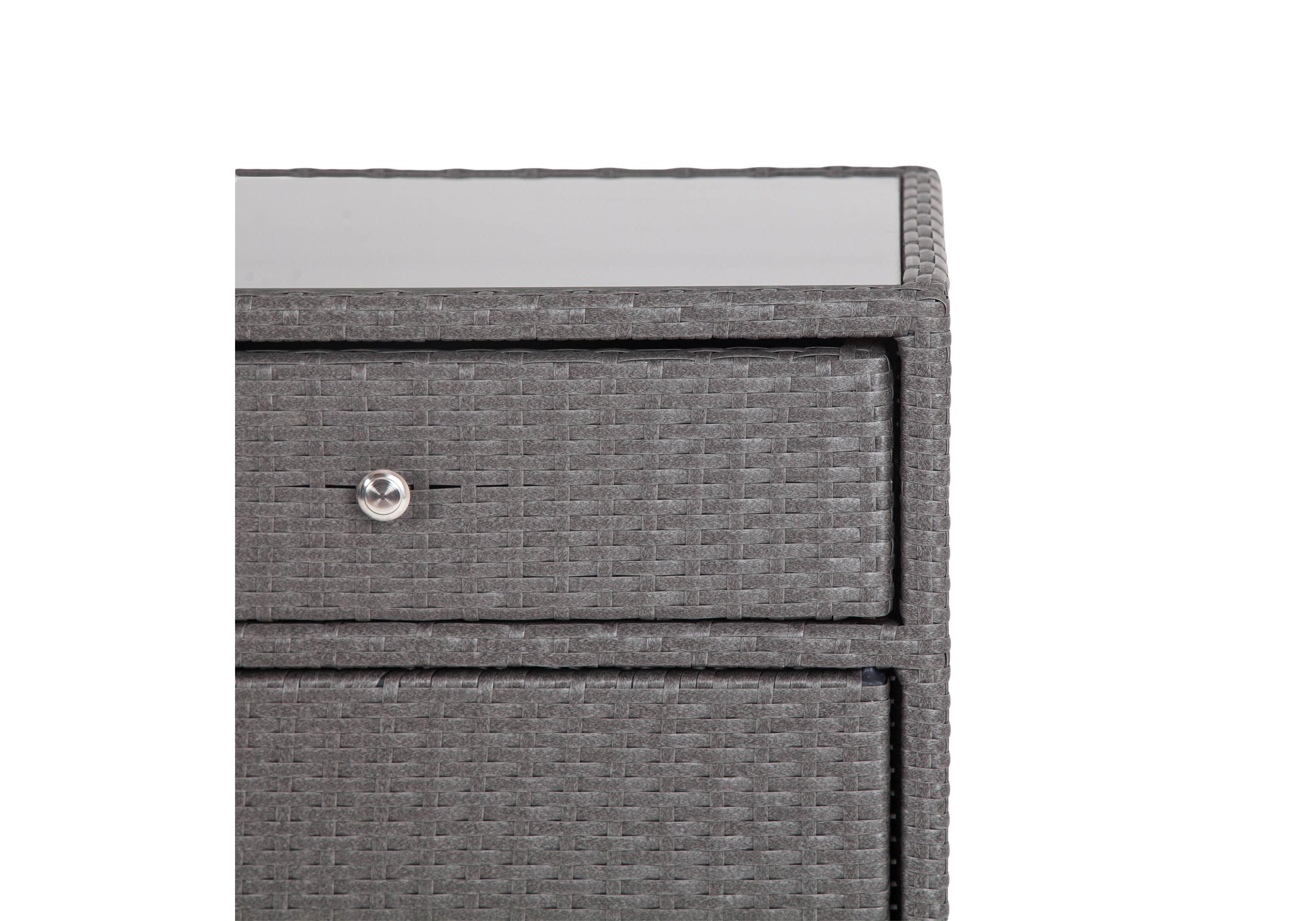 «Мальта» тумба изготовлена из алюминиевого каркаса, оплетенного плоским искусственным ротангом графитового цвета.