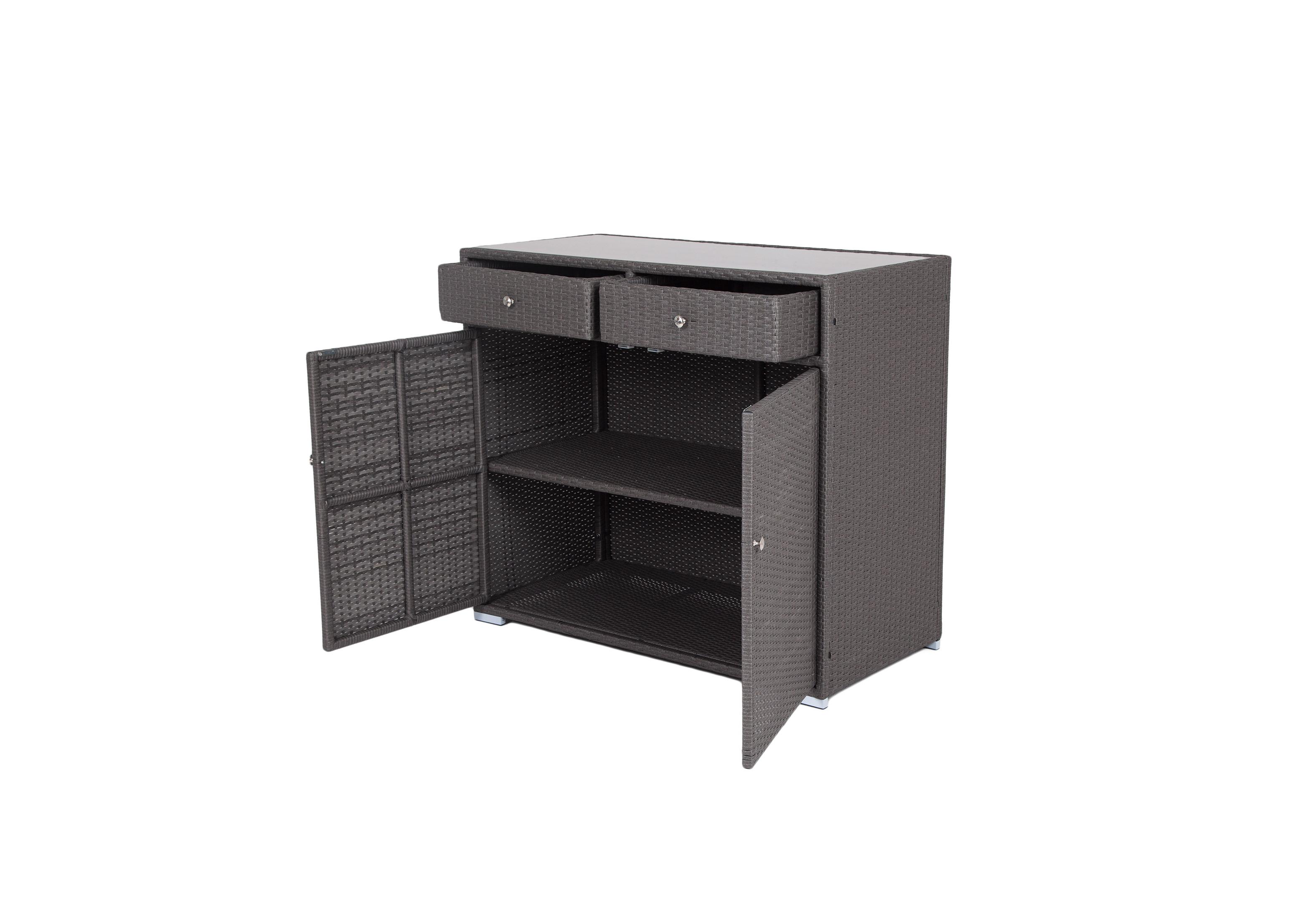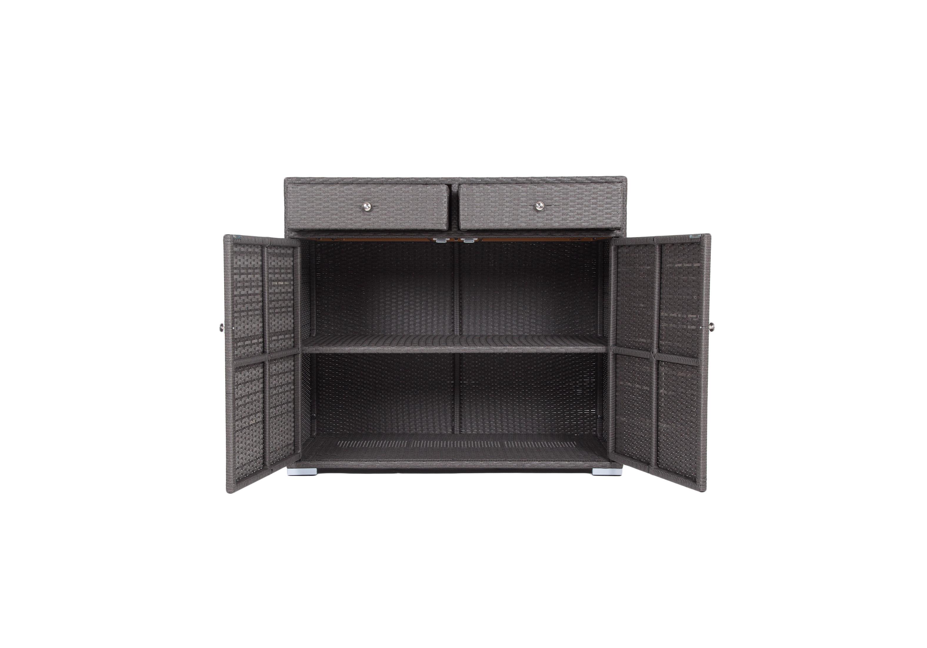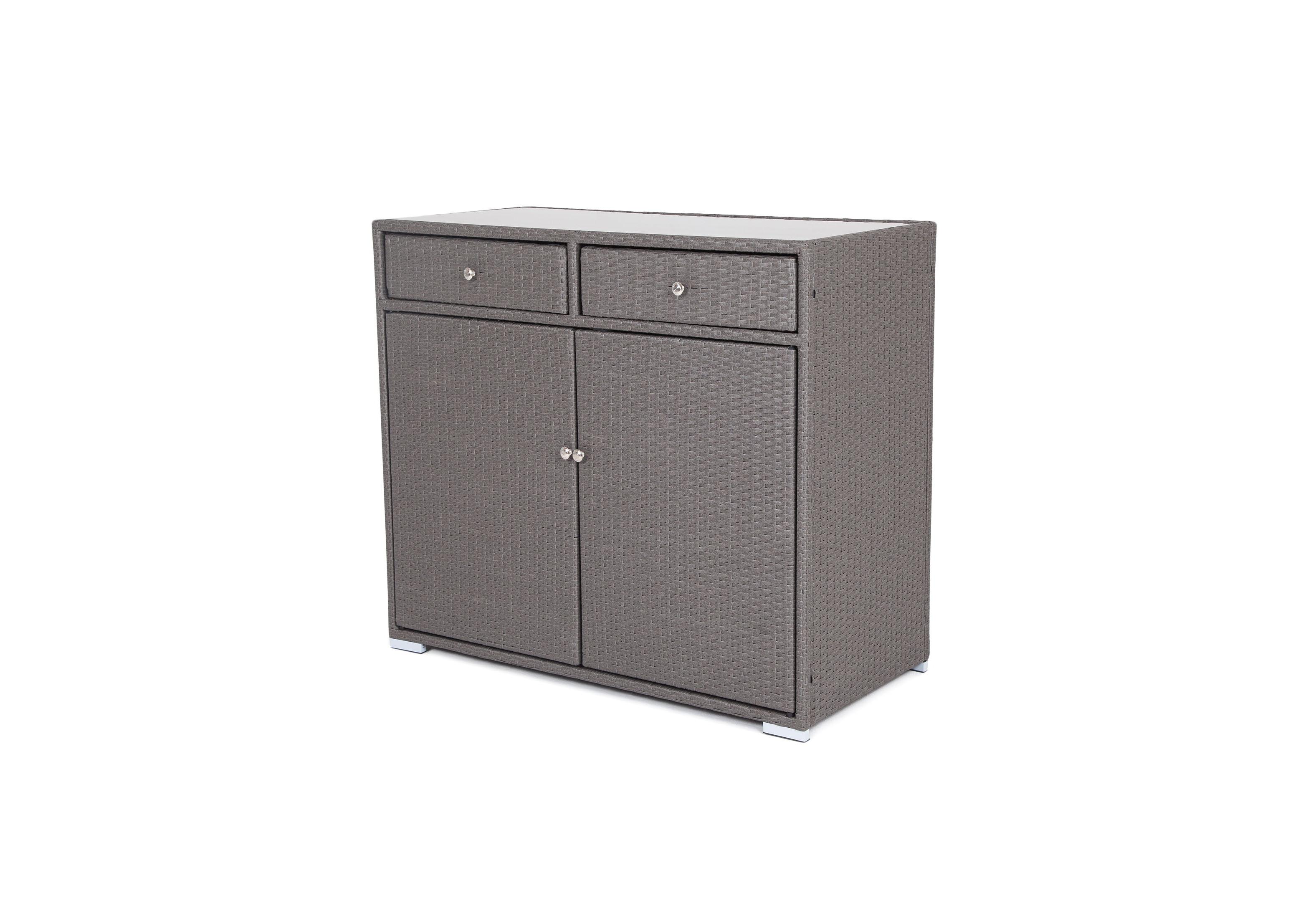 «Мальта» тумба изготовлена из алюминиевого каркаса, оплетенного плоским искусственным ротангом графитового цвета.