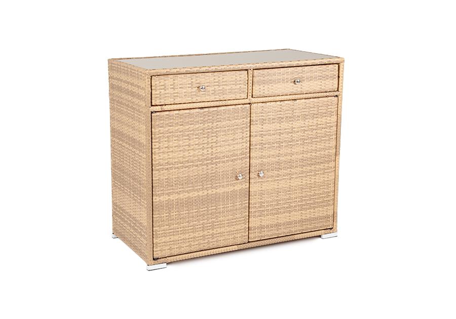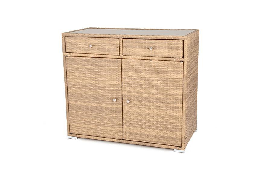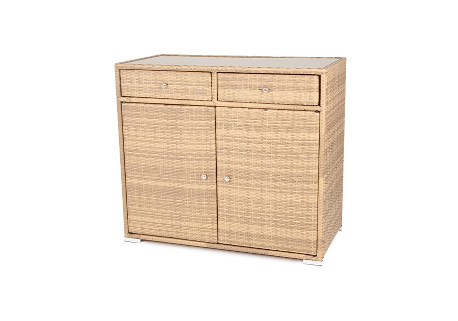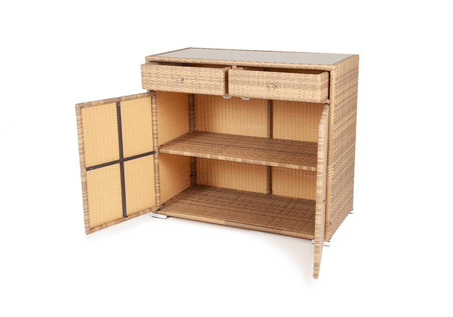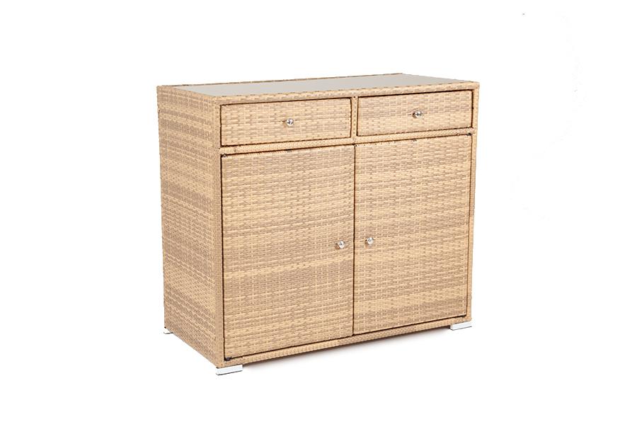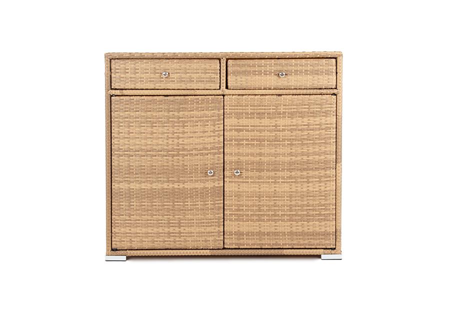 «Мальта» тумба изготовлена из алюминиевого каркаса, оплетенного плоским искусственным ротангом соломенного цвета.