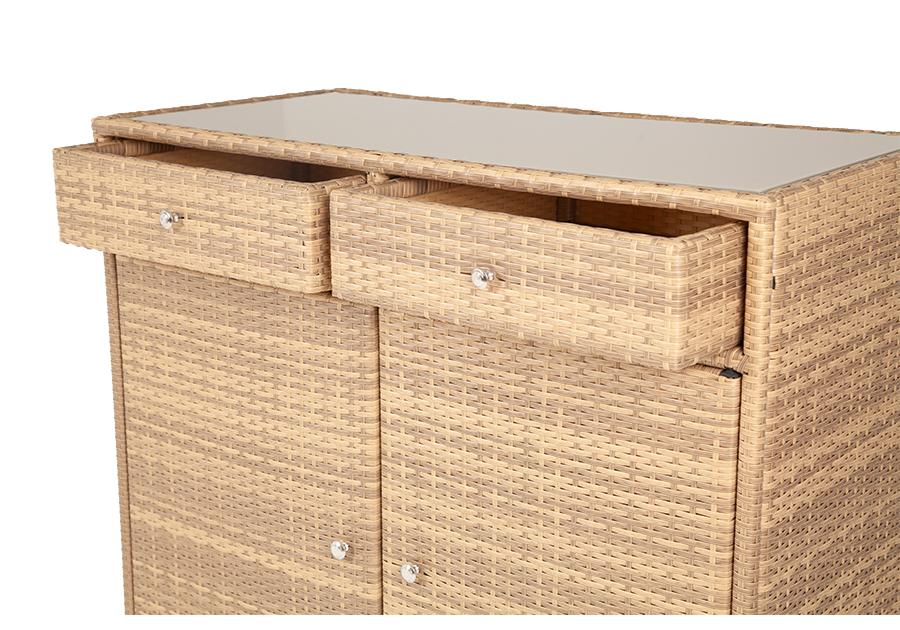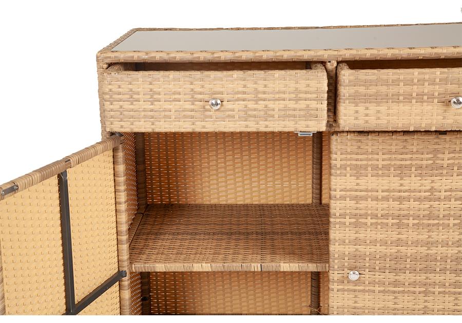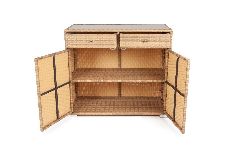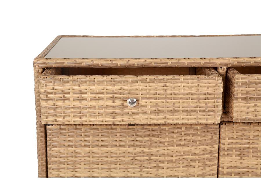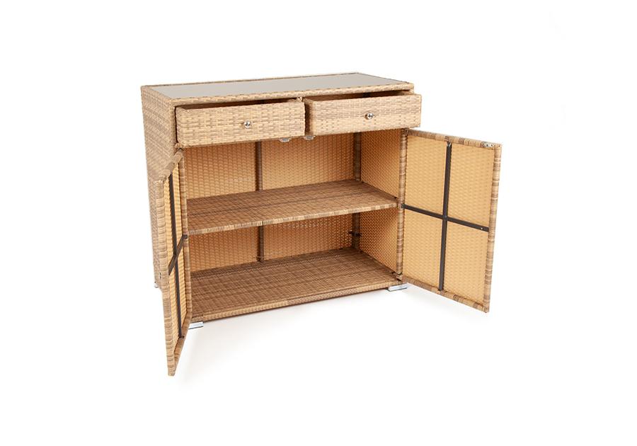 «Мальта» тумба изготовлена из алюминиевого каркаса, оплетенного плоским искусственным ротангом соломенного цвета.