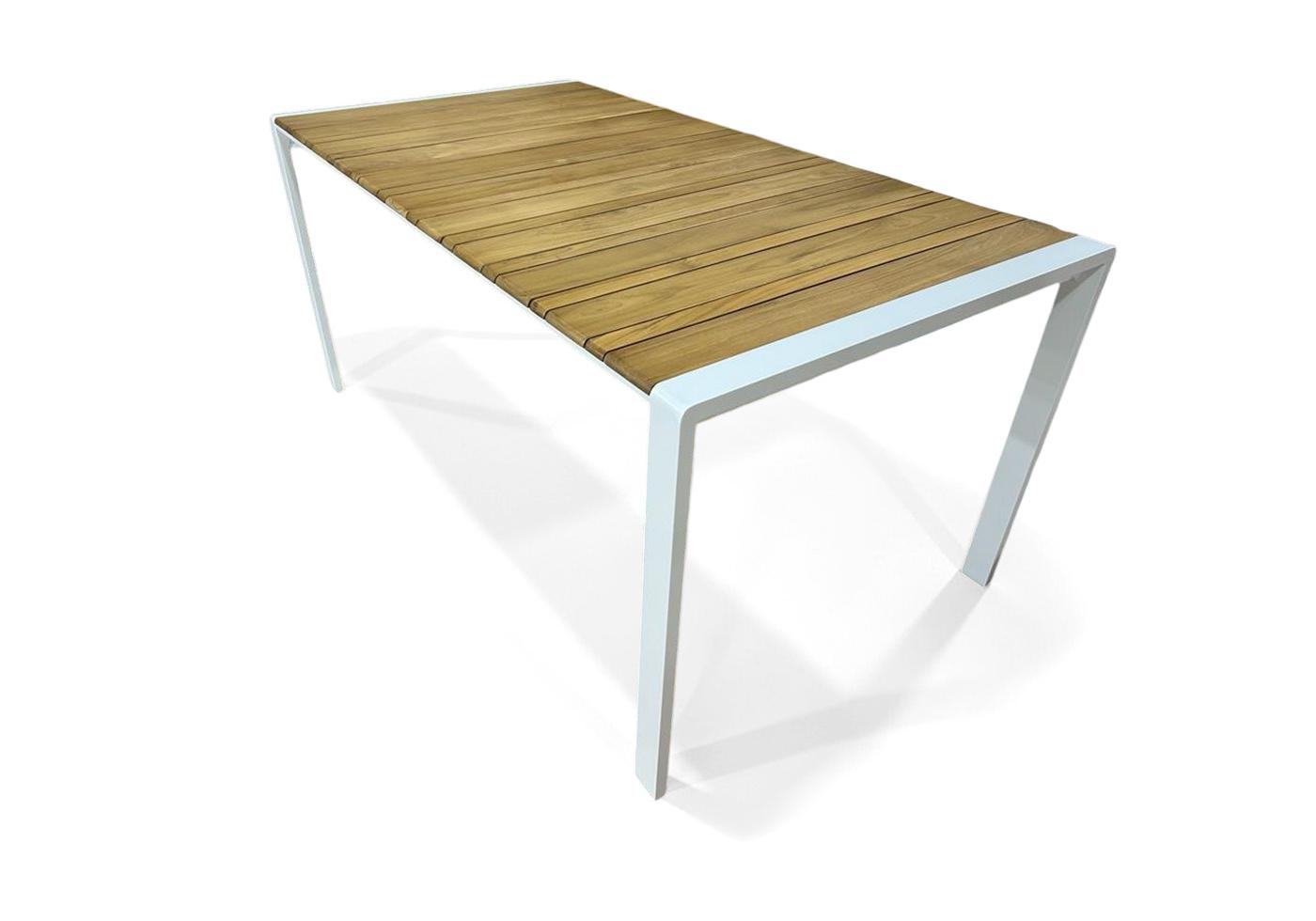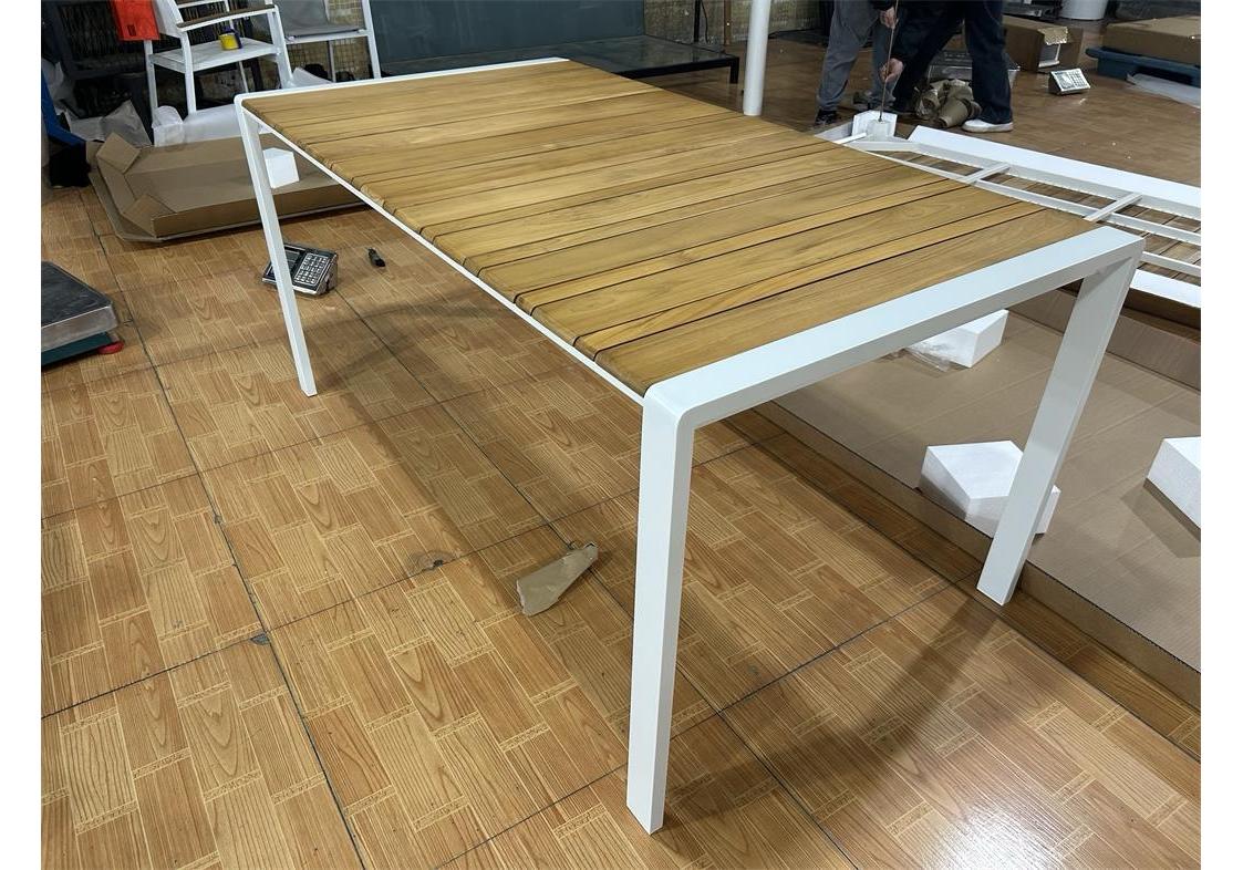 Обеденный стол «Альпы» с тиковой столешницей и алюминиевым каркасом — сочетание природной эстетики и современных инженерных решений.