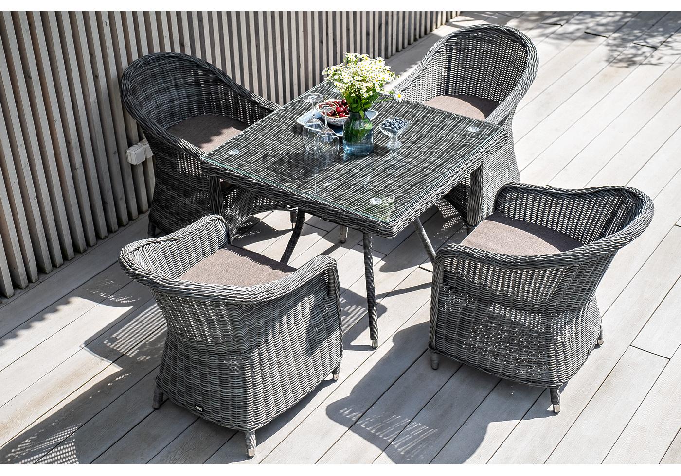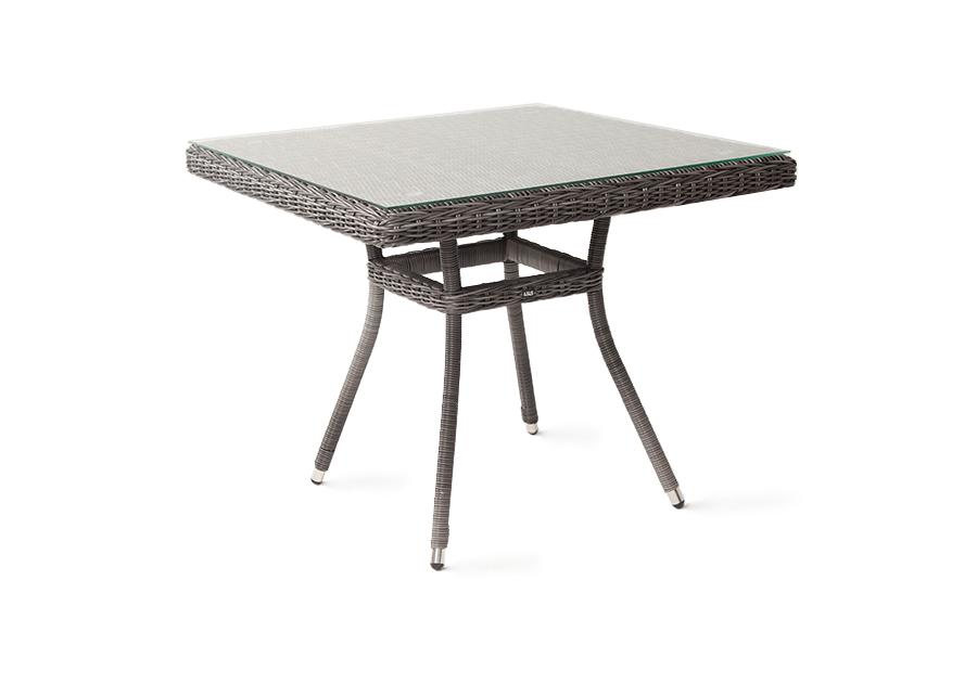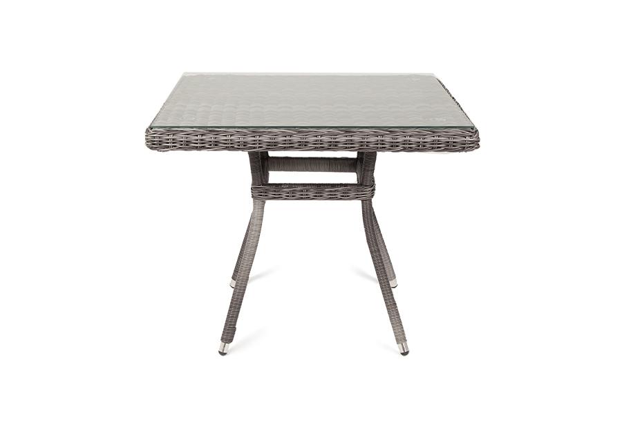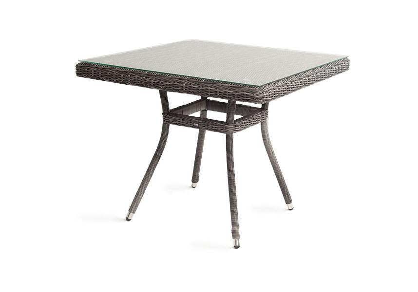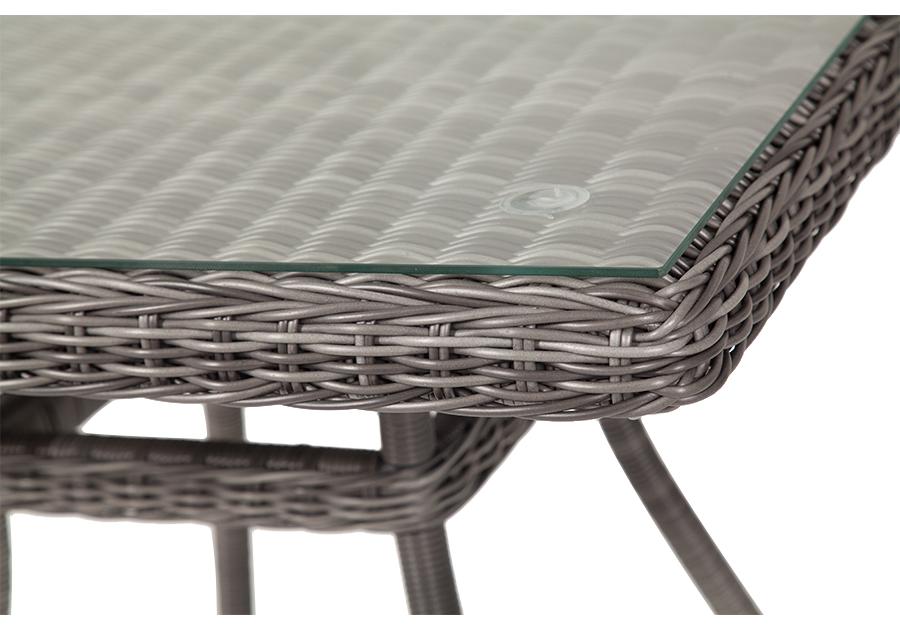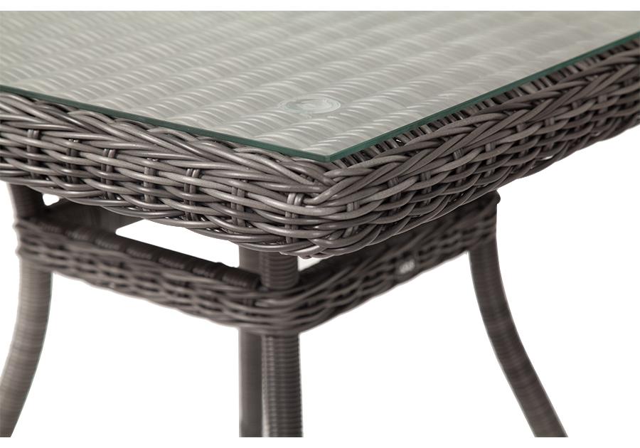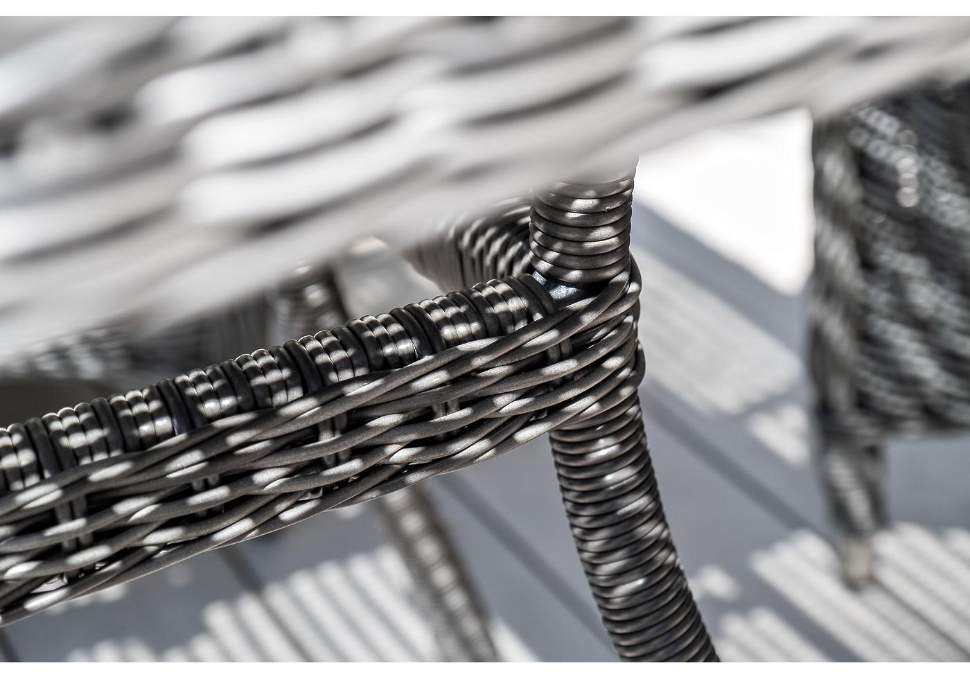 Благодаря столешнице из ударопрочного стекла толщиной 5 мм, можно не опасаясь ставить горячую посуду. Каркас изготовлен из прочного алюминия, оплетенного ротангом графитового цвета.