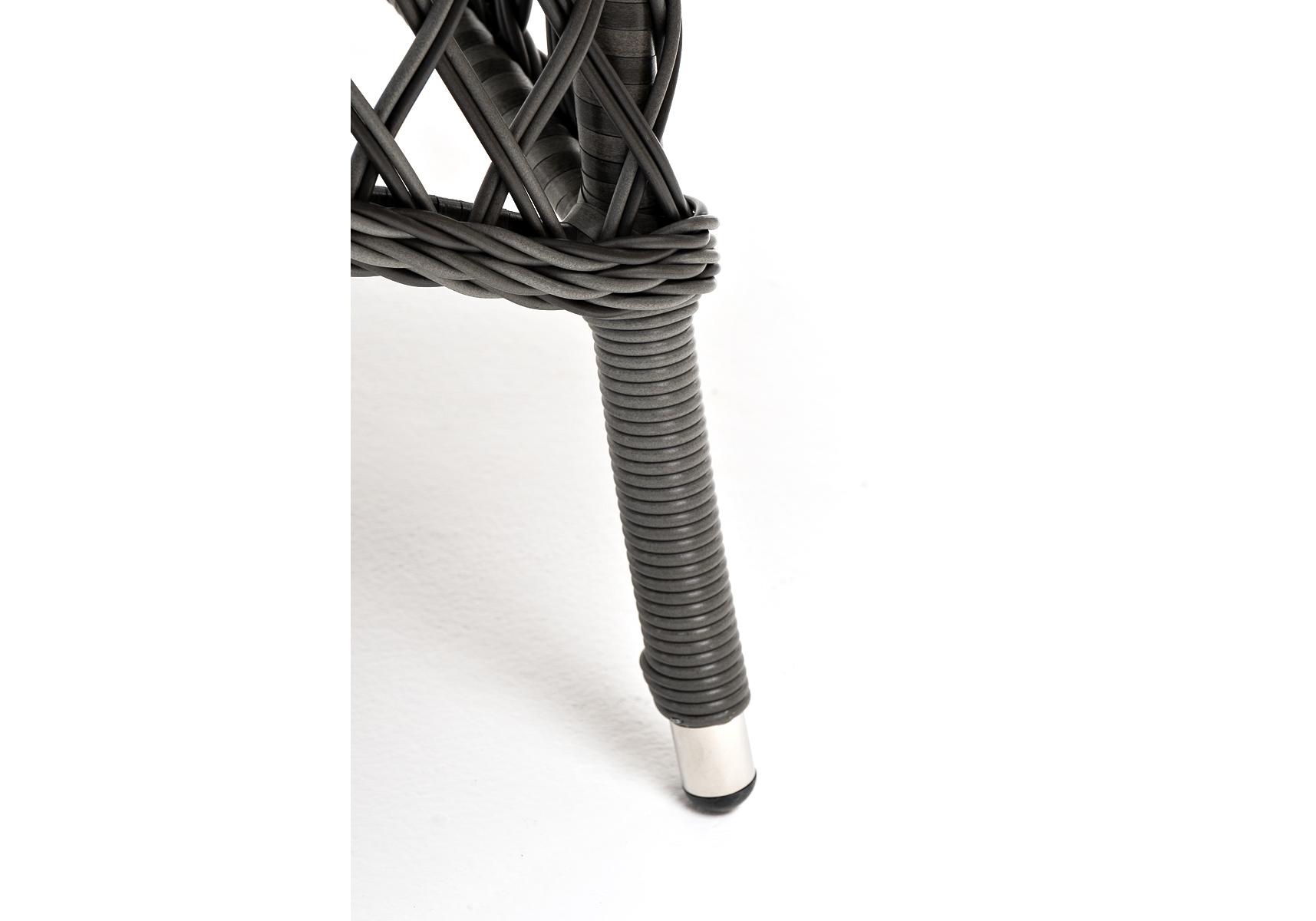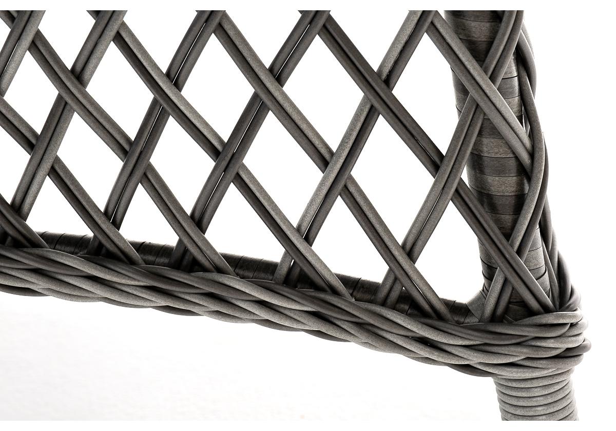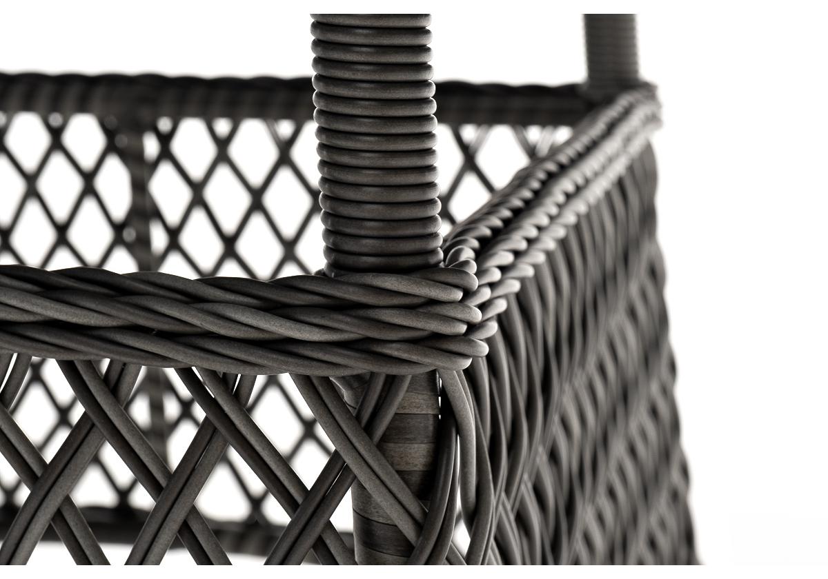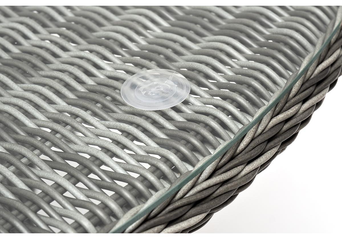 В качестве основания выступает каркас, выполненный из алюминия и оплетён круглым искусственным ротангом графитового цвета. Рабочую плоскость покрывает 5 мм столешница из ударопрочного закаленного стекла.