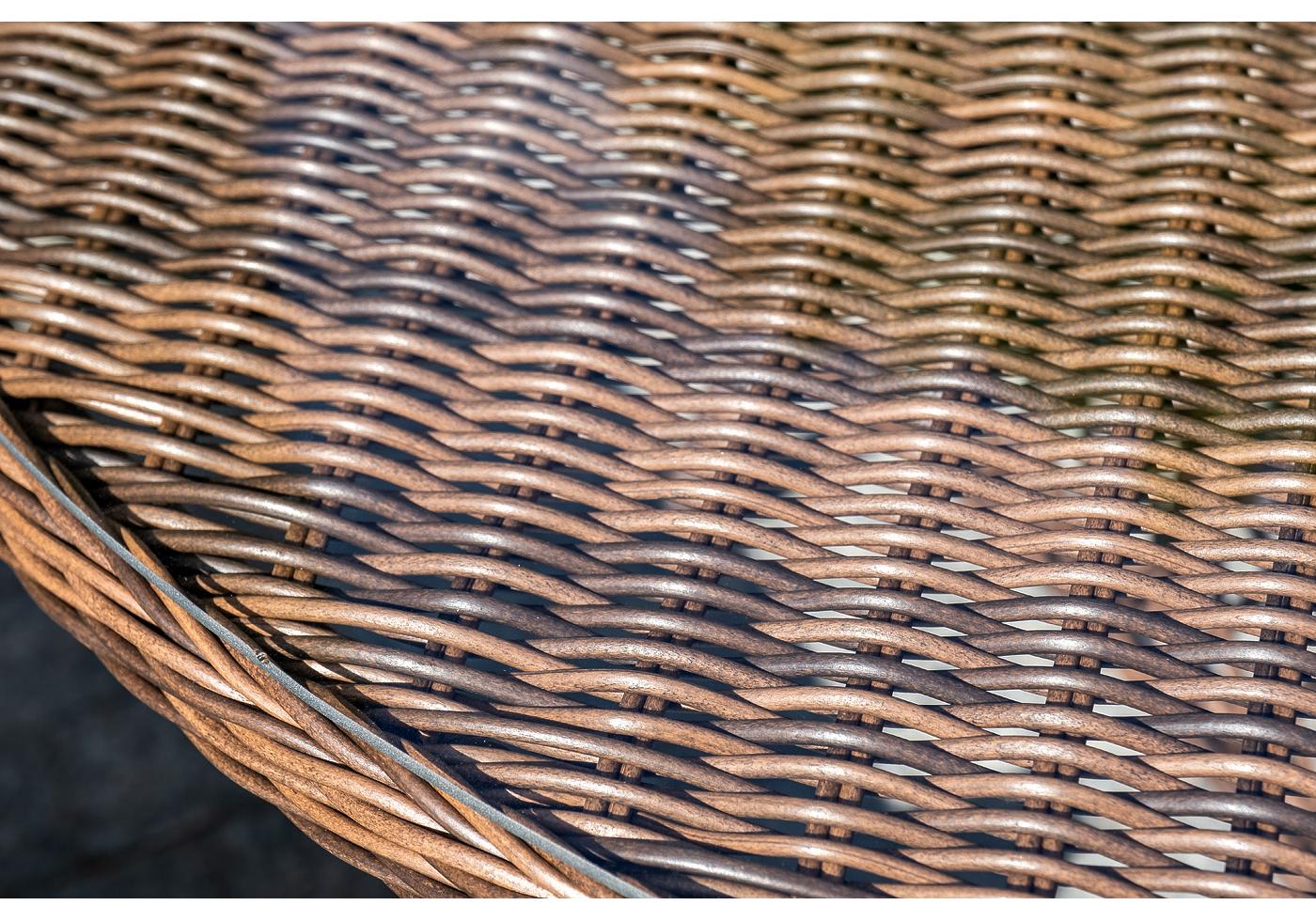 Каркас изготовлен из прочного алюминия, который вручную обвит круглым искусственным ротангом коричневого цвета.
