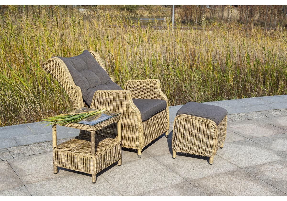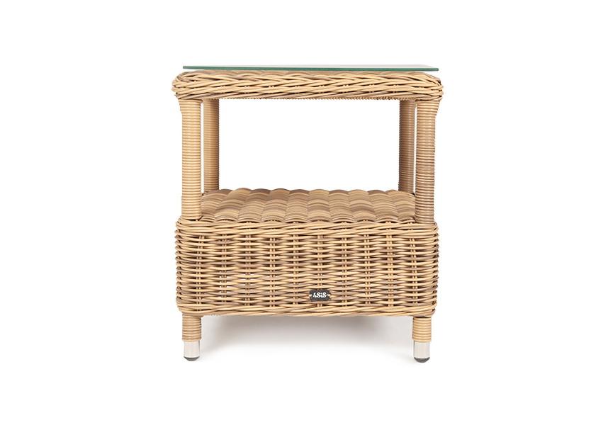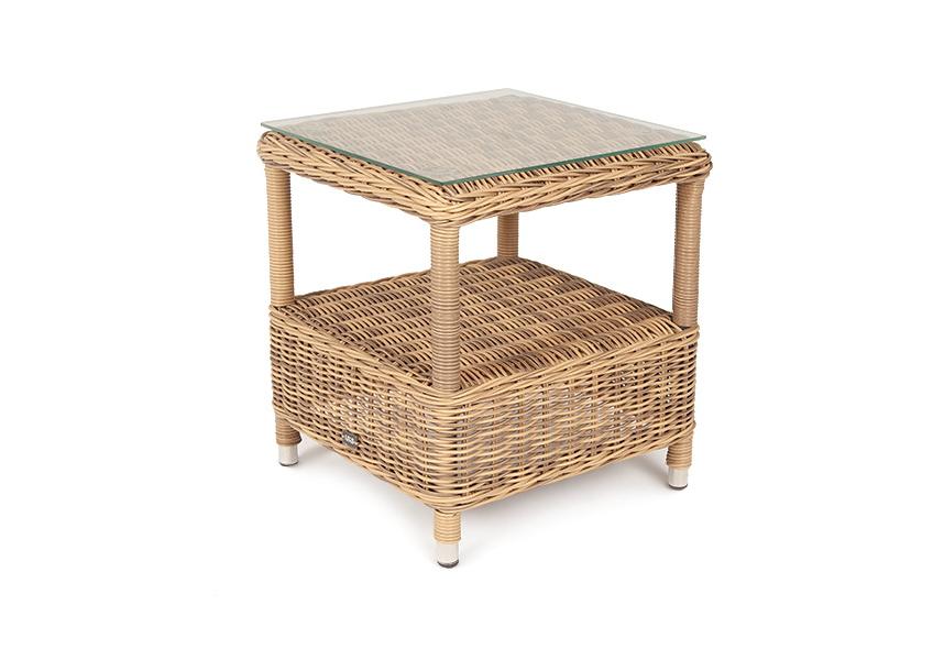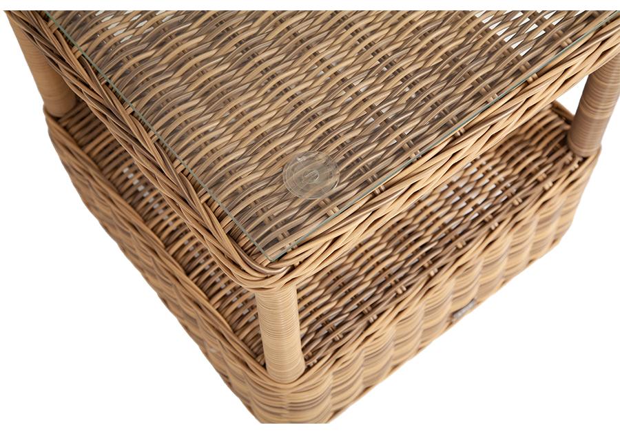 Размер модели – 450×450×520 мм. Ее основу составляет каркас из высококачественного алюминия. Ручное плетение выполнено из круглого искусственного ротанга. Столик имеет дополниельную полку.