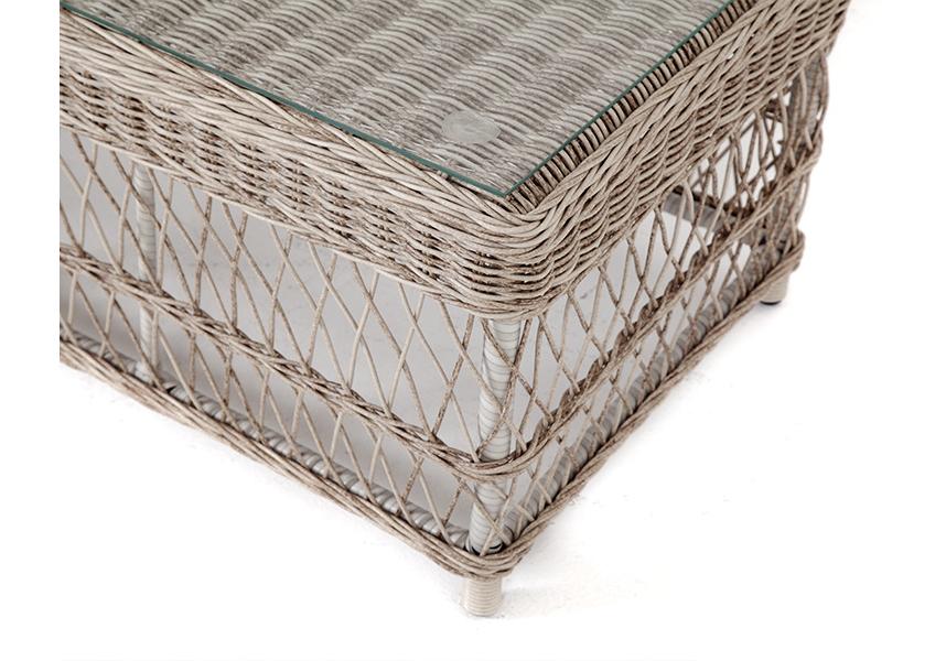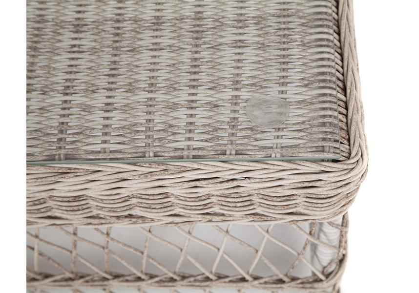 Каркас столика изготовлен из алюминия, вручную оплетенного круглым искусственным ротангом.