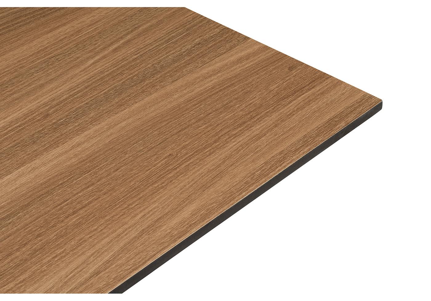 Двойное подстолье изготовлено из стали, столешница - из высококачественного монолитного компакт-пластик HPL, толщиной 12 мм, цвет «дуб».