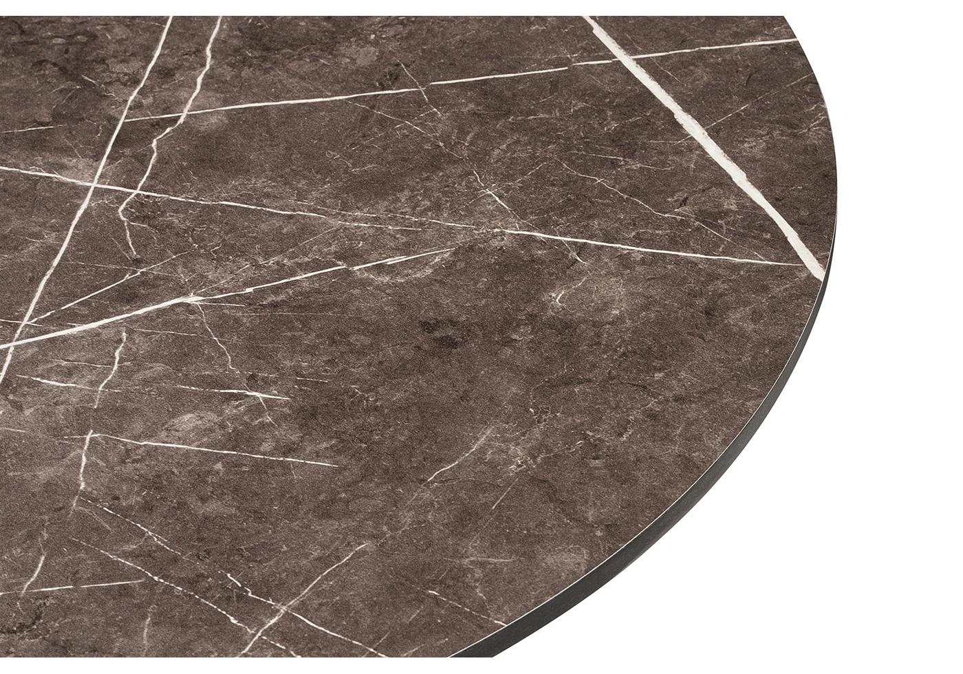 Круглый стол «Каффе» со столешницей из HPL в цвете «серый мрамор». Это высококачественный ударопрочный компакт-пластик, обладающий низкой пористостью, что предотвращает впитывание жидкостей, поэтому столы из HPL идеально подходит для обеденных зон. Толщина столешницы – 12 мм.