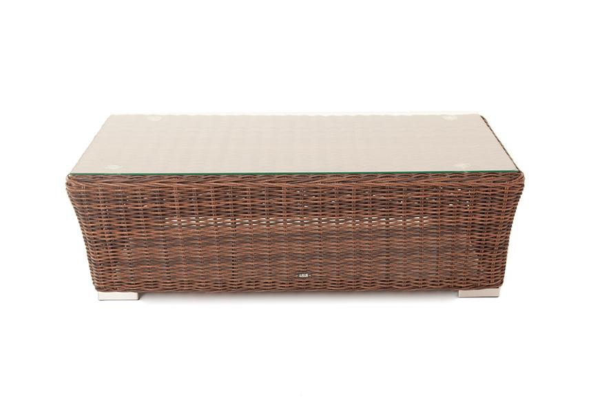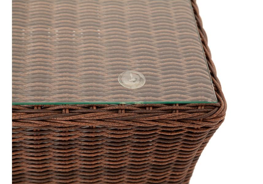 Размер модели – 1100×660×340 мм. Алюминиевый каркас принимает на себя основную нагрузку и отвечает за надежную фиксацию всей конструкции. Искусственным ротангом полностью оплетен каркас, включая верхнюю поверхность столика. Ротанг имеет круглое плетение коричневого цвета.