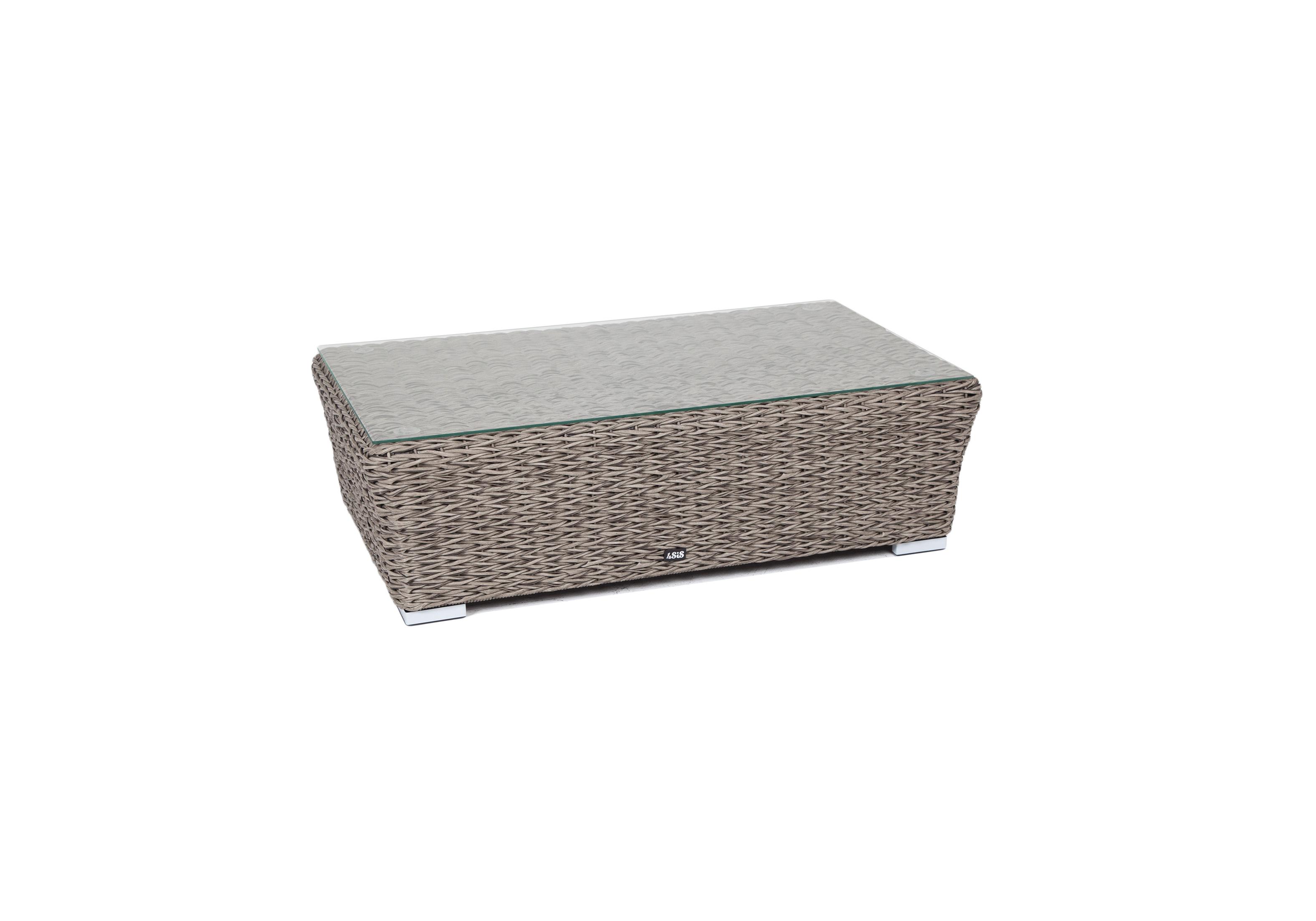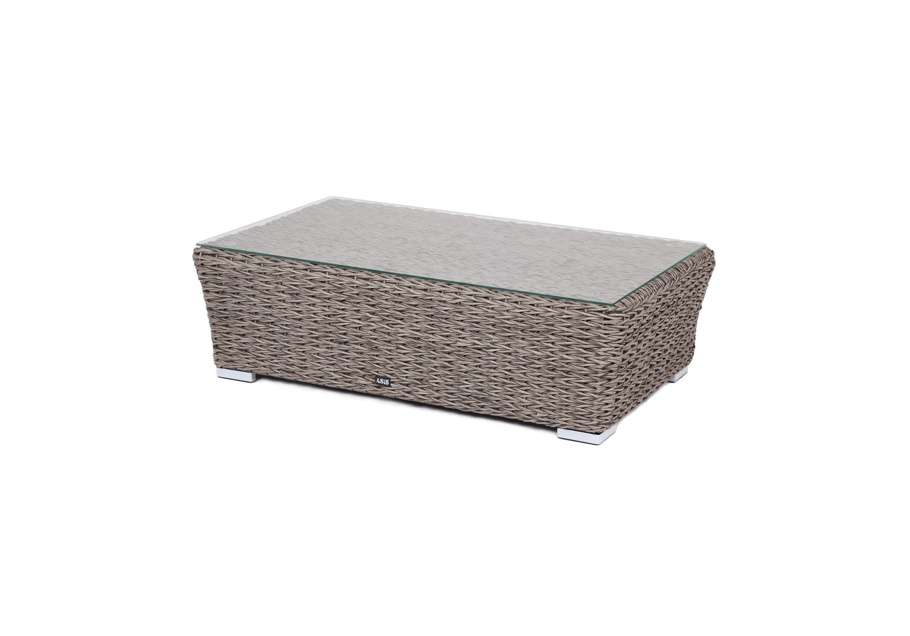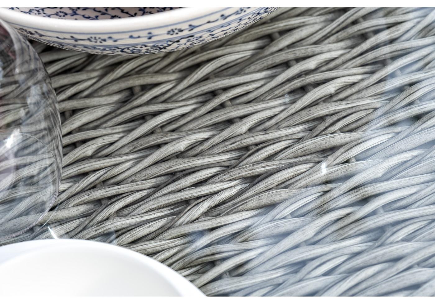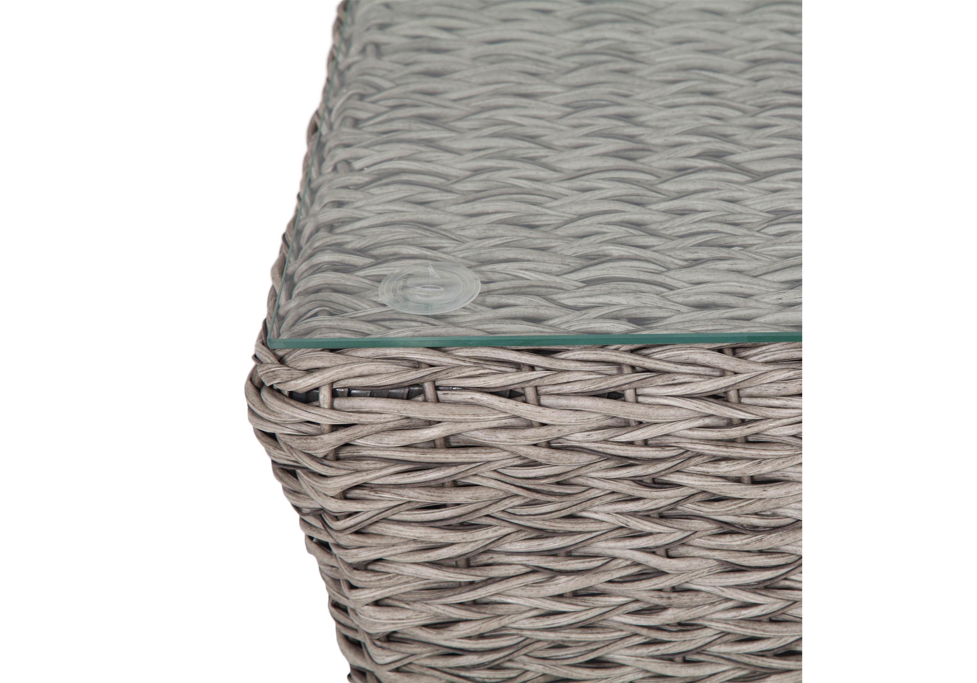 Журнальный столик «Капучино» из искусственного ротанга вида "гиацинт" серого оттенка обладает прочным каркасом, изготовленным из алюминия, оплетка которого произведена ручным способом. Поверхность защищена столешницей из 5 мм стекла.