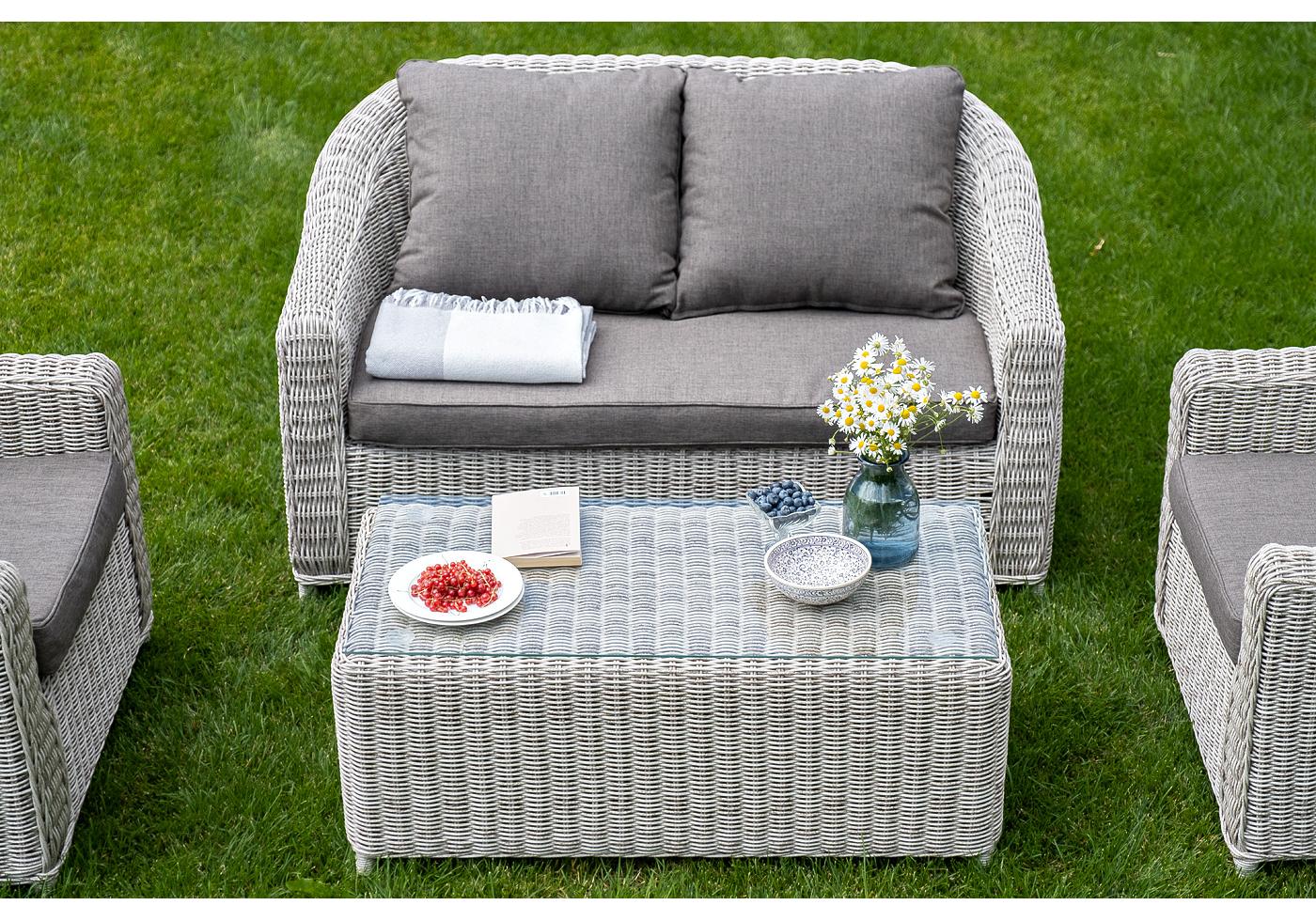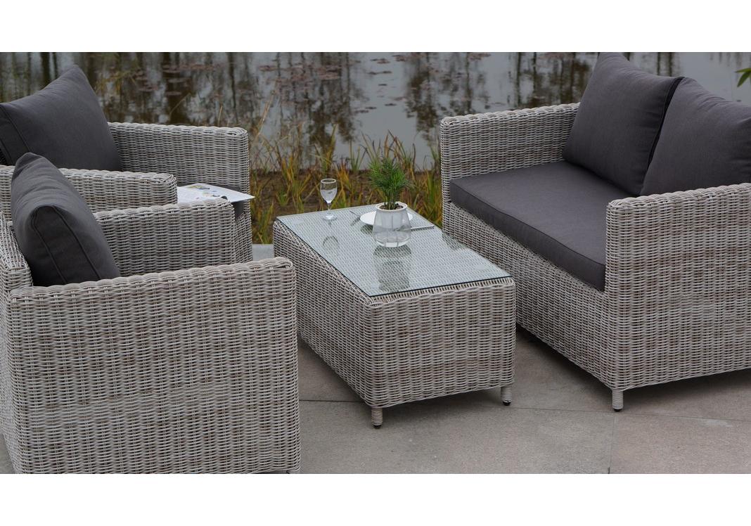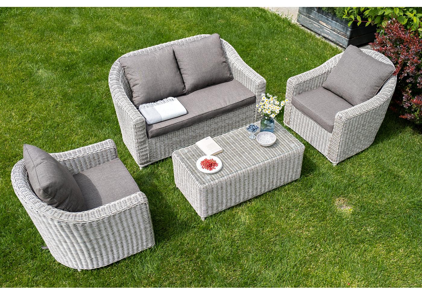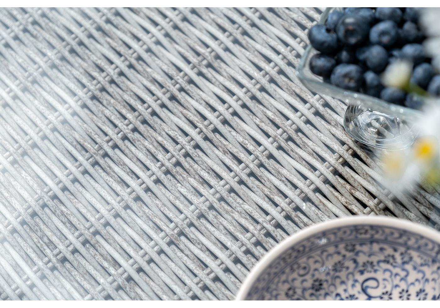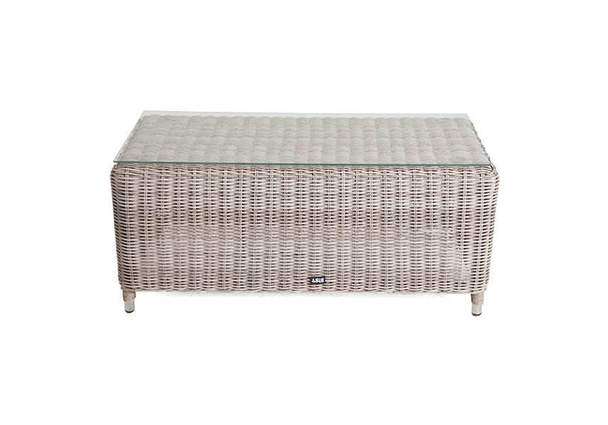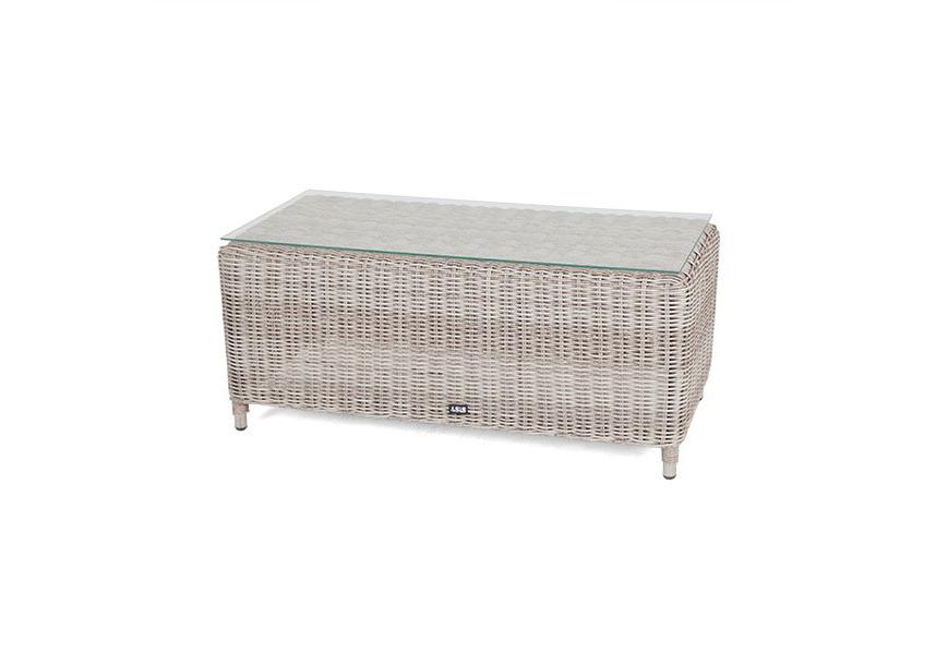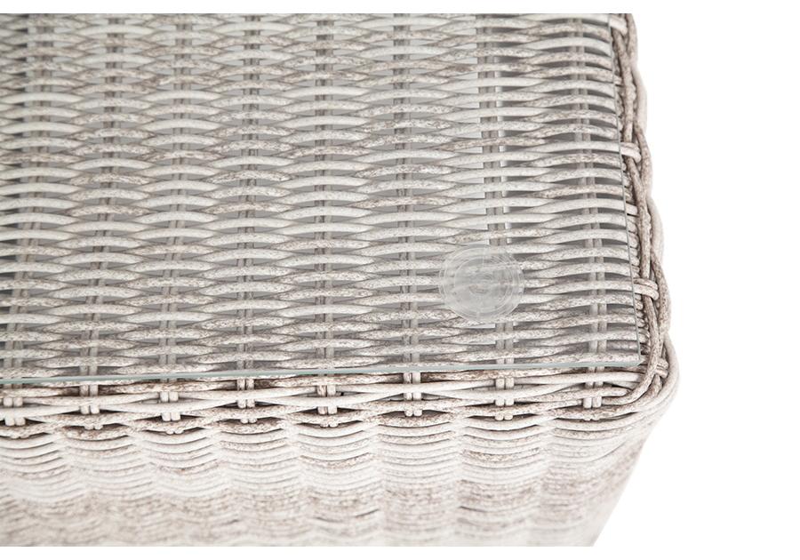 Журнальный столик «Кон Панна» изготовлен из алюминиевого каркаса, вручную оплетенного круглым искусственным ротангом бежевого оттенка.