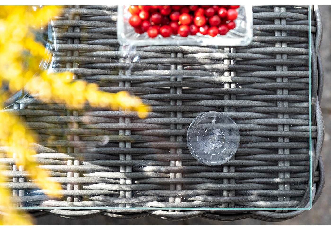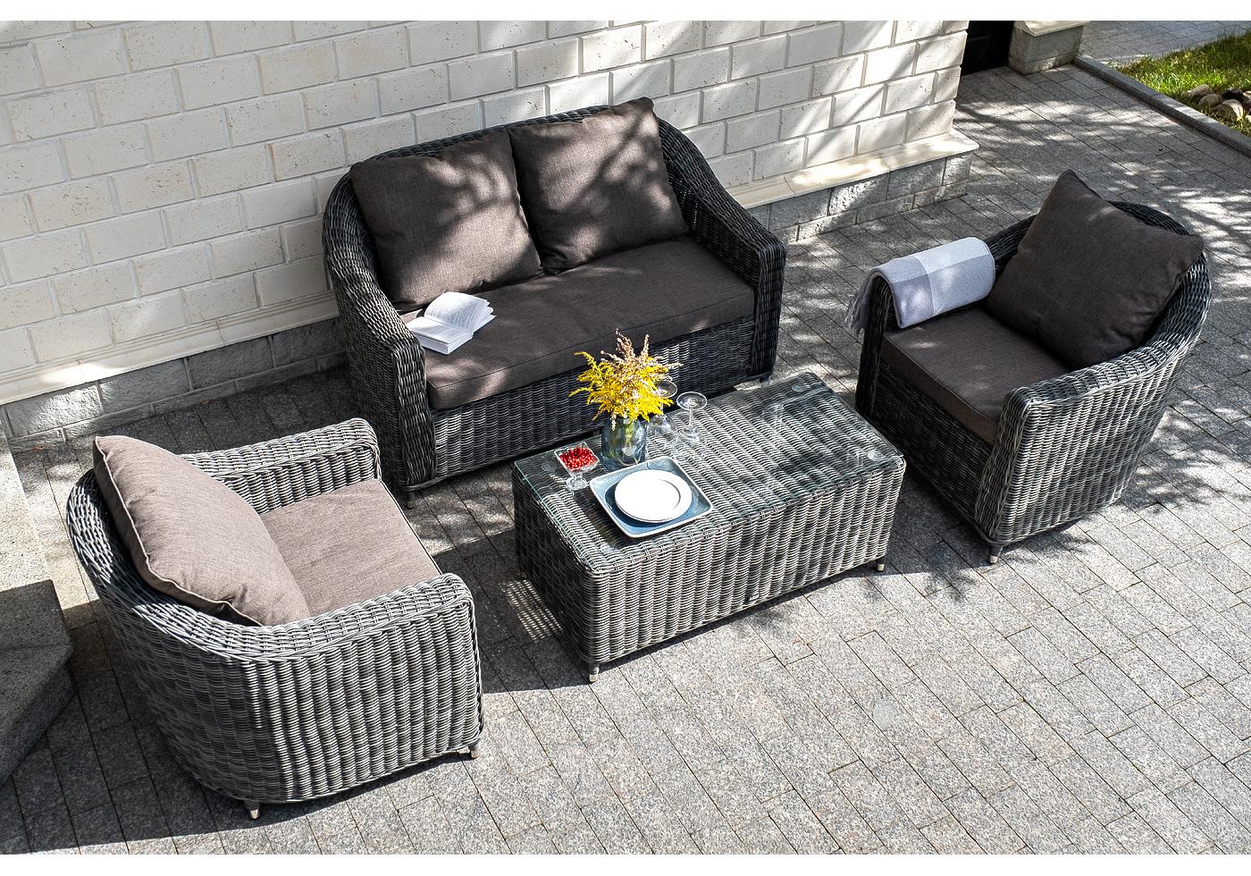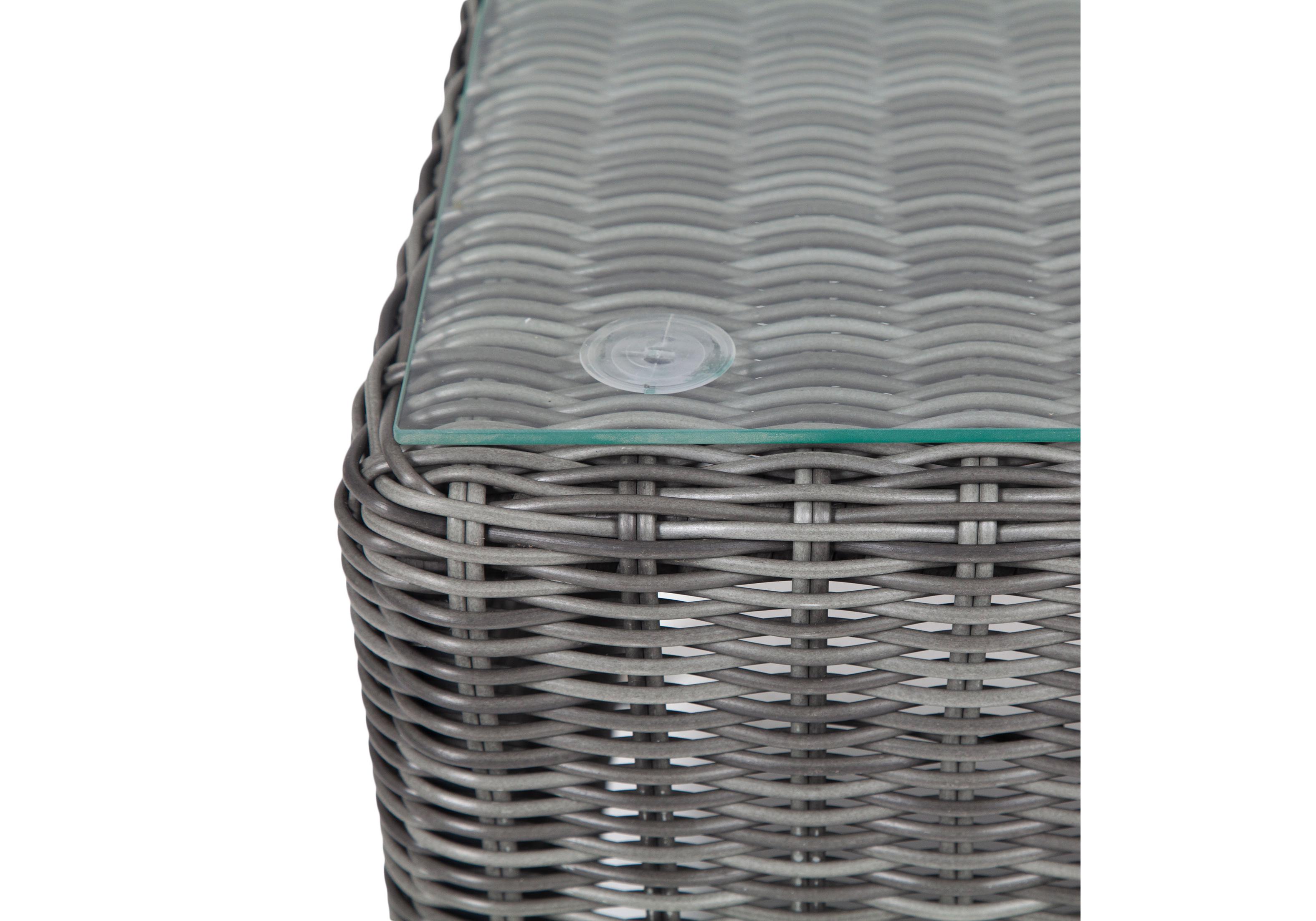 В основе мебели находится алюминиевый каркас высокой прочности. Декоративной составляющей является ручная круглая оплетка, которая выполнена из искусственного ротанга. Столик представлен в цвете "графит".
