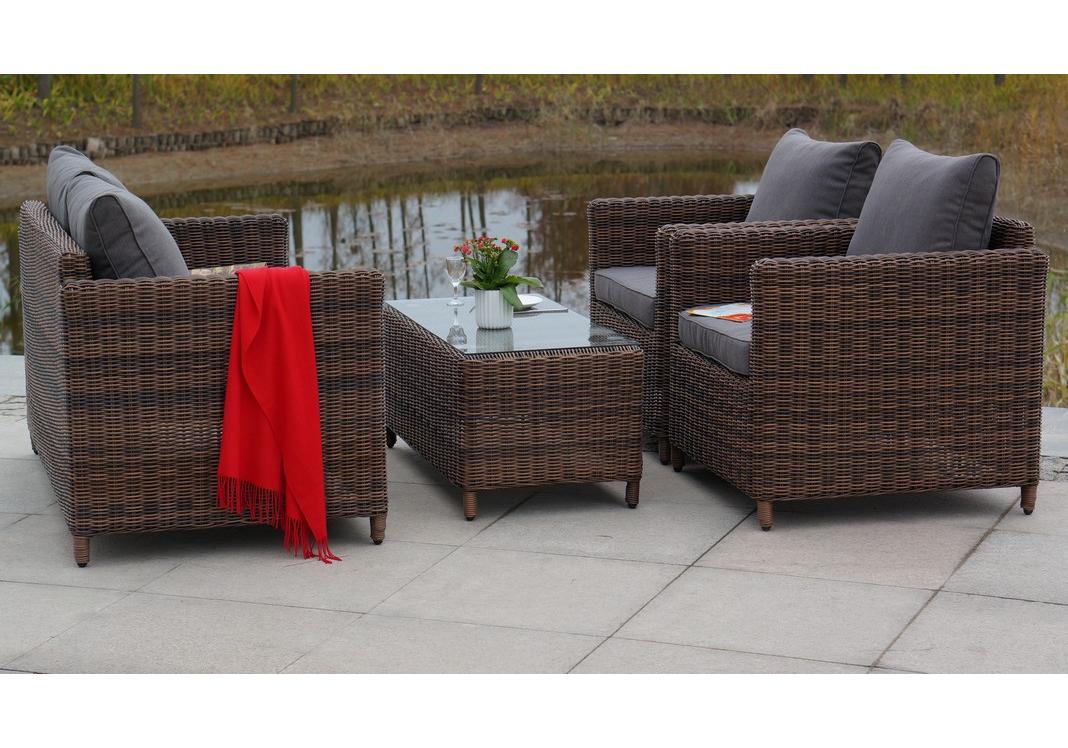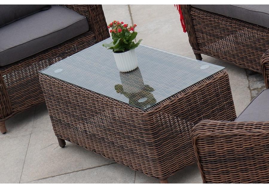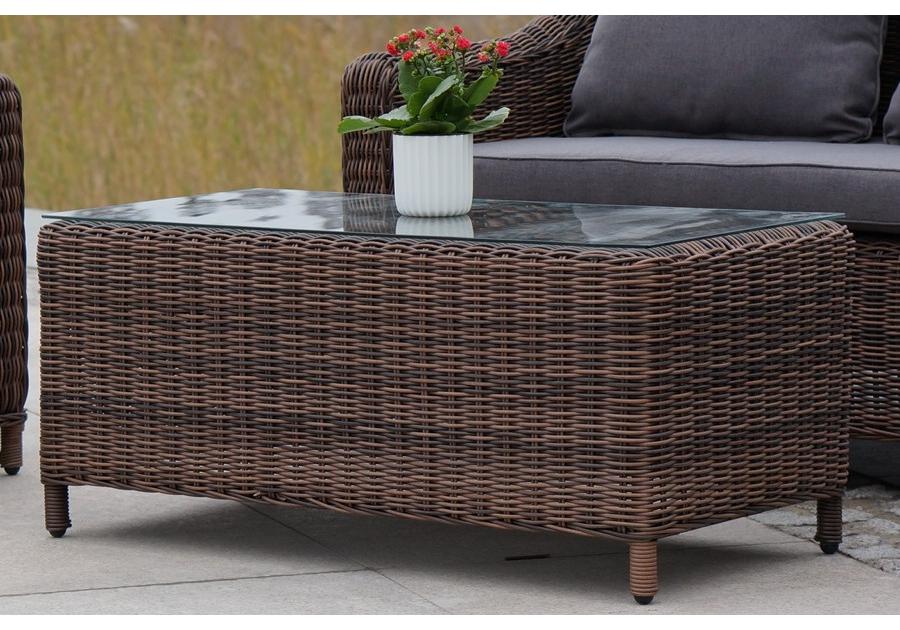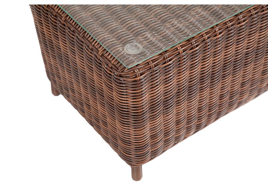 В основе мебели находится алюминиевый каркас высокой прочности. Декоративной составляющей является ручная круглая оплетка, которая выполнена из искусственного ротанга. Столик представлен в шоколадном цвете.