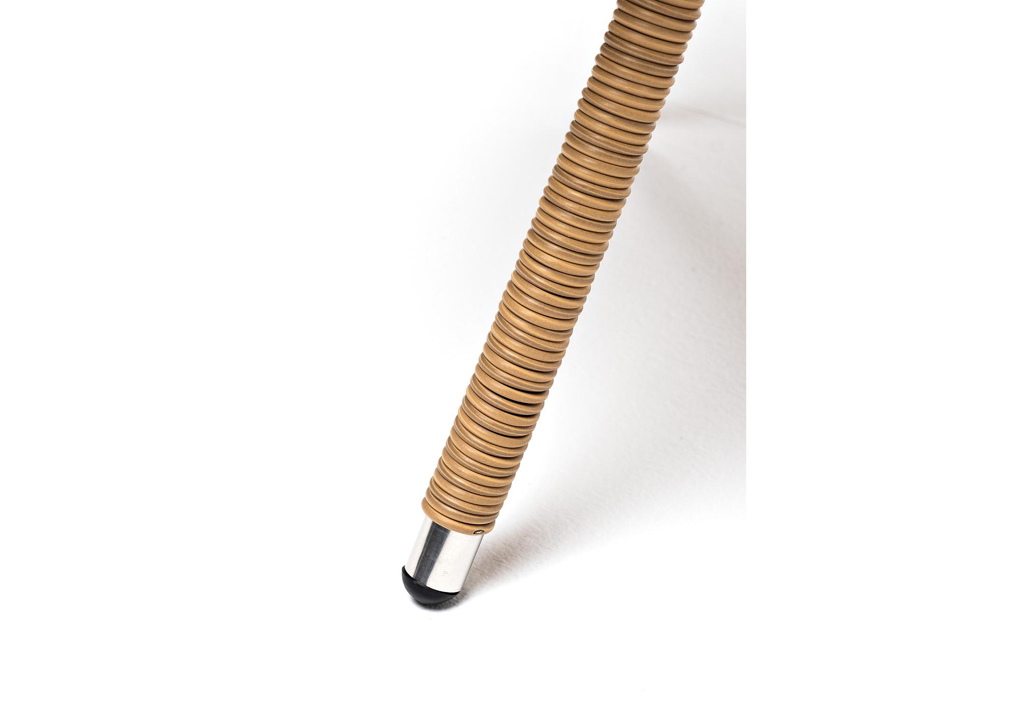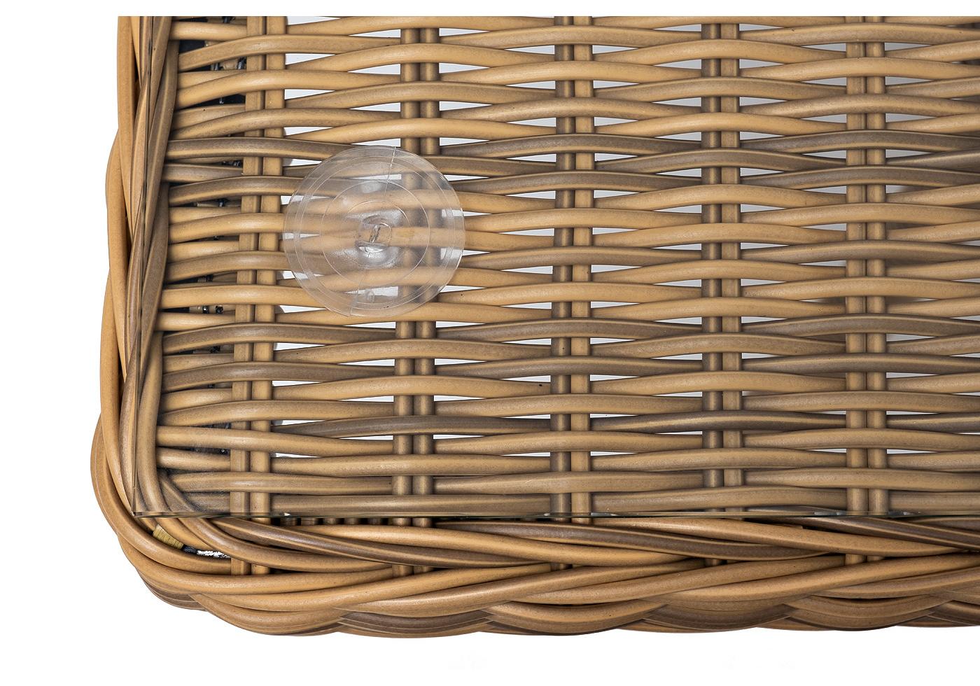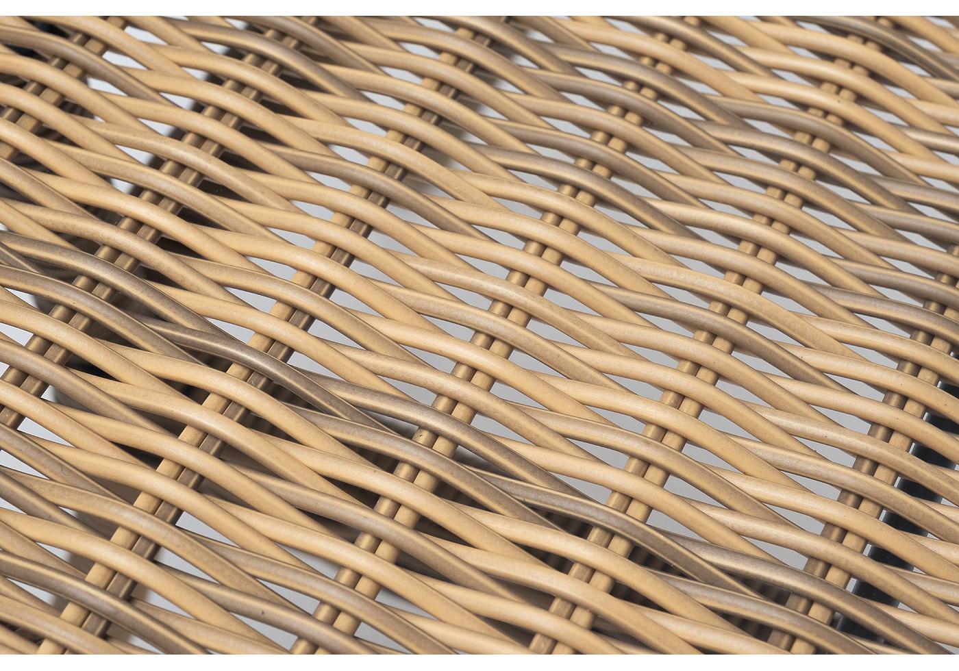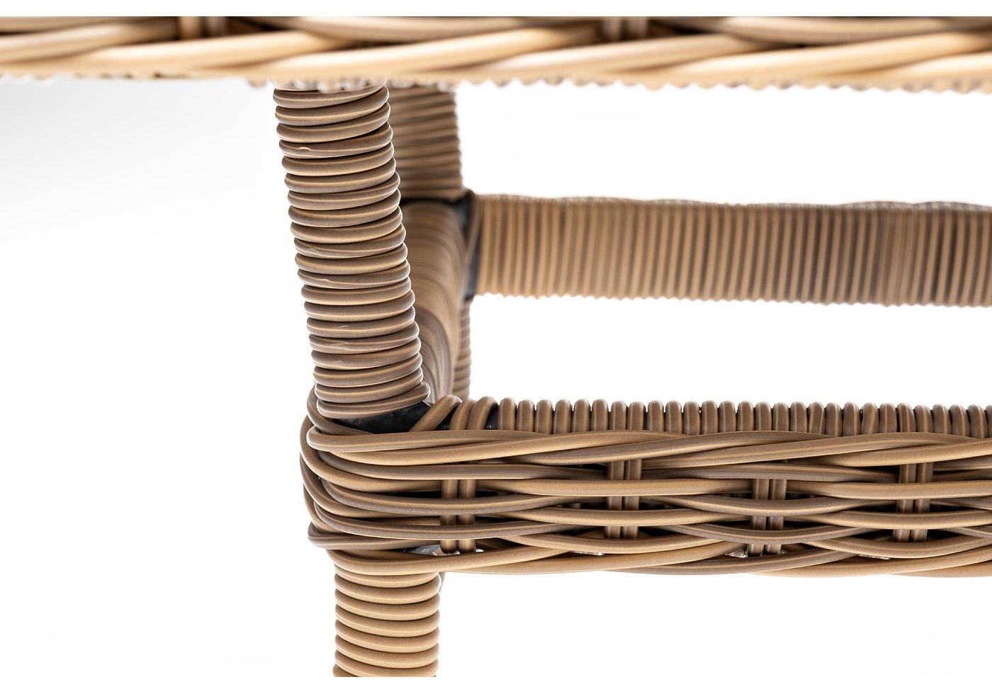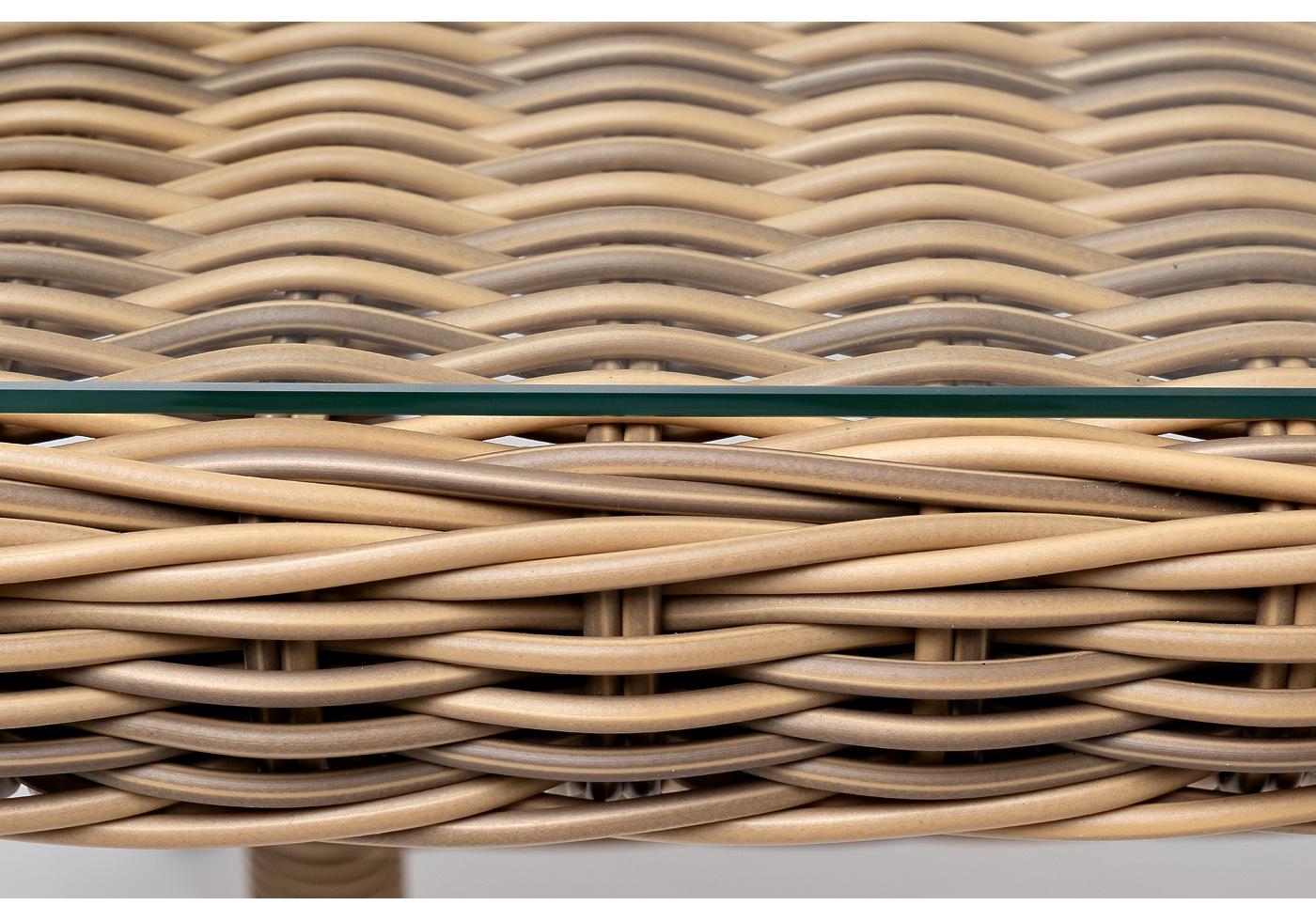 Каркас произведен из прочного алюминия, оплетка которого, выполнена вручную ротангом соломенного цвета. Поверхность защищает стеклянная столешница, толщиной 5 мм.