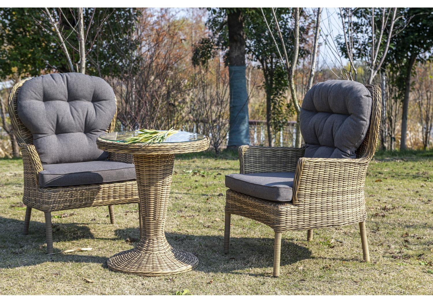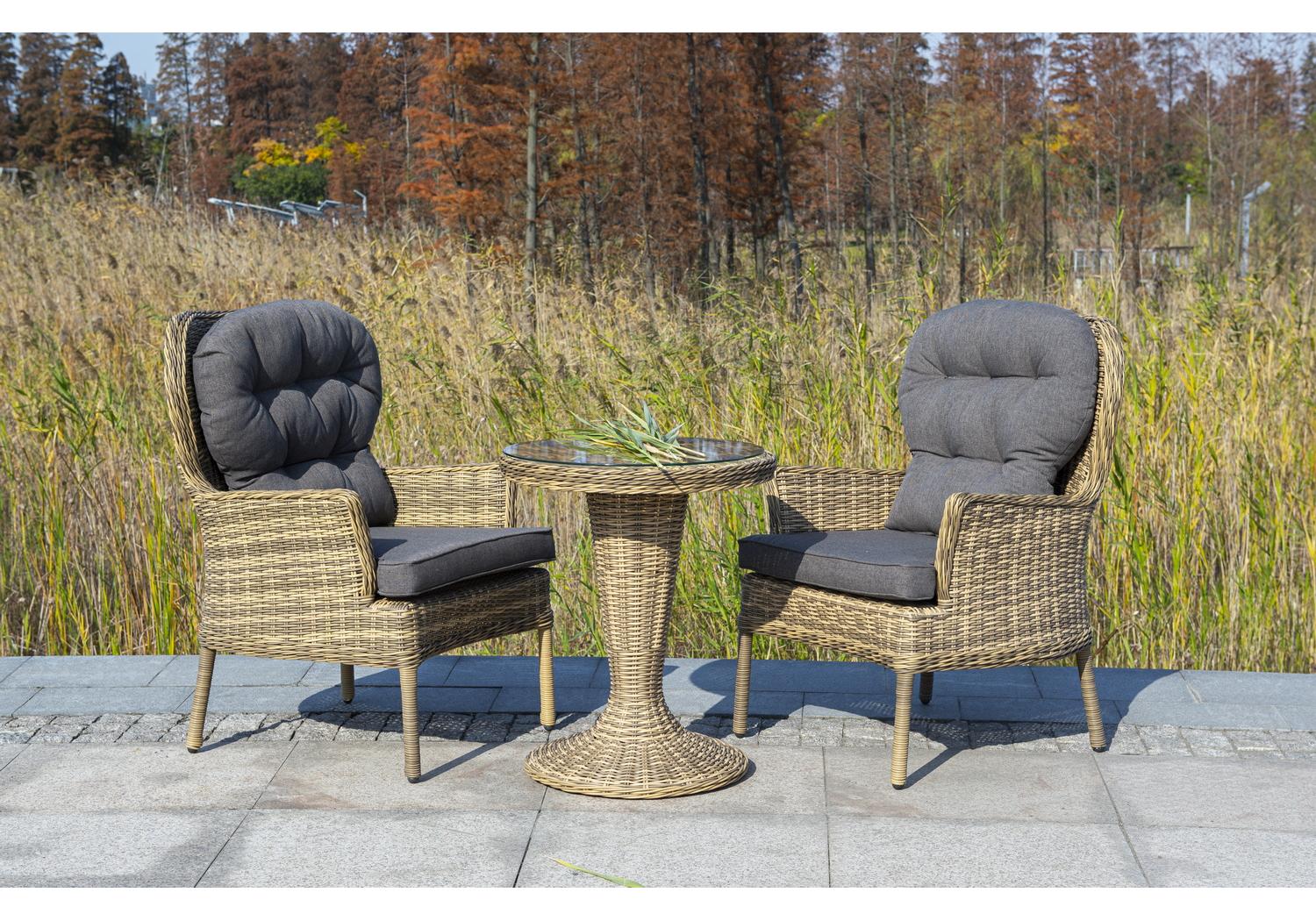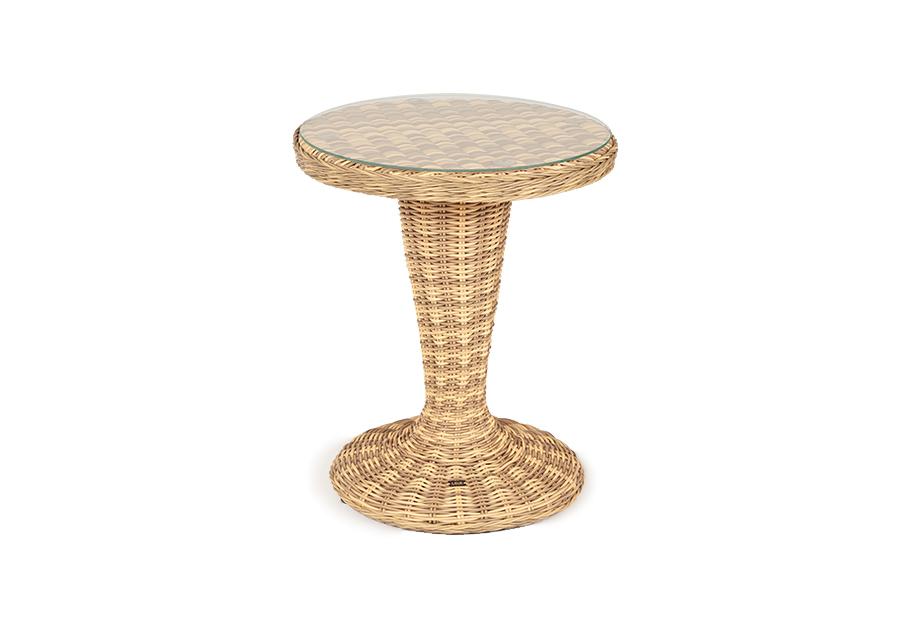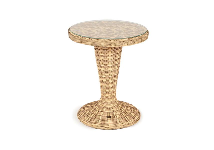 Каркас изготовлен из легкого алюминия и оплетен искусственным ротангом натурального соломенного оттенка. Поверхность столика дополнена стеклянной столешницей из закаленного стекла, толщиной 5 мм.