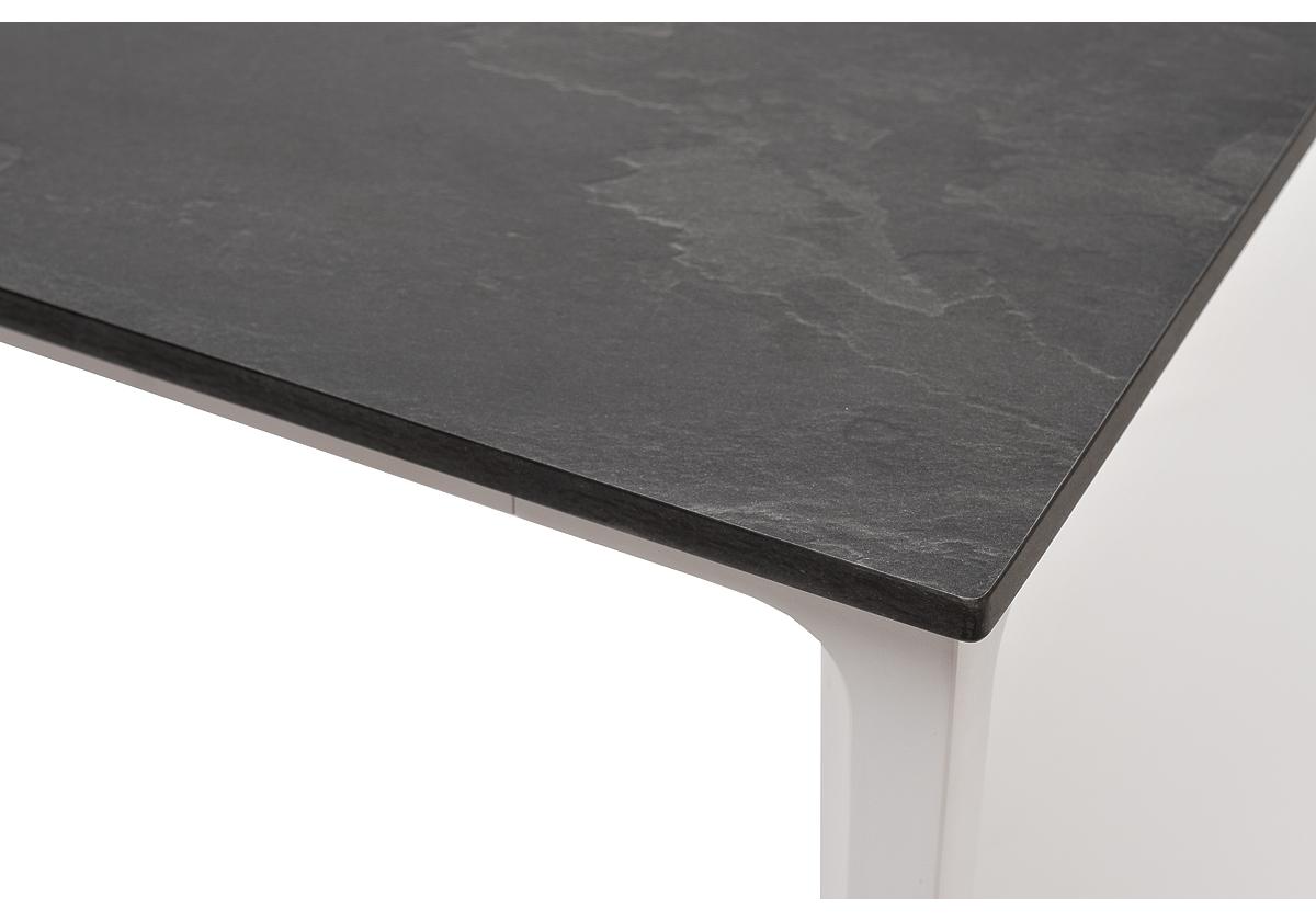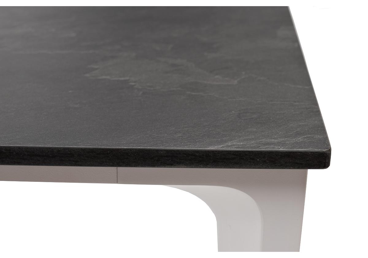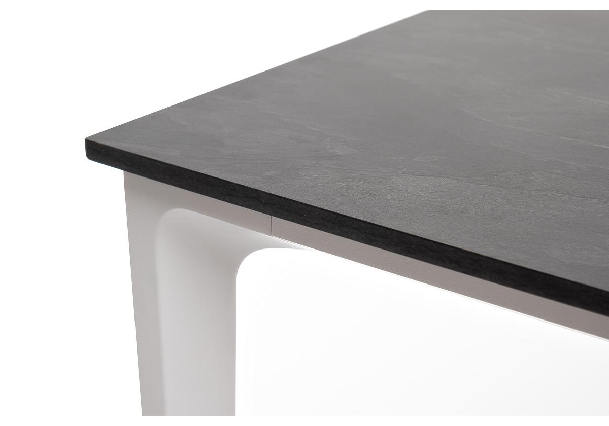 Столешница выполнена из современного высококачественного монолитного компакт-пластик HPL, толщиной 12 мм в цвете «серый гранит». Материал устойчив к высоким температурам, попаданию влаги и может использоваться при любых погодных условиях. Подстолье изготовлено из крашеного алюминия белого цвета.