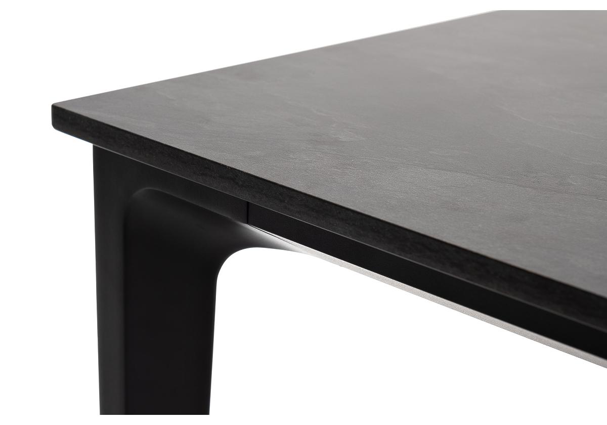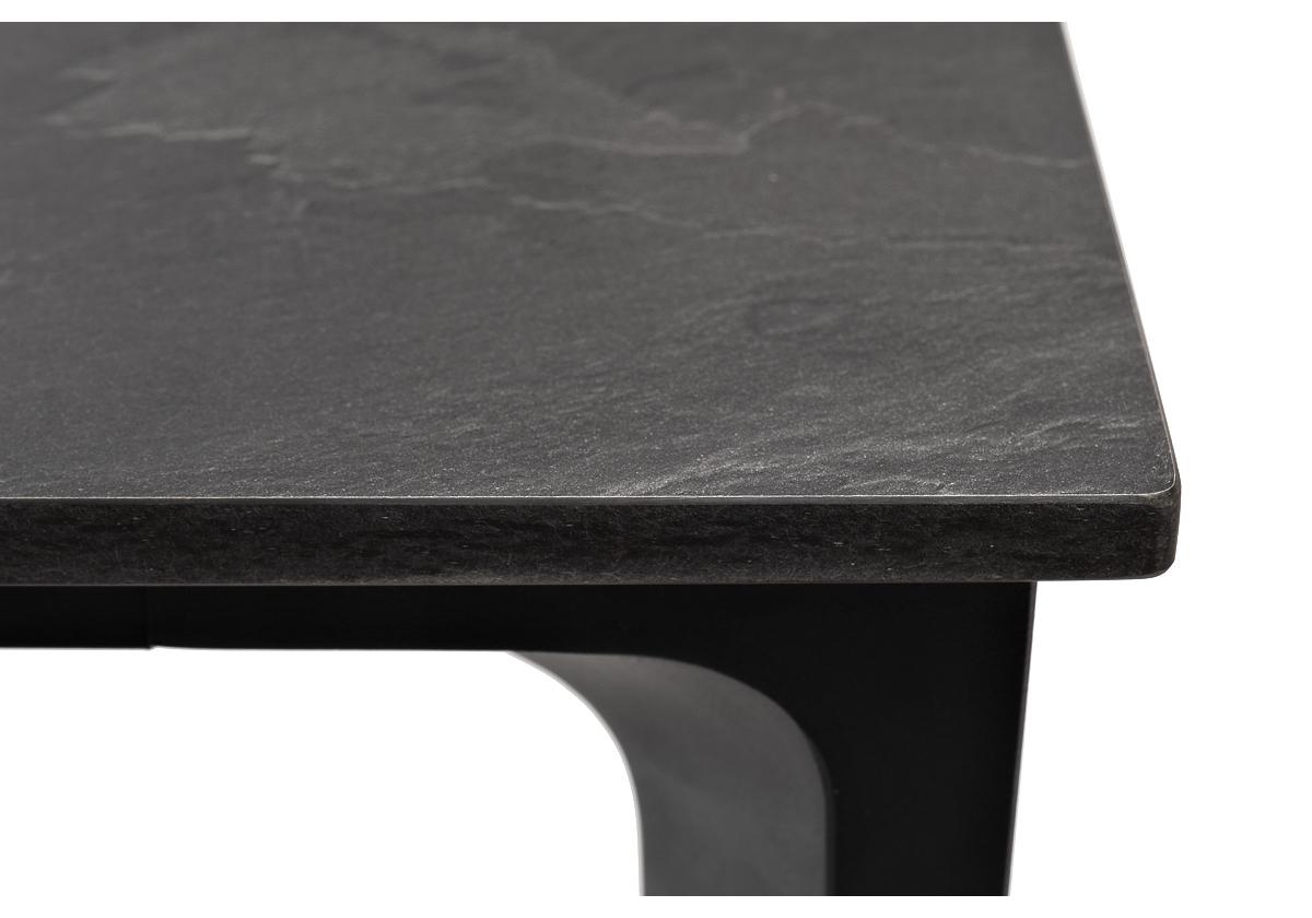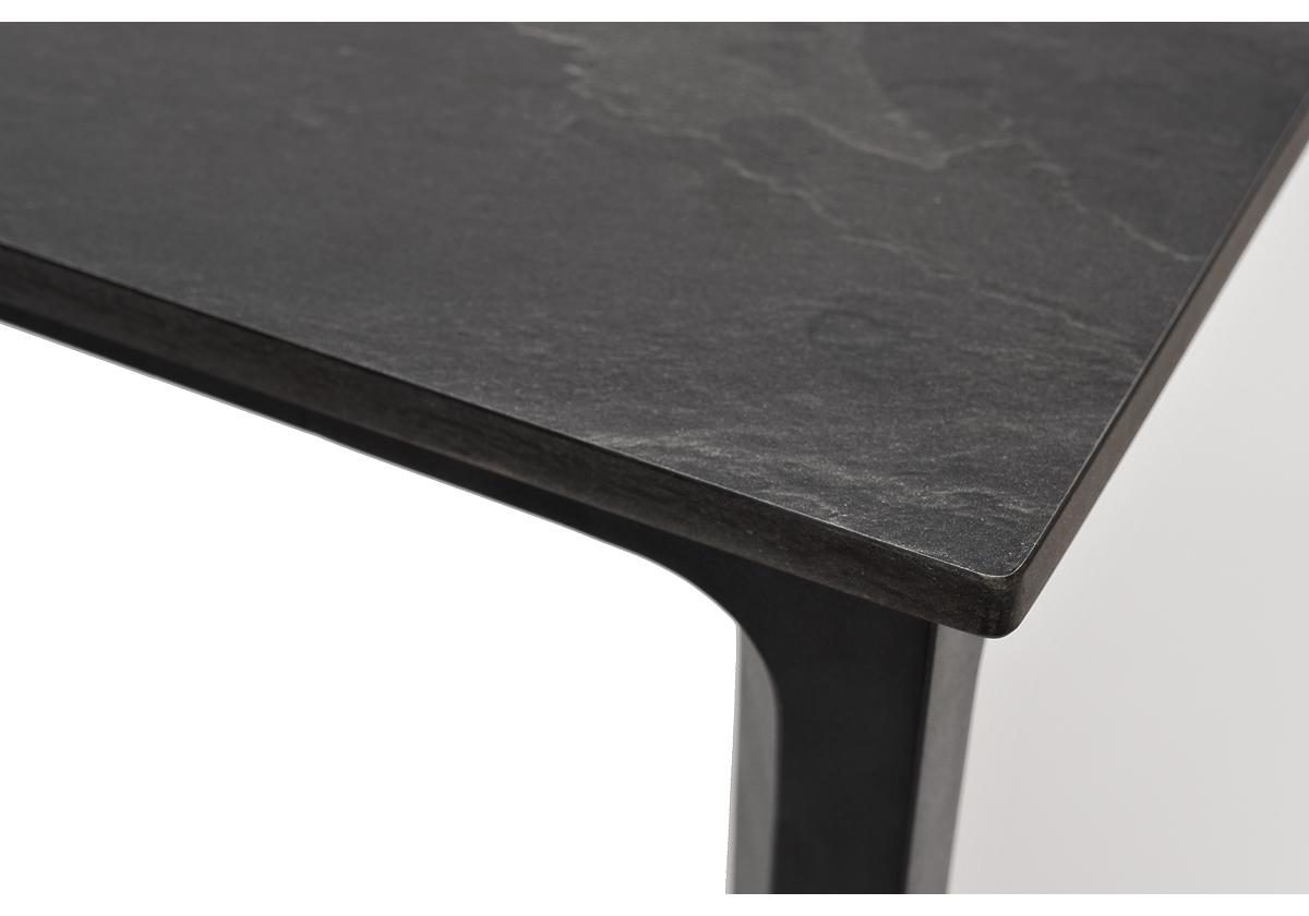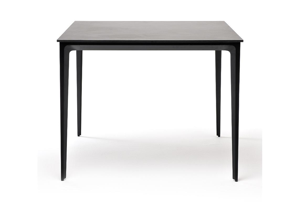 Столешница выполнена из современного высококачественного монолитного компакт-пластик HPL, толщиной 12 мм в цвете «серый гранит». Материал устойчив к высоким температурам, попаданию влаги и может использоваться при любых погодных условиях. Подстолье изготовлено из крашеного алюминия черного цвета.